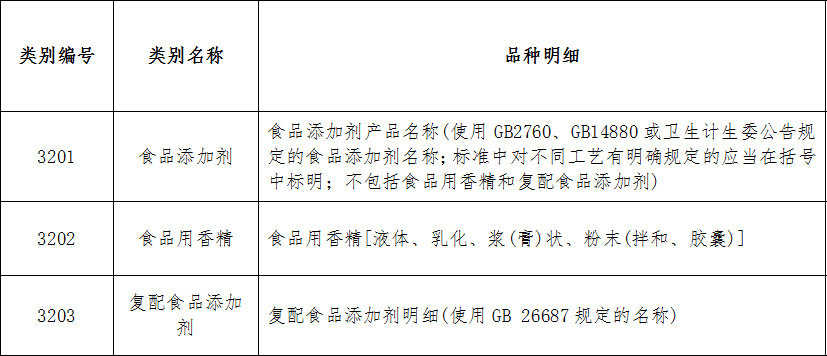 食品添加劑類別編號(hào)及名稱:3201食品添加劑;3202食品用香精;3203復(fù)配食品添加劑