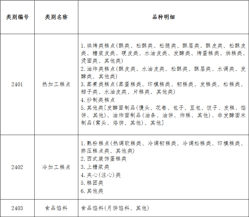 糕點(diǎn)類別編號(hào)及類別名稱:2401熱加工糕點(diǎn);2402冷加工糕點(diǎn);2403食品餡料
