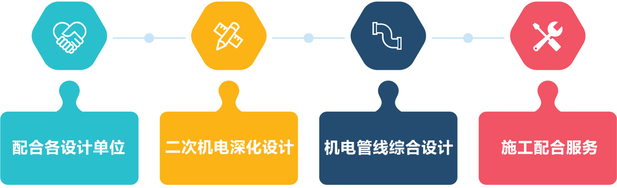 二次設(shè)計(jì)包括:配合各設(shè)計(jì)單位、二次機(jī)電深化設(shè)計(jì)、機(jī)電管線綜合設(shè)計(jì)、施工配合服務(wù)