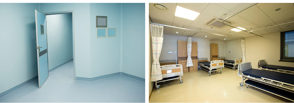 裝修要求不產(chǎn)塵、不積塵、耐腐蝕、防潮、防霉、防火、易清潔。色彩要溫和、淡雅,可為淡綠色、淡黃色。綠色與血液的紅色互為補色,能減輕醫(yī)護人員用眼疲勞,并對患者心理有平靜作用。黃色有平衡情緒低落作用,避免與綠色墻面趨同。