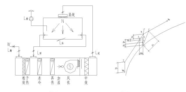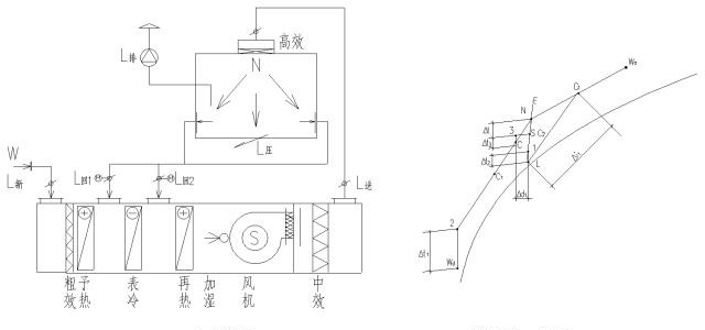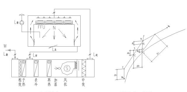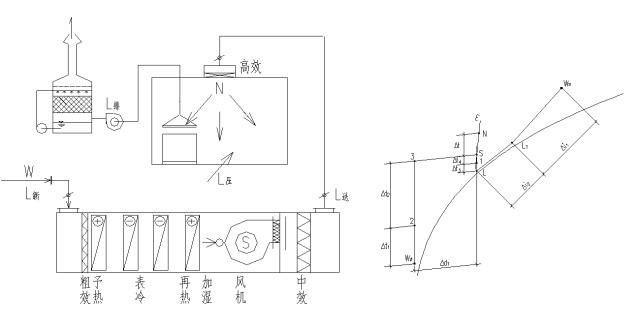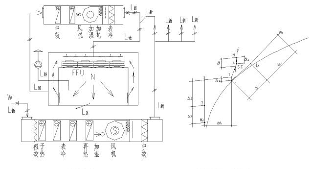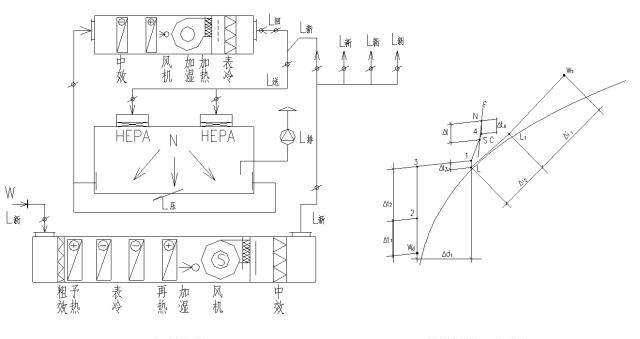 為了節(jié)能、消除空氣熱濕處理過程中的冷熱相互抵消,在潔凈室凈化送風(fēng)量大于消除余熱、余濕的空調(diào)送風(fēng)量時(shí),最好采用一、二次回風(fēng)方案,將二次混合點(diǎn)設(shè)計(jì)在系統(tǒng)送風(fēng)點(diǎn)上,該方是最節(jié)能、最經(jīng)濟(jì)的送風(fēng)方案。其原理圖和焓濕圖如下: