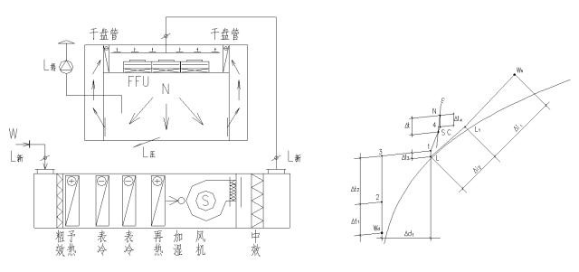 一次回風(fēng)的送風(fēng)方案多用在潔凈室內(nèi)的發(fā)熱量或產(chǎn)濕量很大,消除室內(nèi)余熱或余濕的送風(fēng)量大于或等于凈化送風(fēng)量的低潔凈度等級的非單向流潔凈室中。此方案的原理圖和焓濕圖如下:
