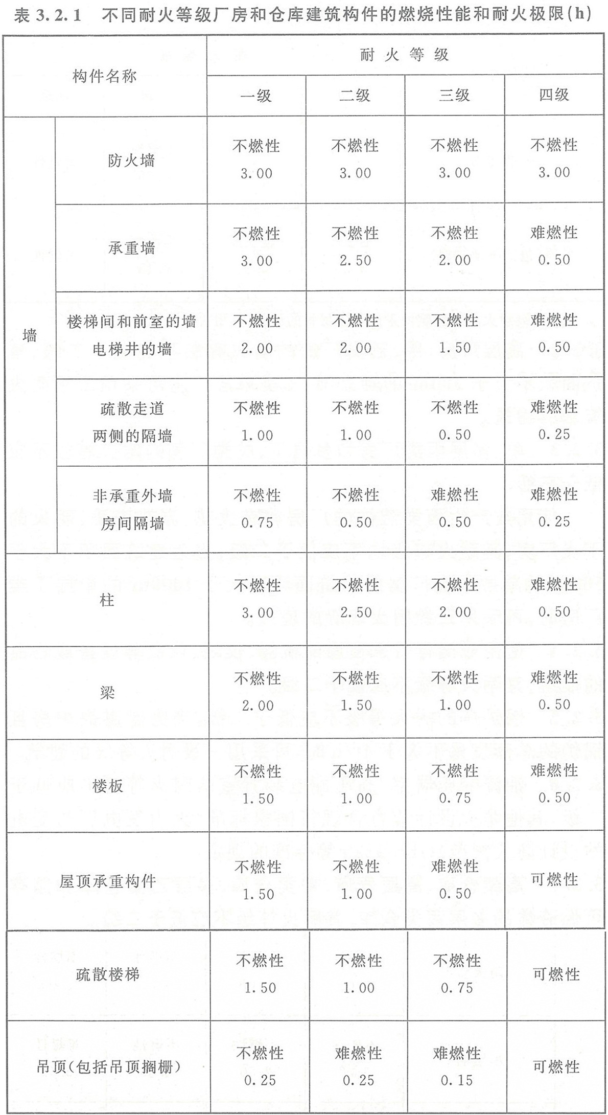 3.2.1 本條規(guī)定了廠房和倉庫的耐火等級分級及相應(yīng)建筑構(gòu)件的燃燒性能和耐火極限。
