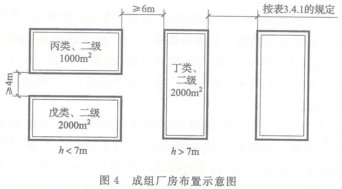 3.4.8 除高層廠房和甲類(lèi)廠房外,其他類(lèi)別的數(shù)座廠房占地面積之和小于本規(guī)范第3.3.1條規(guī)定的防火分區(qū)最大允許建筑面積(按其中較小者確定,但防火分區(qū)的最大允許建筑面積不限者,不應(yīng)大于10000m2)時(shí),可成組布置。當(dāng)廠房建筑高度不大于7m時(shí),組內(nèi)廠房之間的防火間距不應(yīng)小于4m;當(dāng)廠房建筑高度大于7m時(shí),組內(nèi)廠房之間的防火間距不應(yīng)小于6m。
