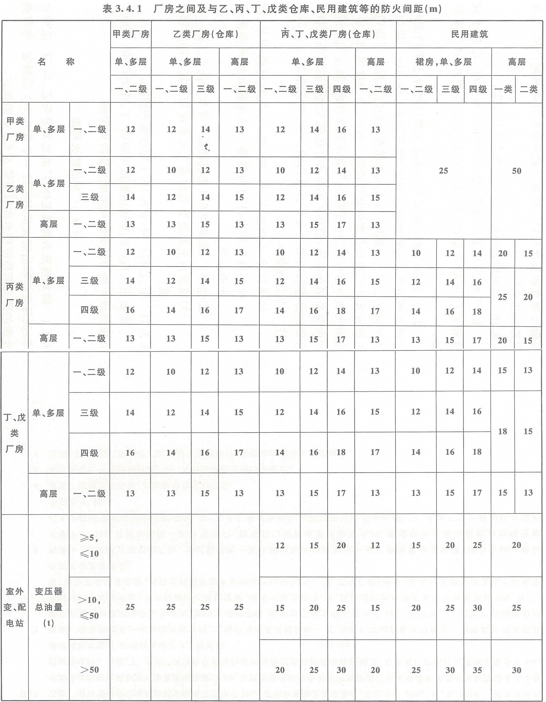 3.4.1 除本規(guī)范另有規(guī)定外,廠房之間及與乙、丙、丁、戊類(lèi)倉(cāng)庫(kù)、民用建筑等的防火間距不應(yīng)小于表3.4.1的規(guī)定,與甲類(lèi)倉(cāng)庫(kù)的防火間距應(yīng)符合本規(guī)范第3.5.1條的規(guī)定。