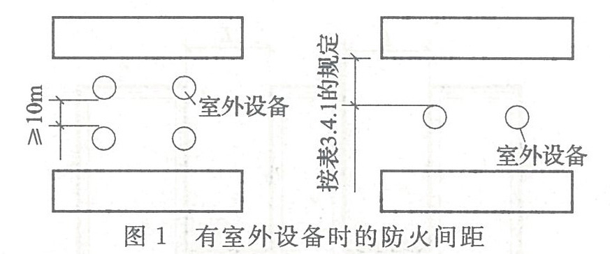 3.4.6 廠房外附設(shè)化學(xué)易燃物品的設(shè)備,其外壁與相鄰廠房室外附設(shè)設(shè)備的外壁或相鄰廠房外墻的防火間距,不應(yīng)小于本規(guī)范第3.4.1條的規(guī)定。用不燃材料制作的室外設(shè)備,可按一、二級(jí)耐火等級(jí)建筑確定。