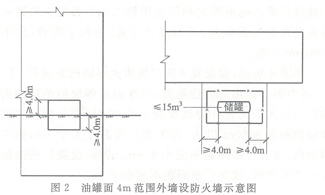 小型可燃液體中間罐常放在廠房外墻附近,為安全起見(jiàn),要求可能受到火災(zāi)作用的部分外墻采用防火墻,并提倡將儲(chǔ)罐直接埋地設(shè)置。條文“面向儲(chǔ)罐一面4.0m范圍內(nèi)的外墻為防火墻”中“4.0m范圍”的含義是指儲(chǔ)罐兩端和上下部各4m范圍,見(jiàn)圖2。