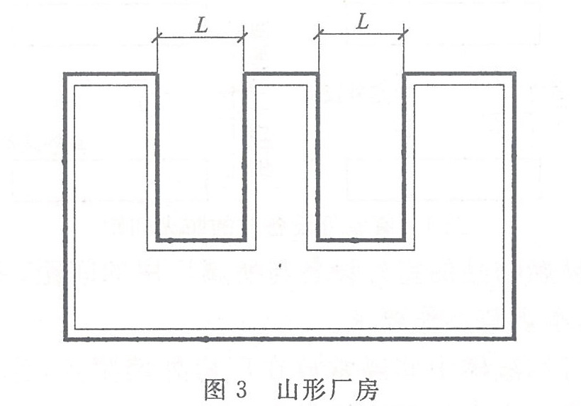 3.4.7 對(duì)于圖3所示的“山形”、“凵形”等類(lèi)似形狀的廠房,建筑的兩翼相當(dāng)于兩座廠房。本條規(guī)定了建筑兩翼之間的防火間距(L),主要為便于滅火救援和控制火勢(shì)蔓延。但整個(gè)廠房的占地面積不大于本規(guī)范第3.3.1條規(guī)定的一個(gè)防火分區(qū)允許最大建筑面積時(shí),該間距L可以減小到6m。