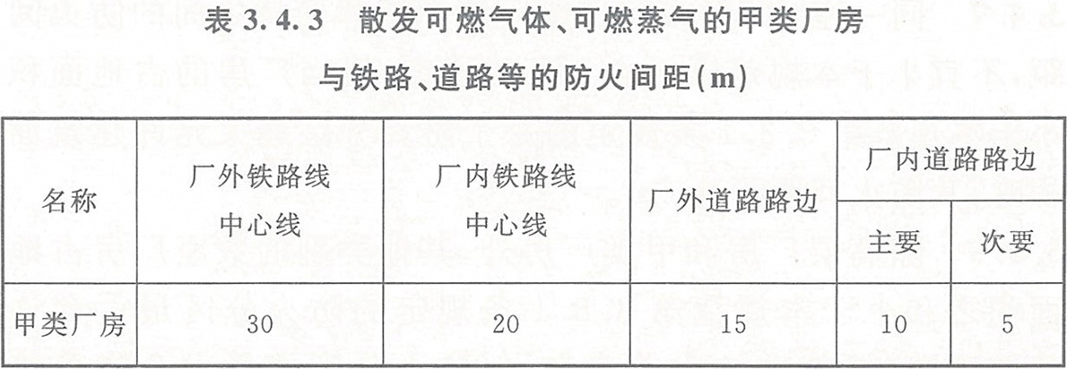 3.4.3 散發(fā)可燃?xì)怏w、可燃蒸氣的甲類(lèi)廠房與鐵路、道路等的防火間距不應(yīng)小于表3.4.3的規(guī)定,但甲類(lèi)廠房所屬?gòu)S內(nèi)鐵路裝卸線當(dāng)有安全措施時(shí),防火間距不受表3.4.3規(guī)定的限制。