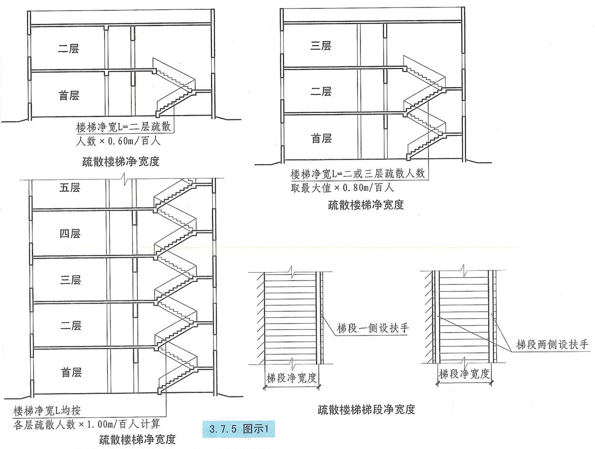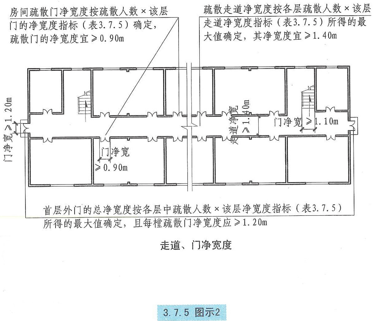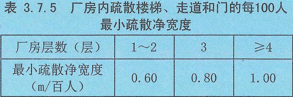 3.7.5 廠房內(nèi)疏散樓梯、走道、門的各自總凈寬度,應(yīng)根據(jù)疏散人數(shù)按每100人的最小疏散凈寬度不小于表3.7.5的規(guī)定計算確定【圖示1】。