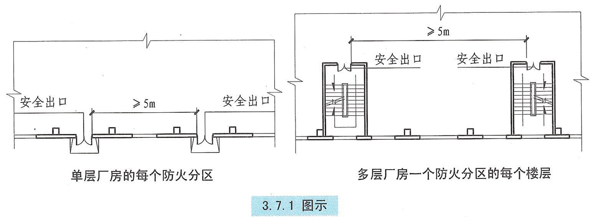 3.7.1 廠房的安全出口應(yīng)分散布置。每個防火分區(qū)或一個防火分區(qū)的每個樓層,其相鄰2個安全出口最近邊緣之間的水平距離不應(yīng)小于5m?!緢D示】