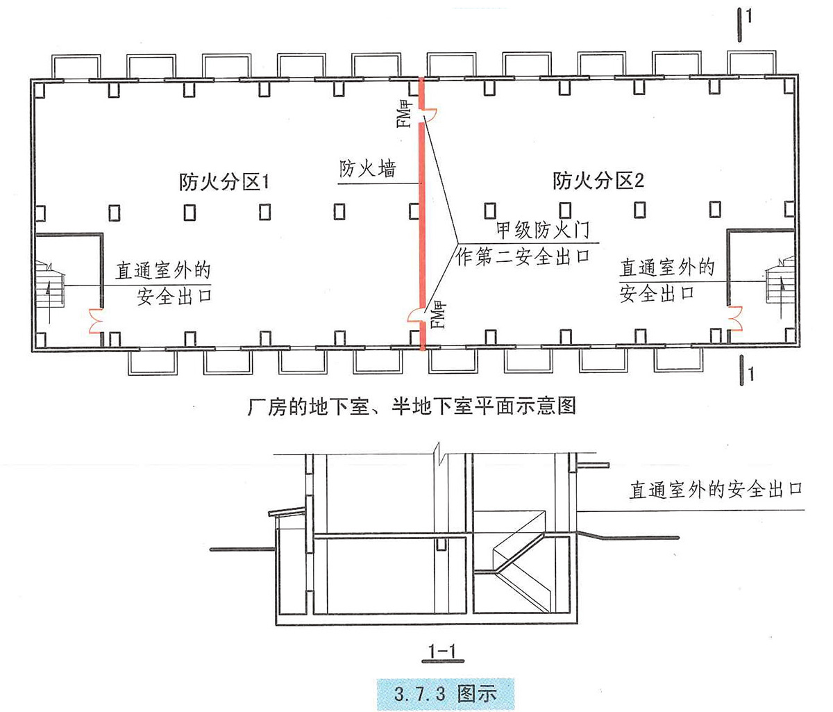 3.7.3 地下或半地下廠房(包括地下或半地下室),當(dāng)有多個防火分區(qū)相鄰布置,并采用防火墻分隔時,每個防火分區(qū)可利用防火墻上通向相鄰防火分區(qū)的甲級防火門作為第二安全出口,但每個防火分區(qū)必須至少有1個直通室外的獨立安全出口?!緢D示】
