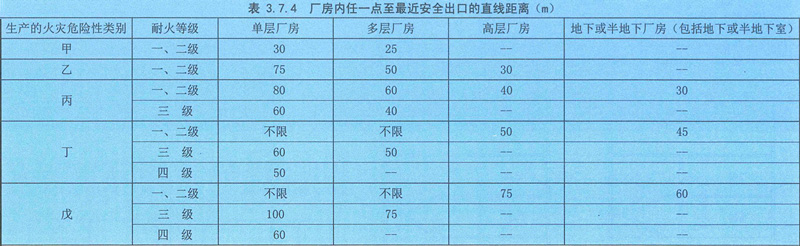 3.7.4 廠房內(nèi)任一點至最近安全出口的直線距離不應(yīng)大于表3.7.4的規(guī)定。