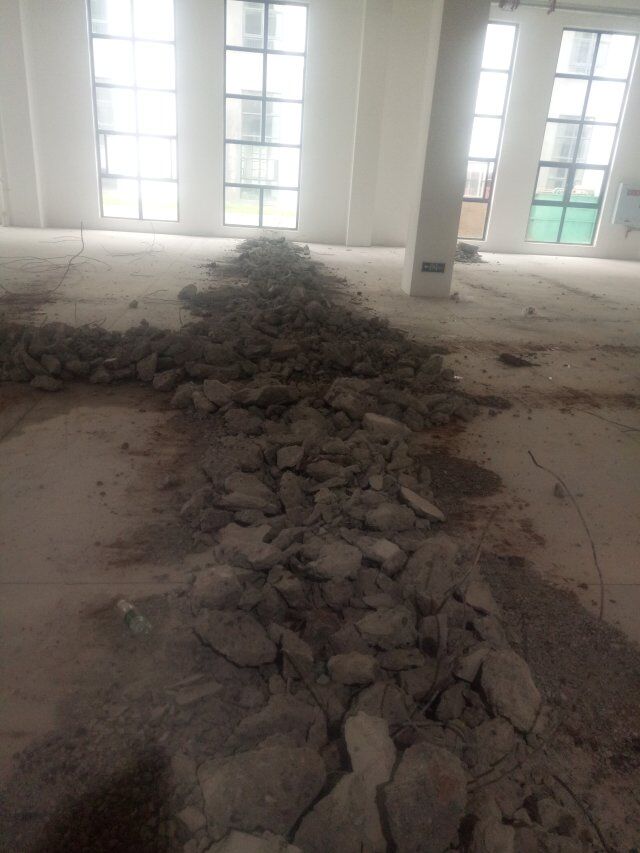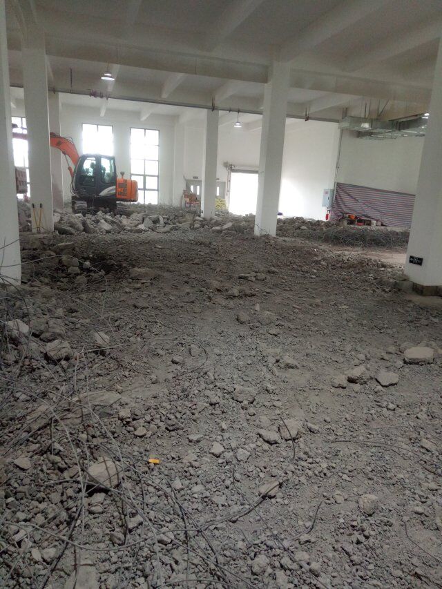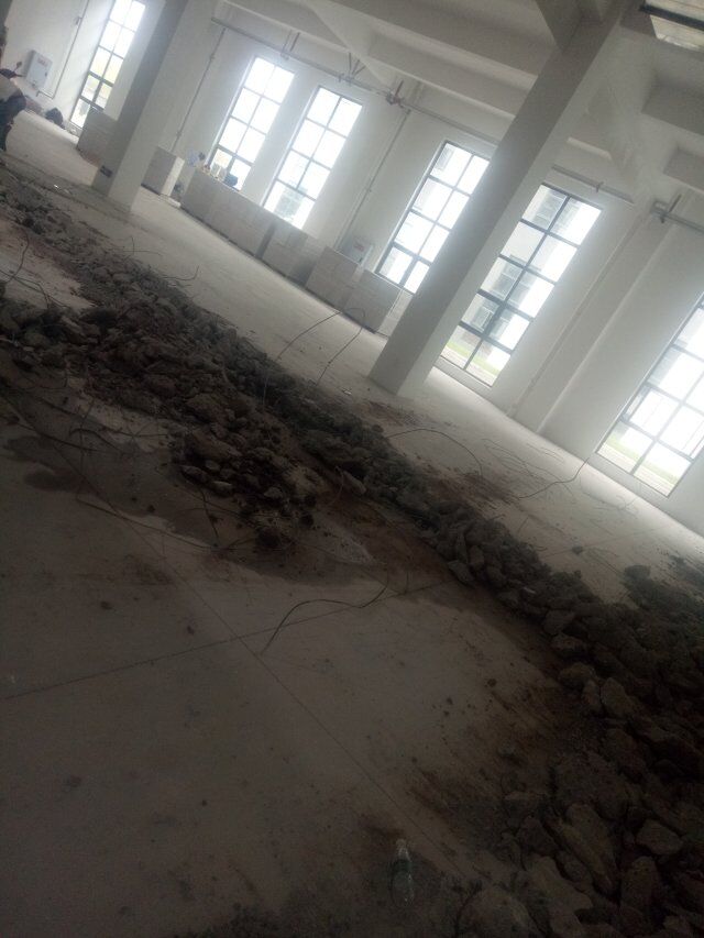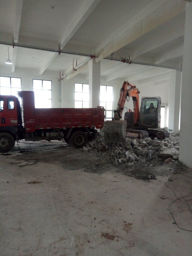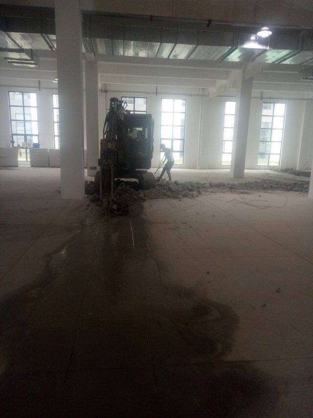 萬康川美食品工程有限公司廠房裝修現(xiàn)場,室內(nèi)排水系統(tǒng)地面破碎完成