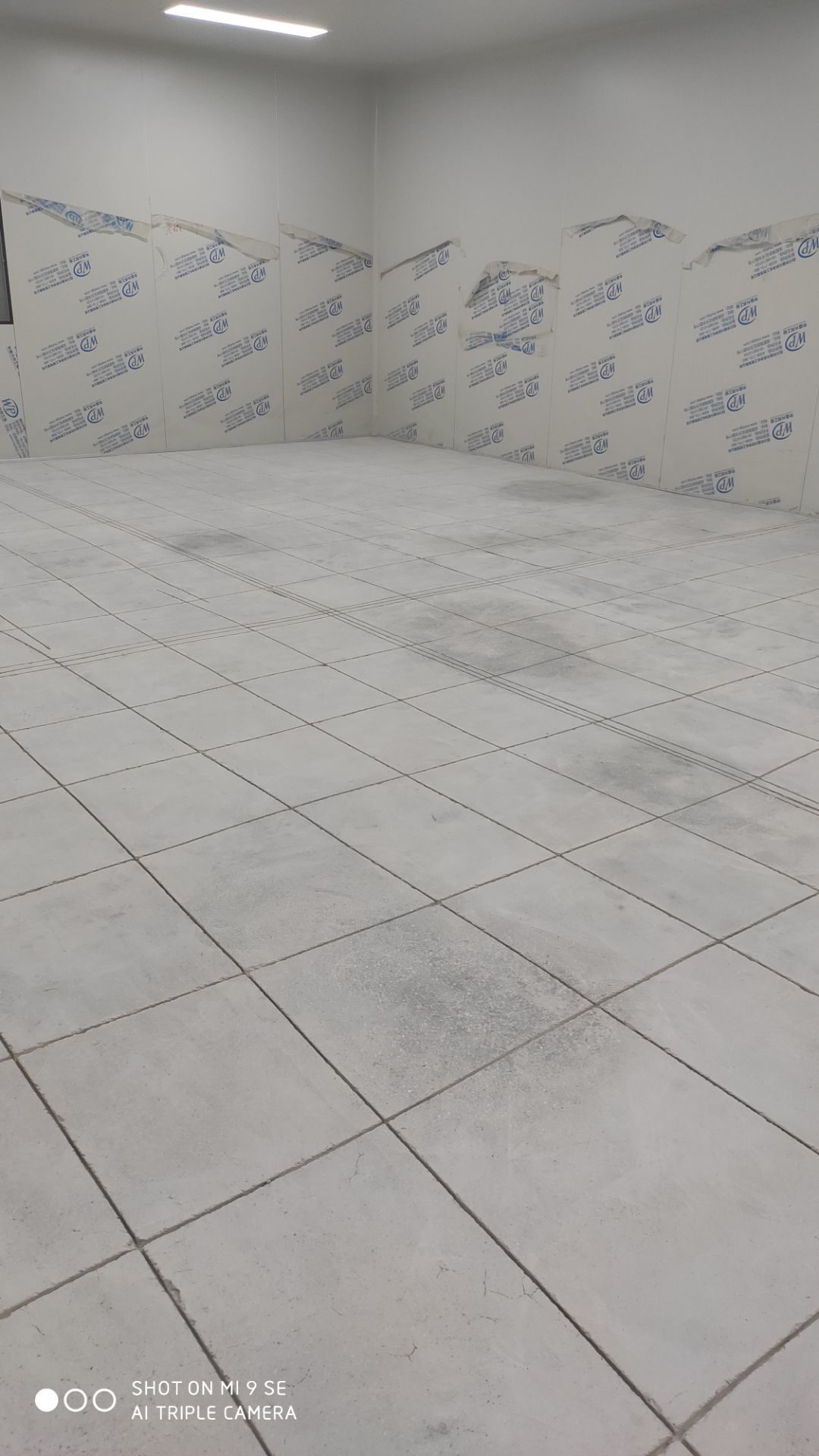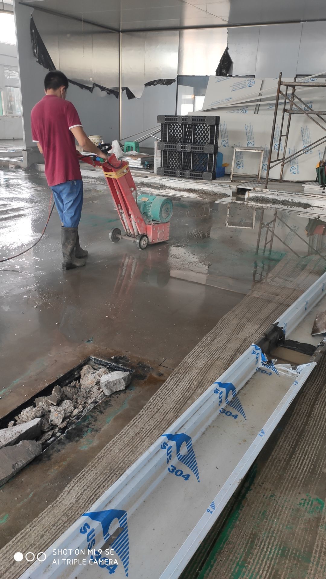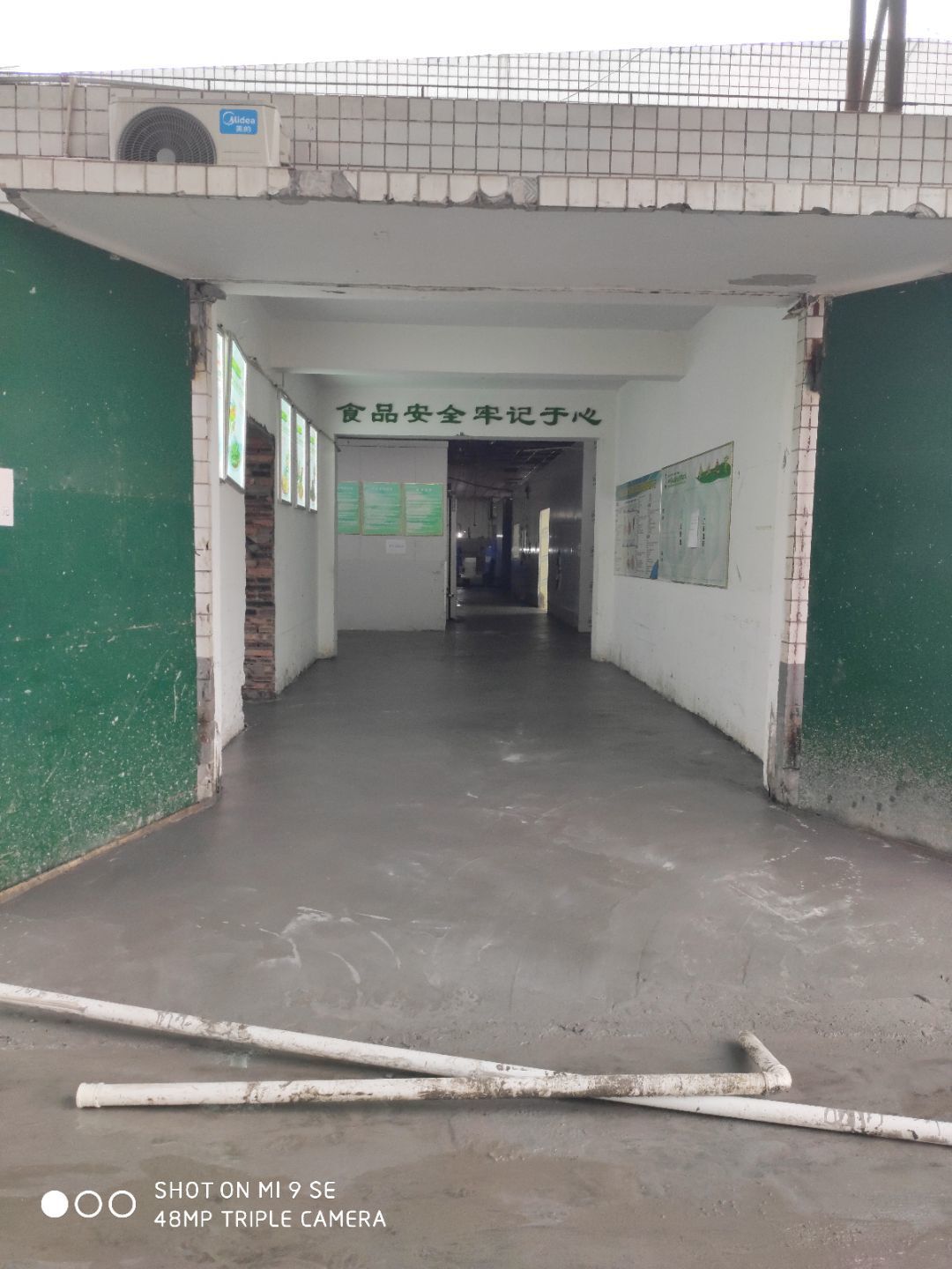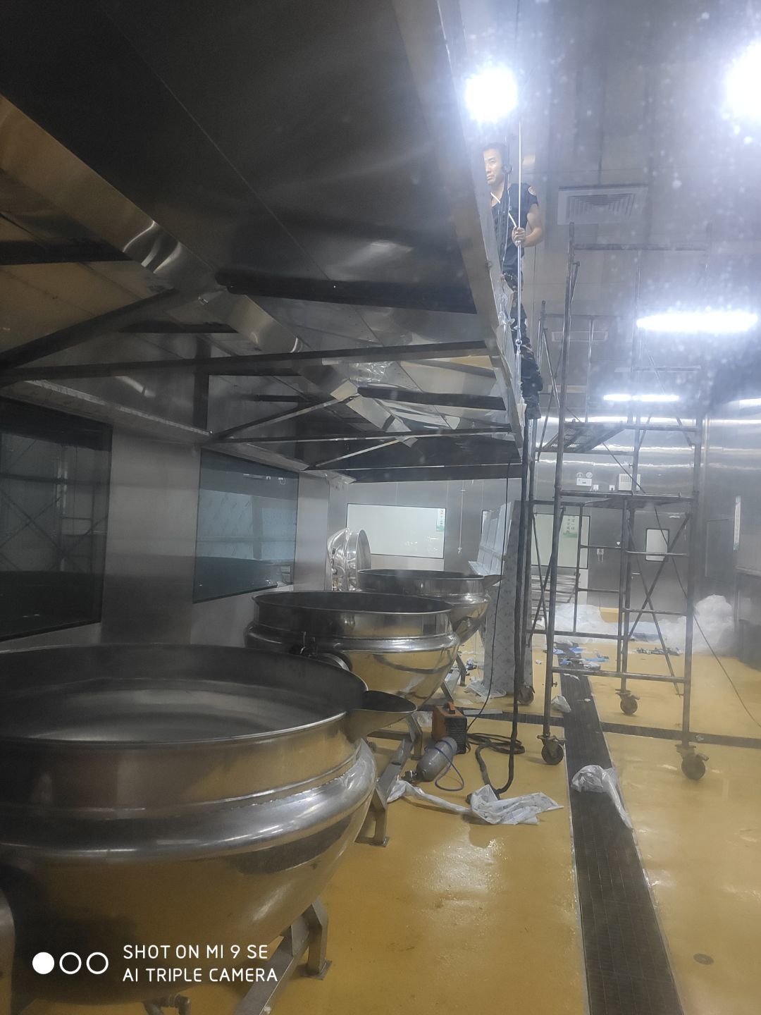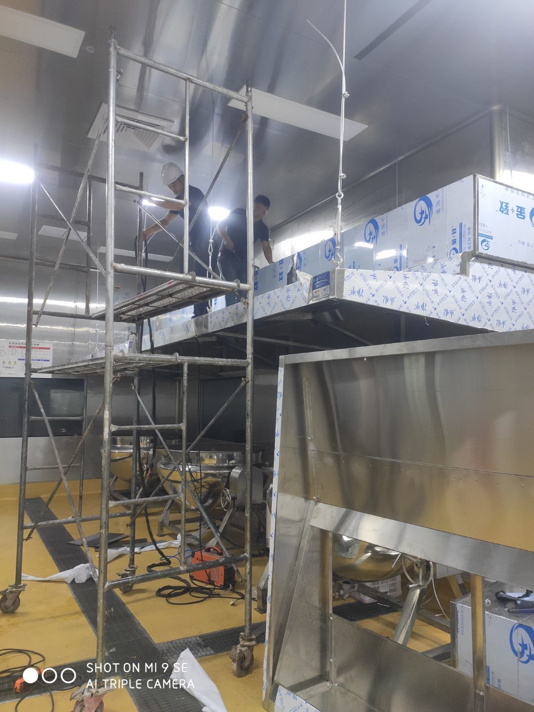 春之源廠房裝修現(xiàn)場(chǎng):1.煙罩安裝完成50% 2.風(fēng)機(jī)風(fēng)柜吊裝完成 3.地坪修補(bǔ)完成