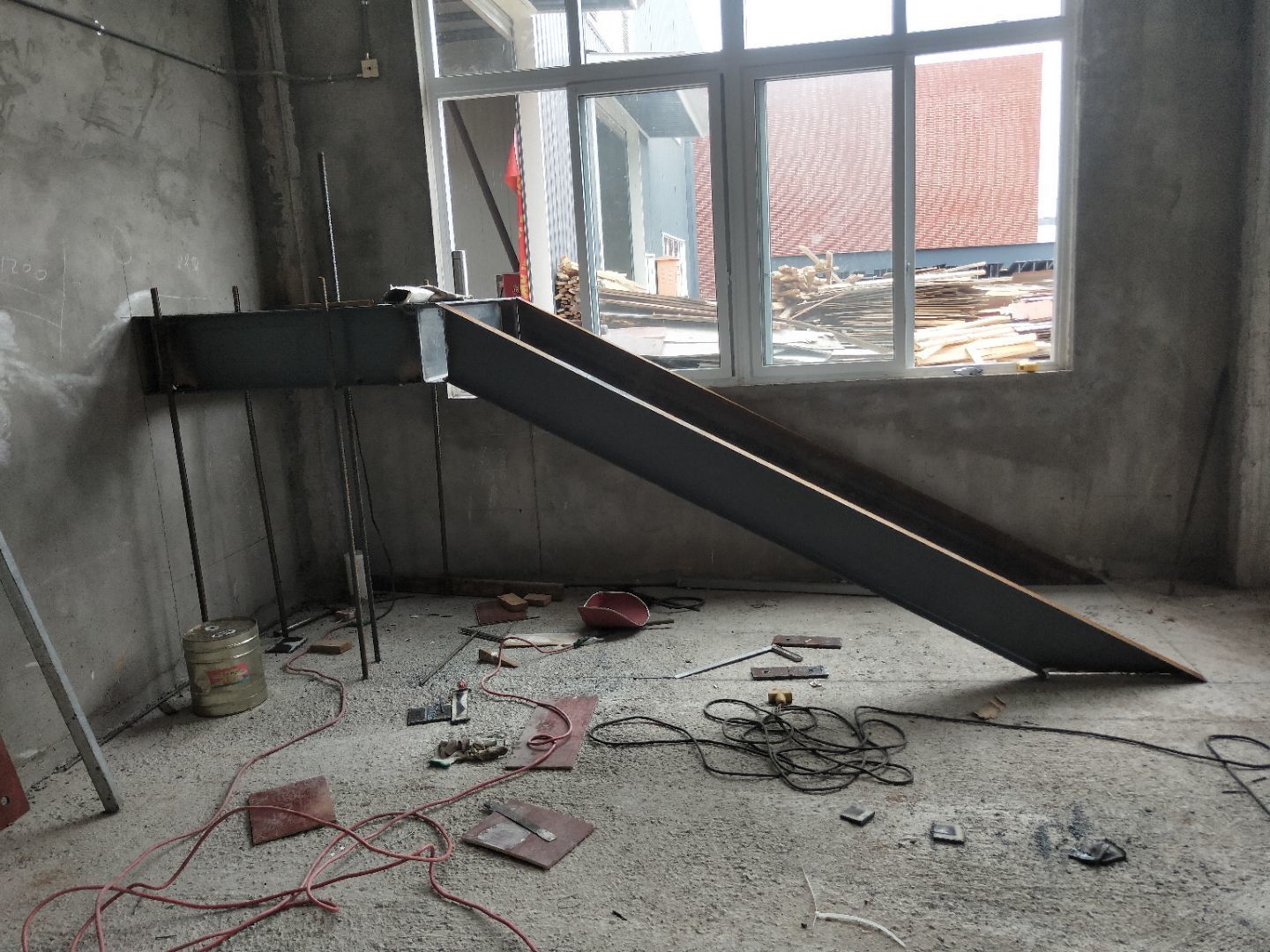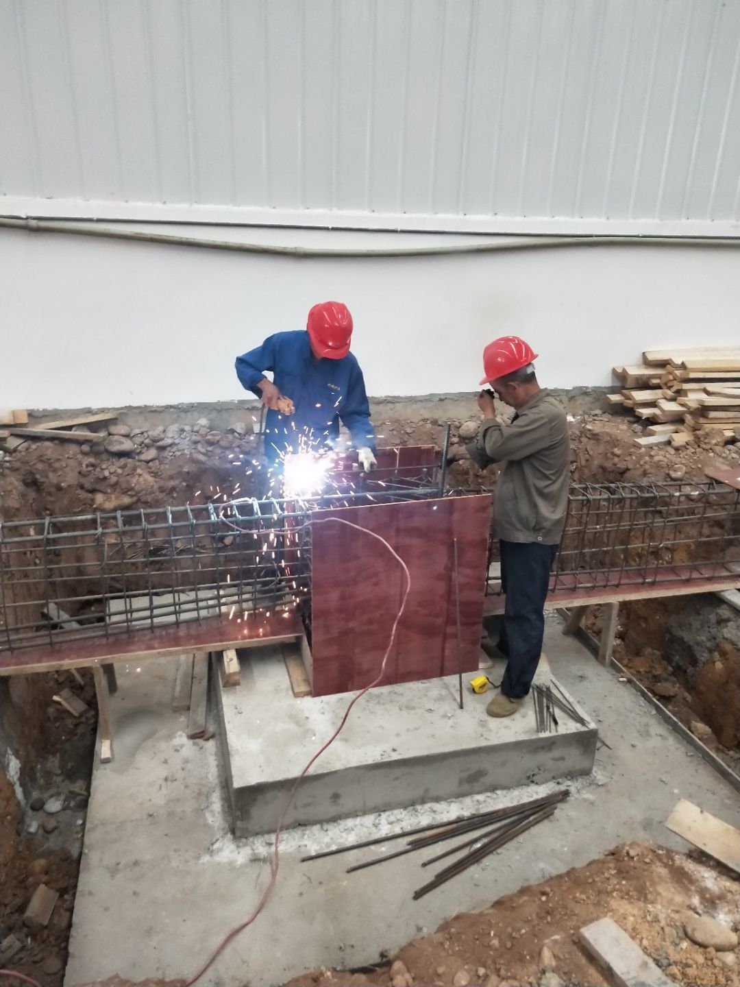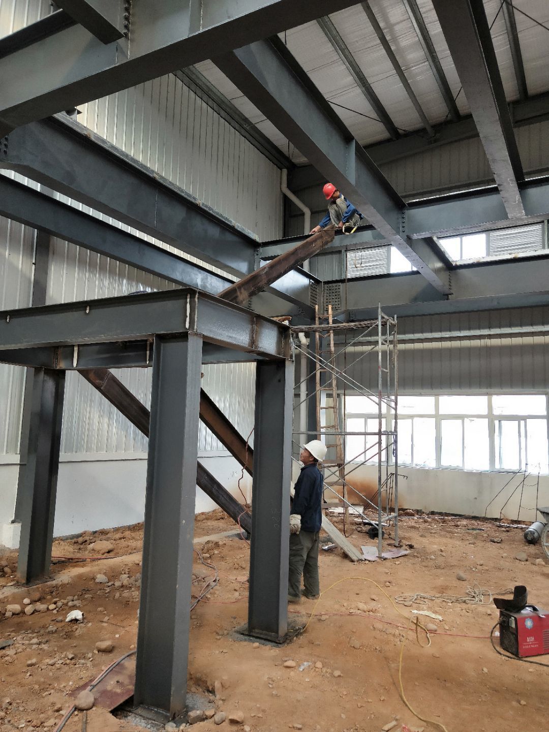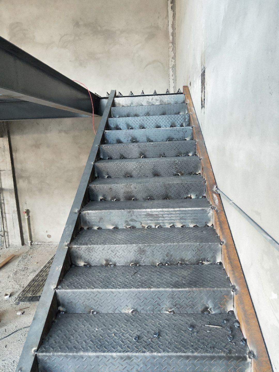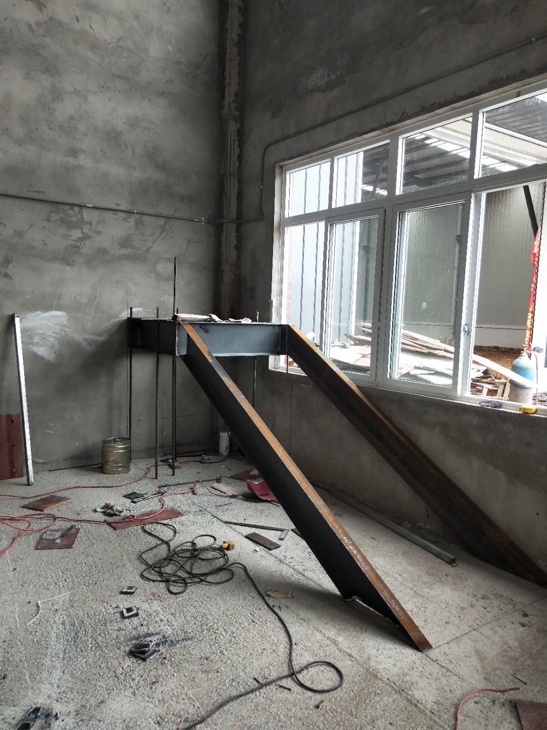 1、柱腳焊接加固 2、樓梯制作,樓板材料到場(chǎng)