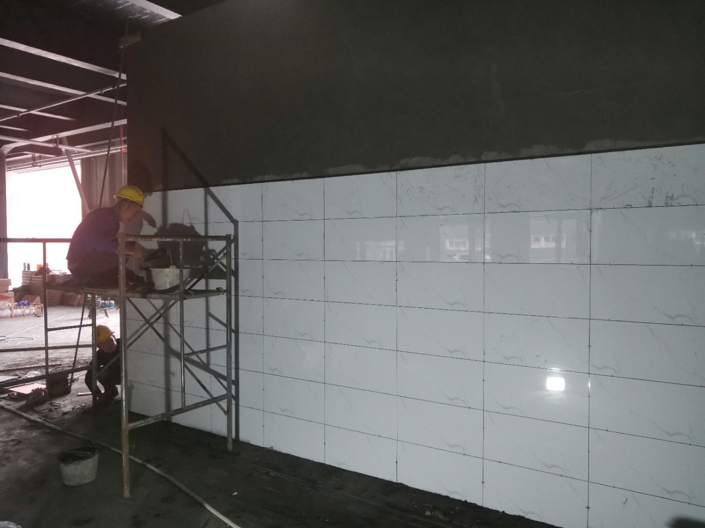 1,衛(wèi)生間外墻貼磚完成75%, 2,二樓擋水墻斜磚收尾,磚縫勾縫完成70%, 3,二樓凈化頂板完成,圓弧打膠完成30%, 4,彩鋼門(mén)預(yù)制安裝完成20%。