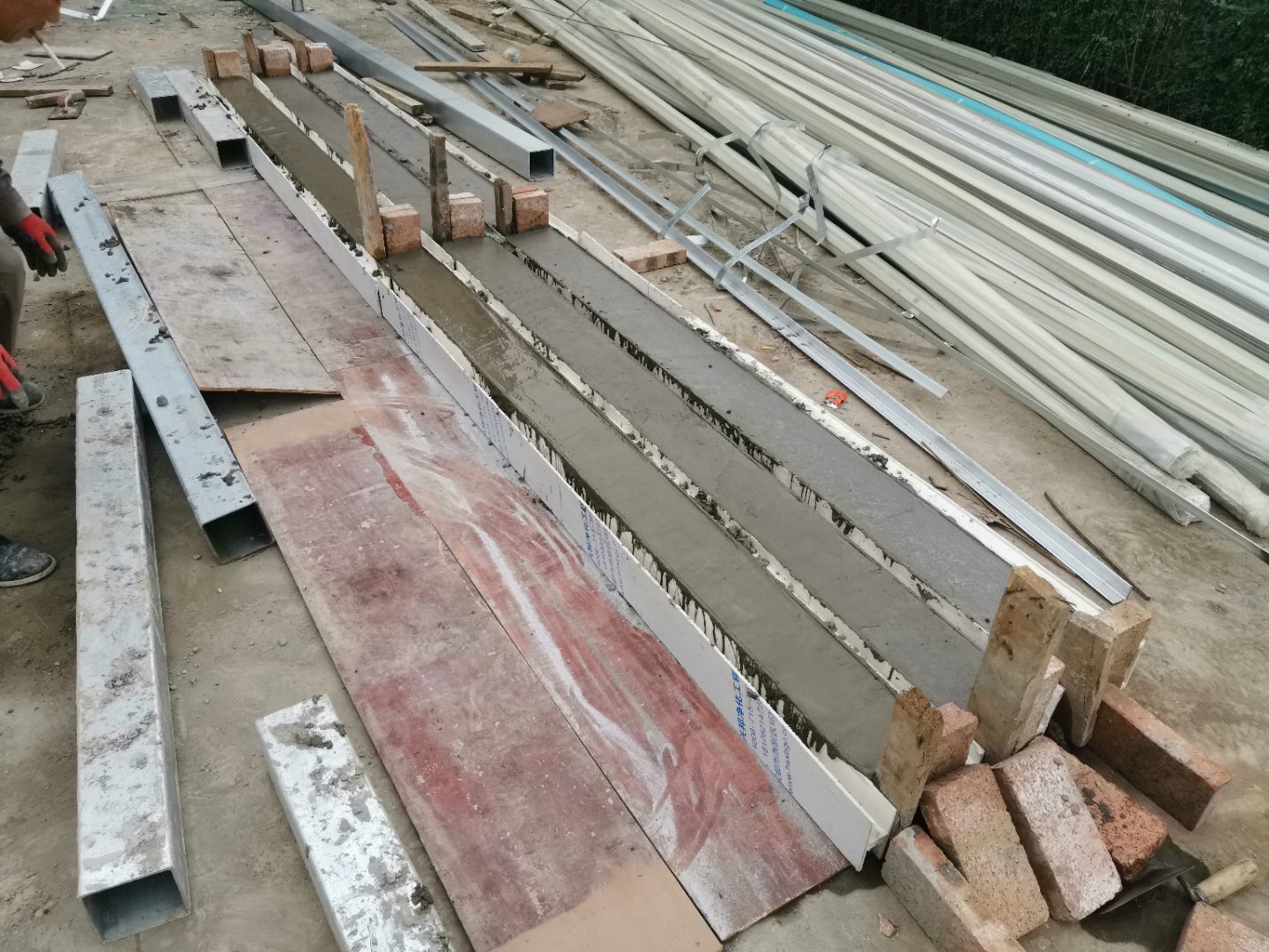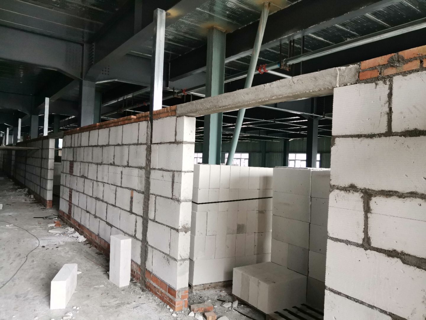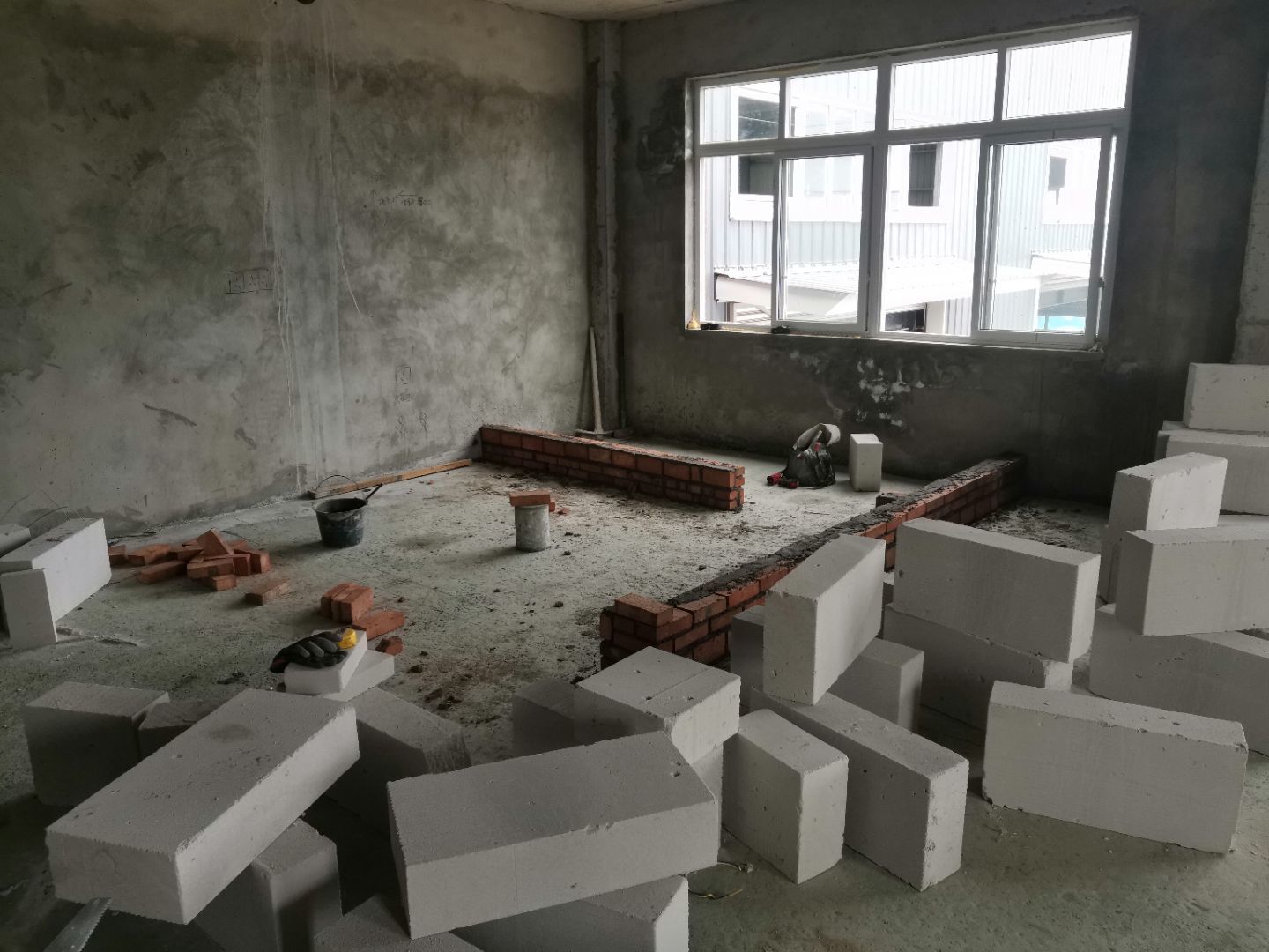 1、加氣塊構(gòu)造柱預(yù)制安裝,完成75%, 2、固化地坪完成, 3、二樓擋水墻磚砌完成25%。