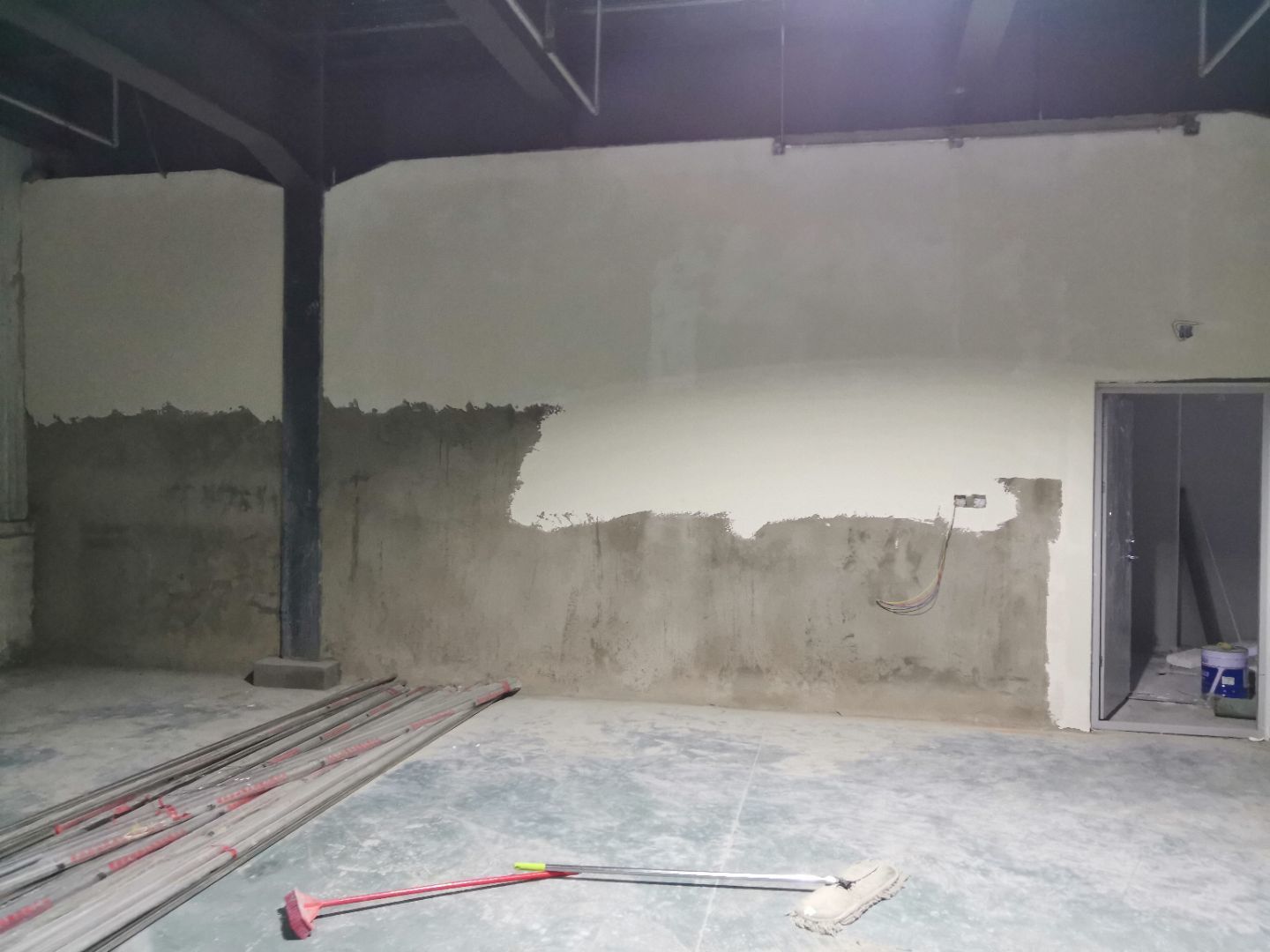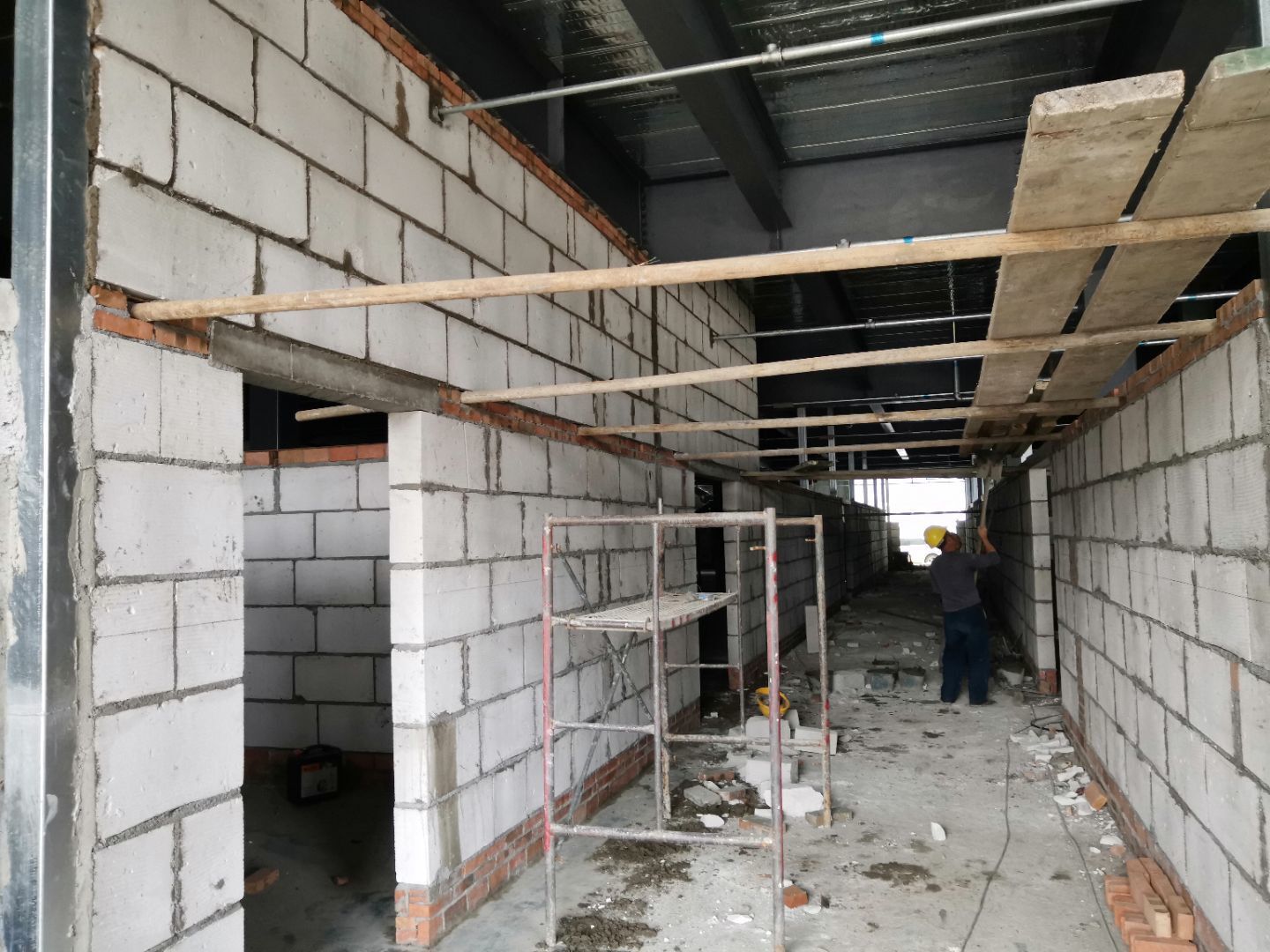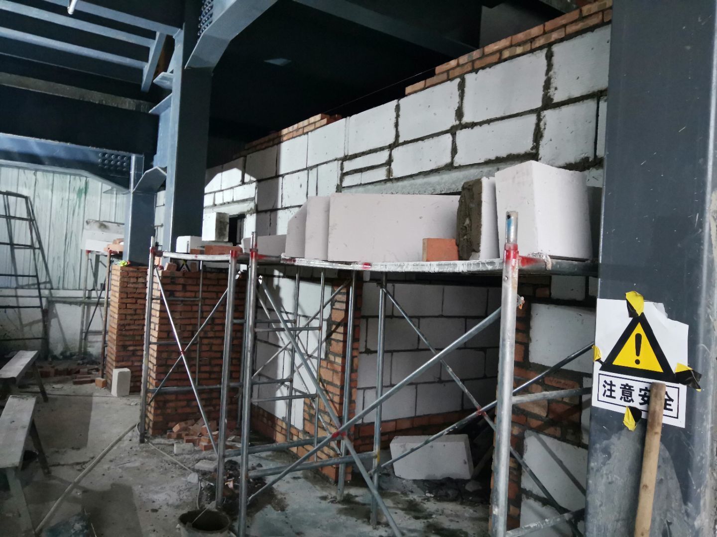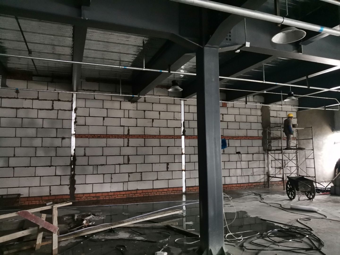 1,一樓抹灰基本完成, 2,二樓加氣塊砌筑完成40%, 3,二樓彩鋼墻板完成70%,頂板完成50%, 4,一樓水電完成90%,二樓完成15%