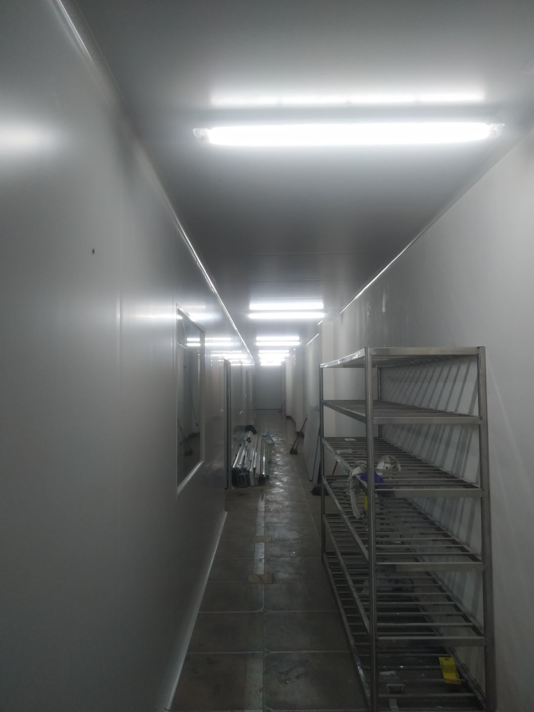 第二車彩鋼到場卸貨完成,全部搬運至車間內部。吊筋安裝完成60%。墻板安裝完成25%。風淋室就位完成。
