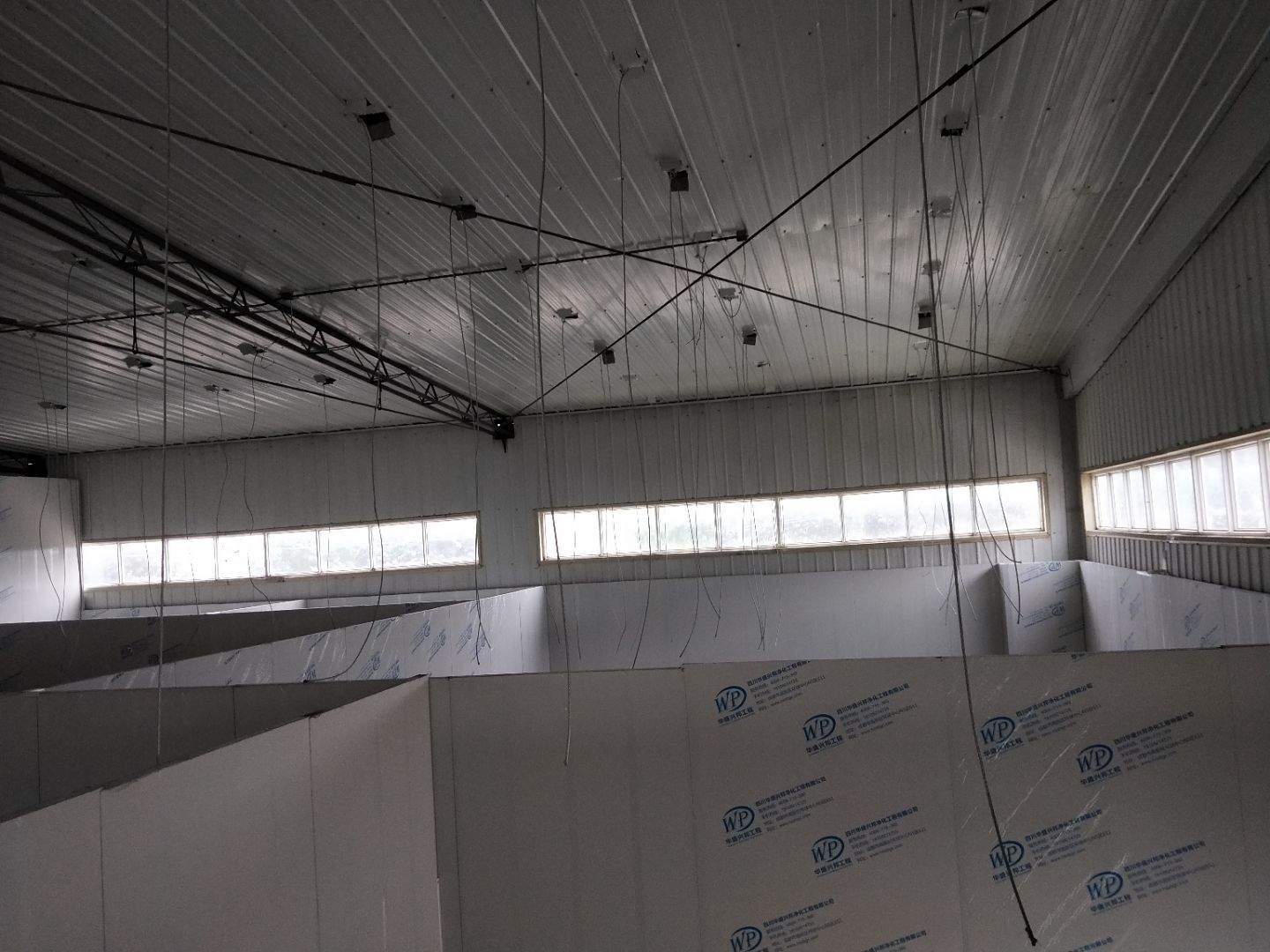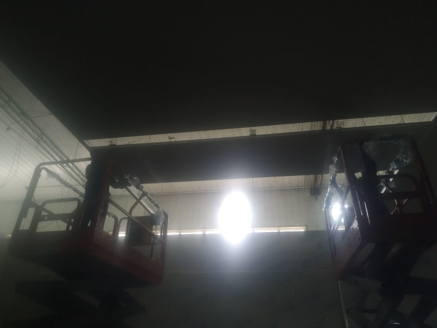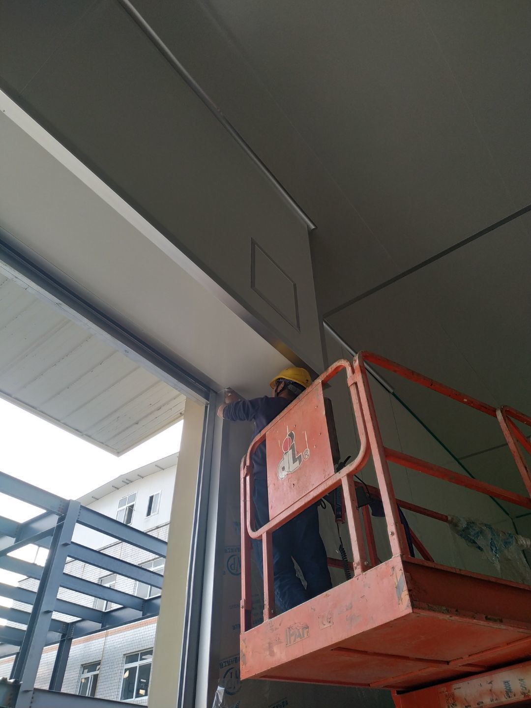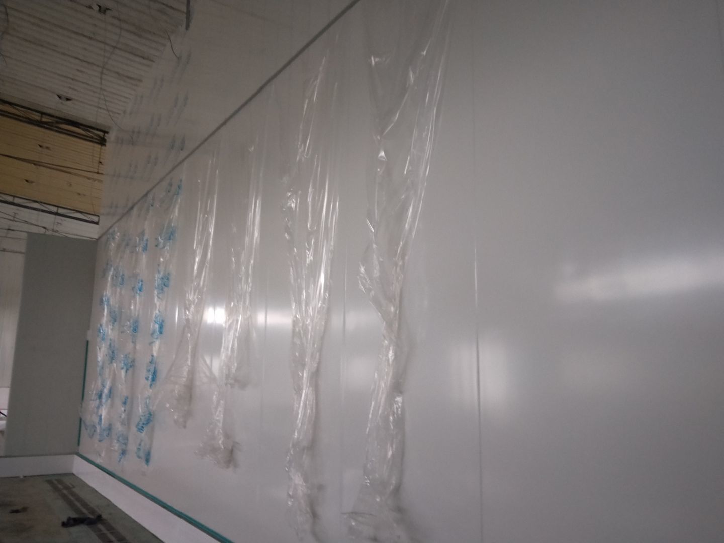 頂板安裝完成95%,新增排水溝安裝完成80%(剩余內(nèi)包材消毒殺菌和地磚同步安裝),燈具安裝完成80%,撕膜打膠完成45%,圓弧安裝35%。室外排水管安裝完成,三防板安裝完成。