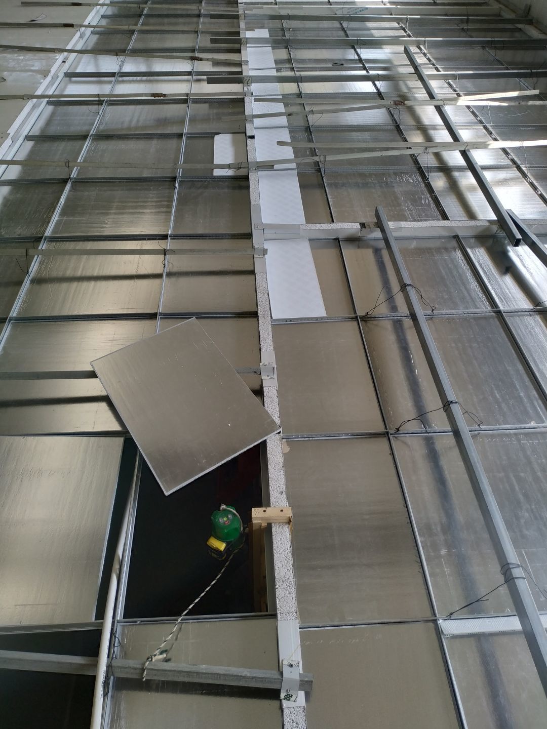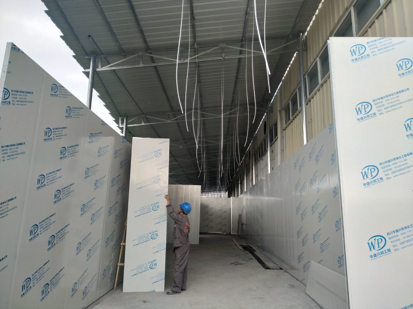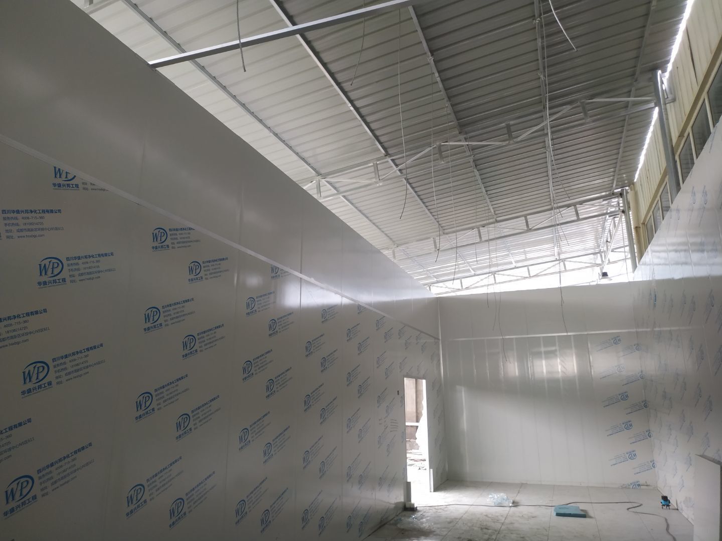 頂板安裝完成95%,新增排水溝安裝完成80%(剩余內(nèi)包材消毒殺菌和地磚同步安裝),燈具安裝完成80%,撕膜打膠完成45%,圓弧安裝35%。室外排水管安裝完成,三防板安裝完成。