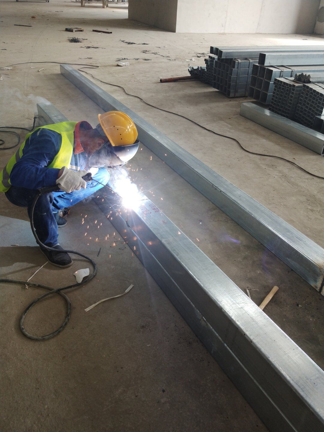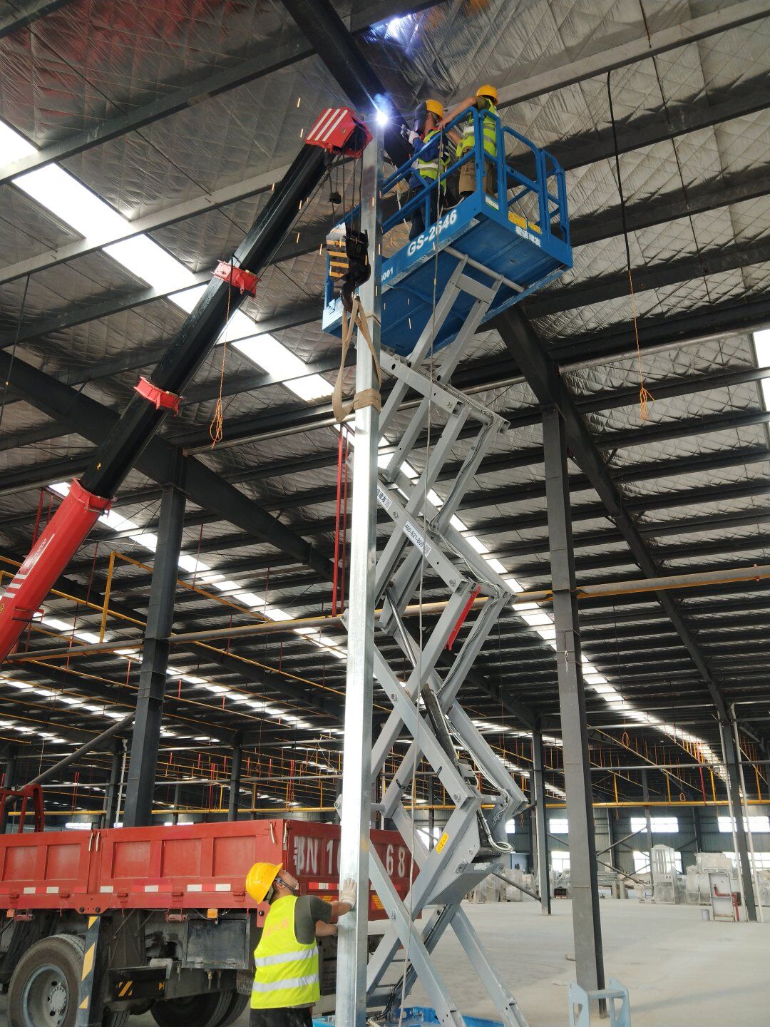 1、二次吊掛鋼構(gòu)立柱放線定位; 2、鋼立柱下料焊接完成,柱腳板安裝完成; 3、臨電布設(shè)完成。
