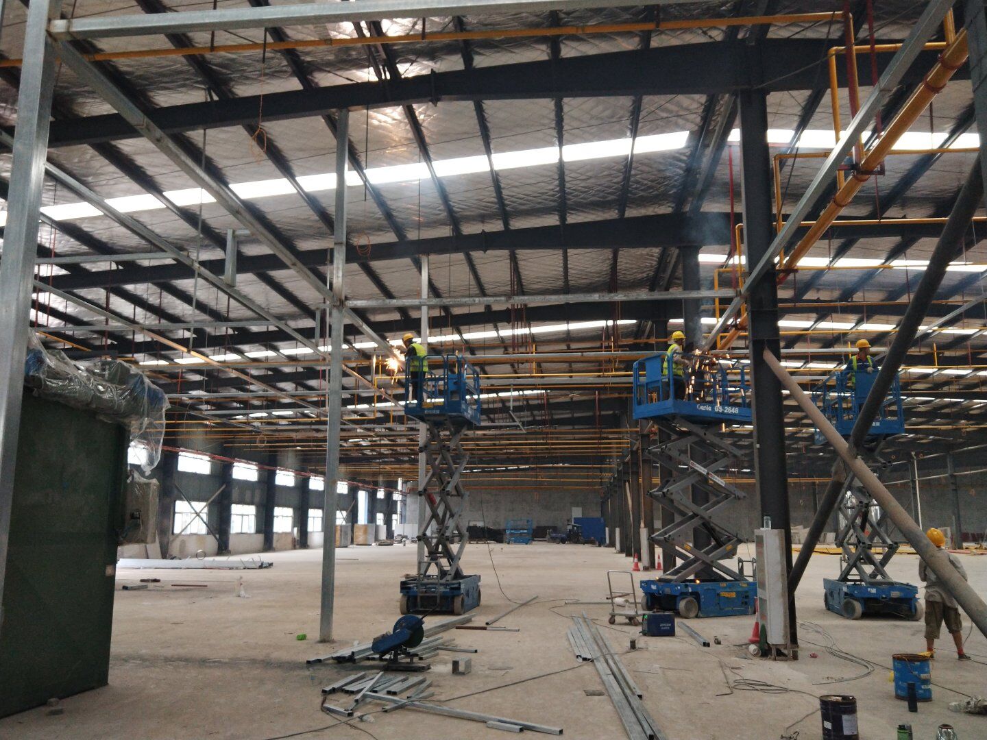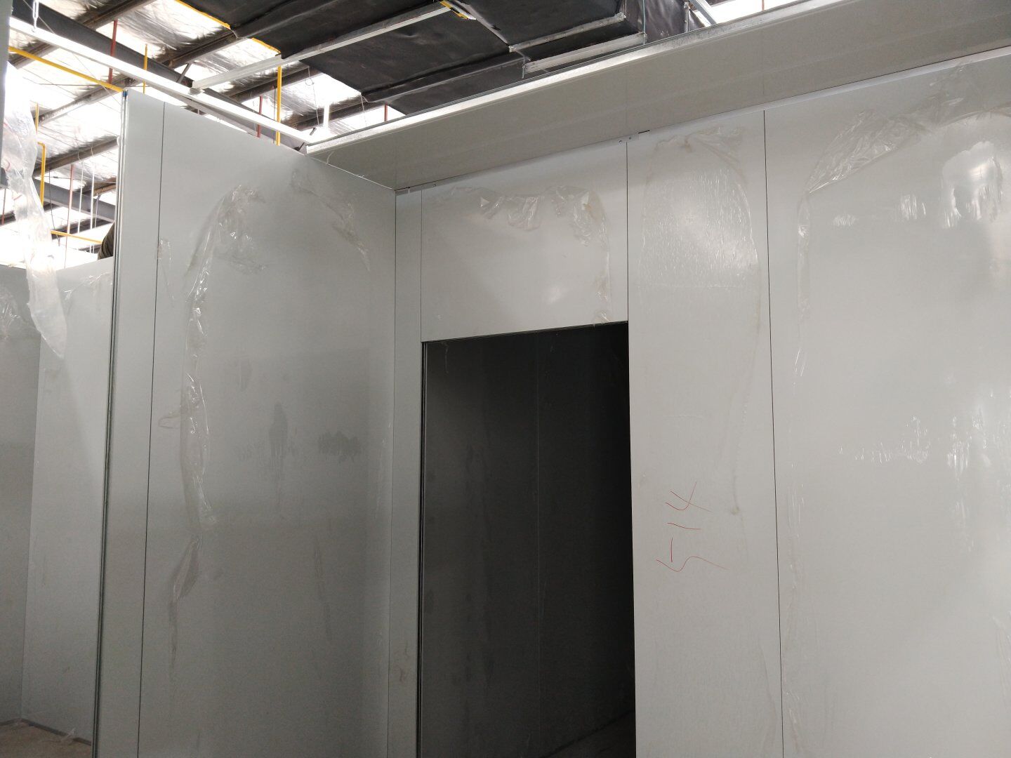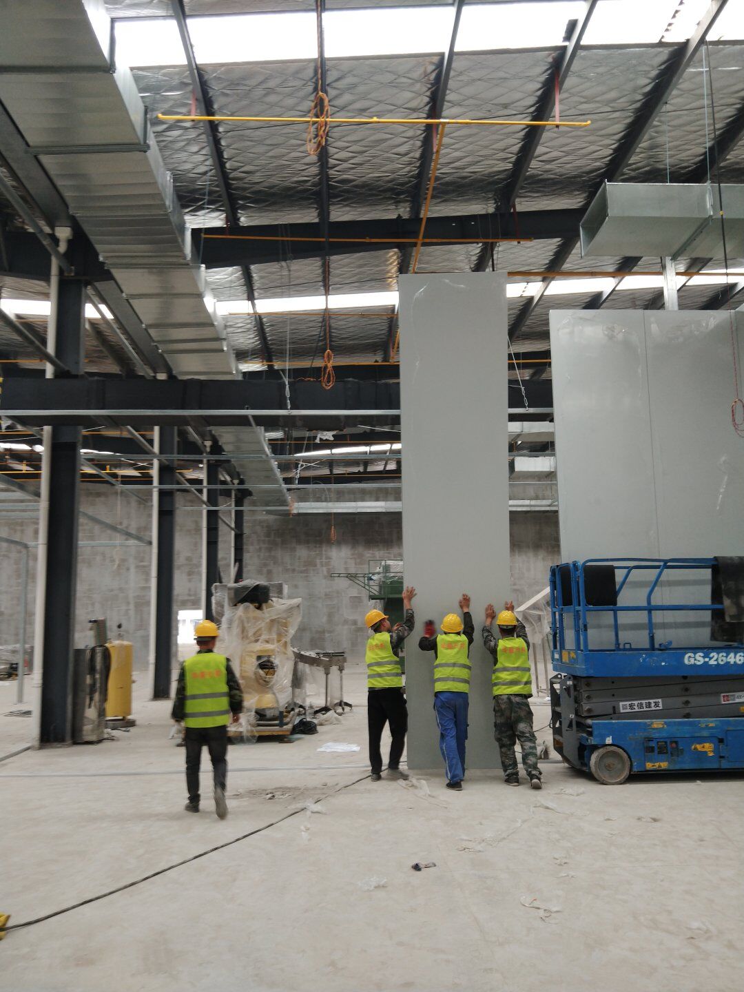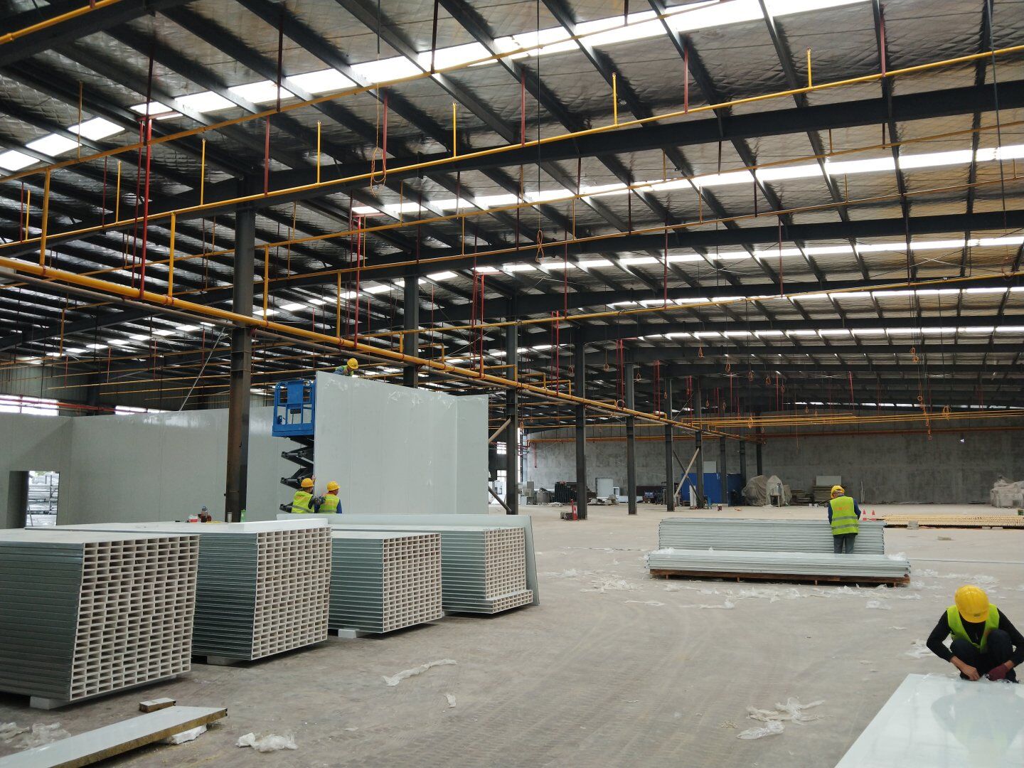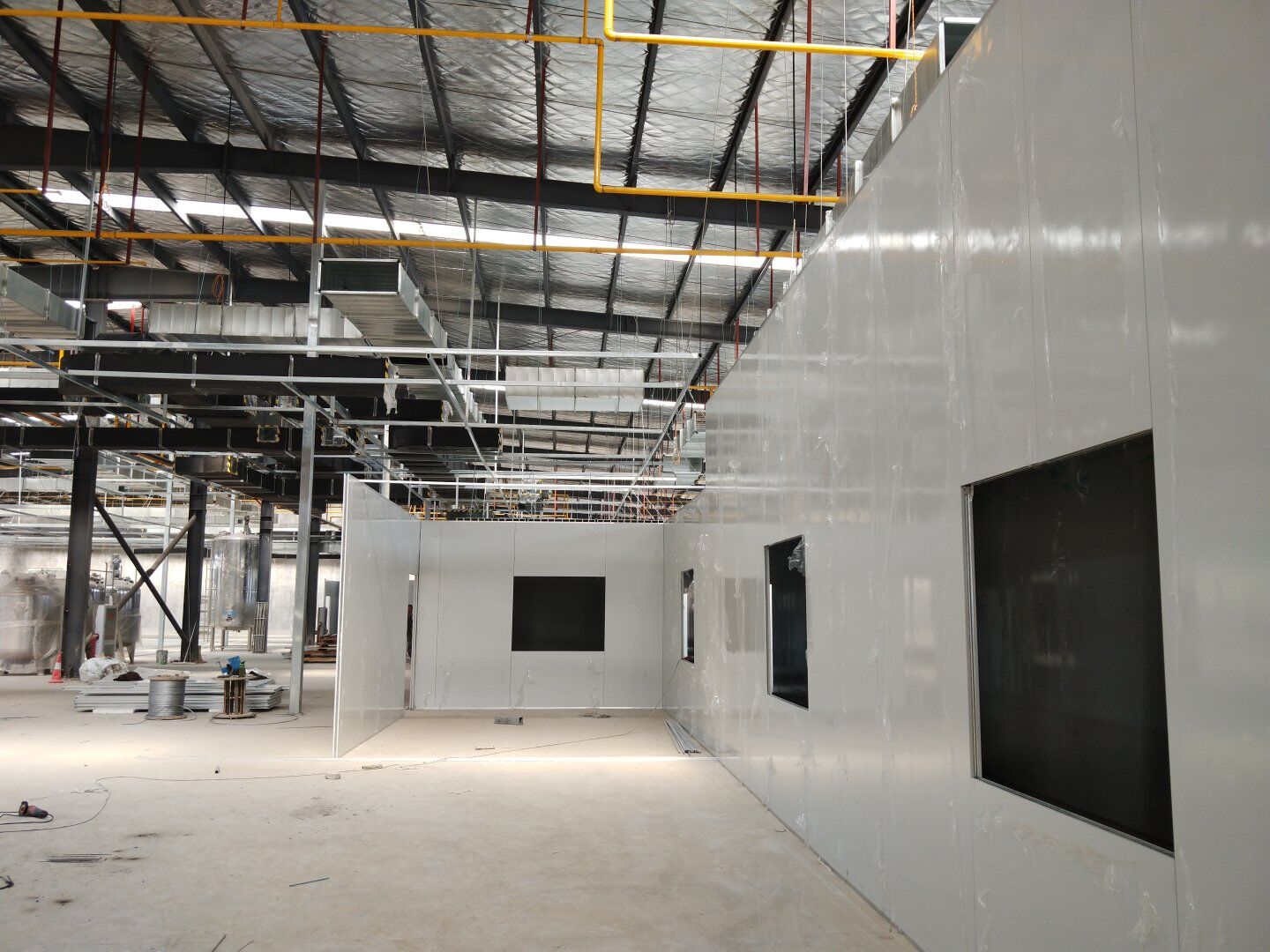 1,除預(yù)留設(shè)備通道外的彩鋼板墻板完成; 2,彩鋼板頂板完成80%。