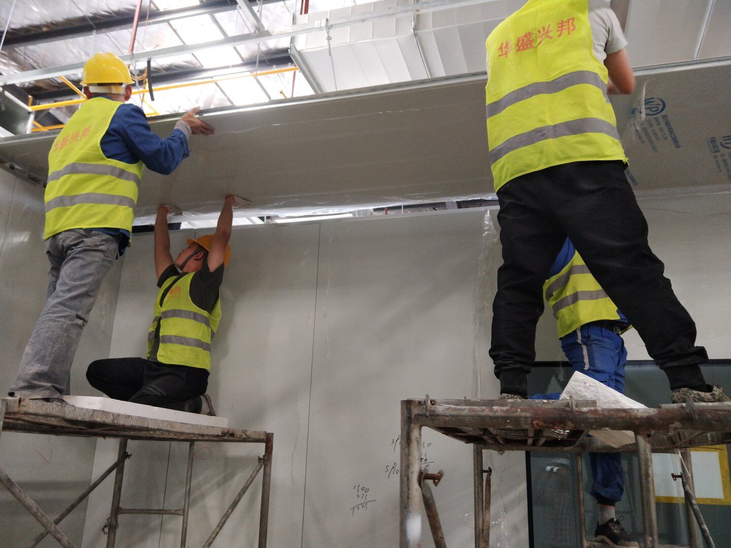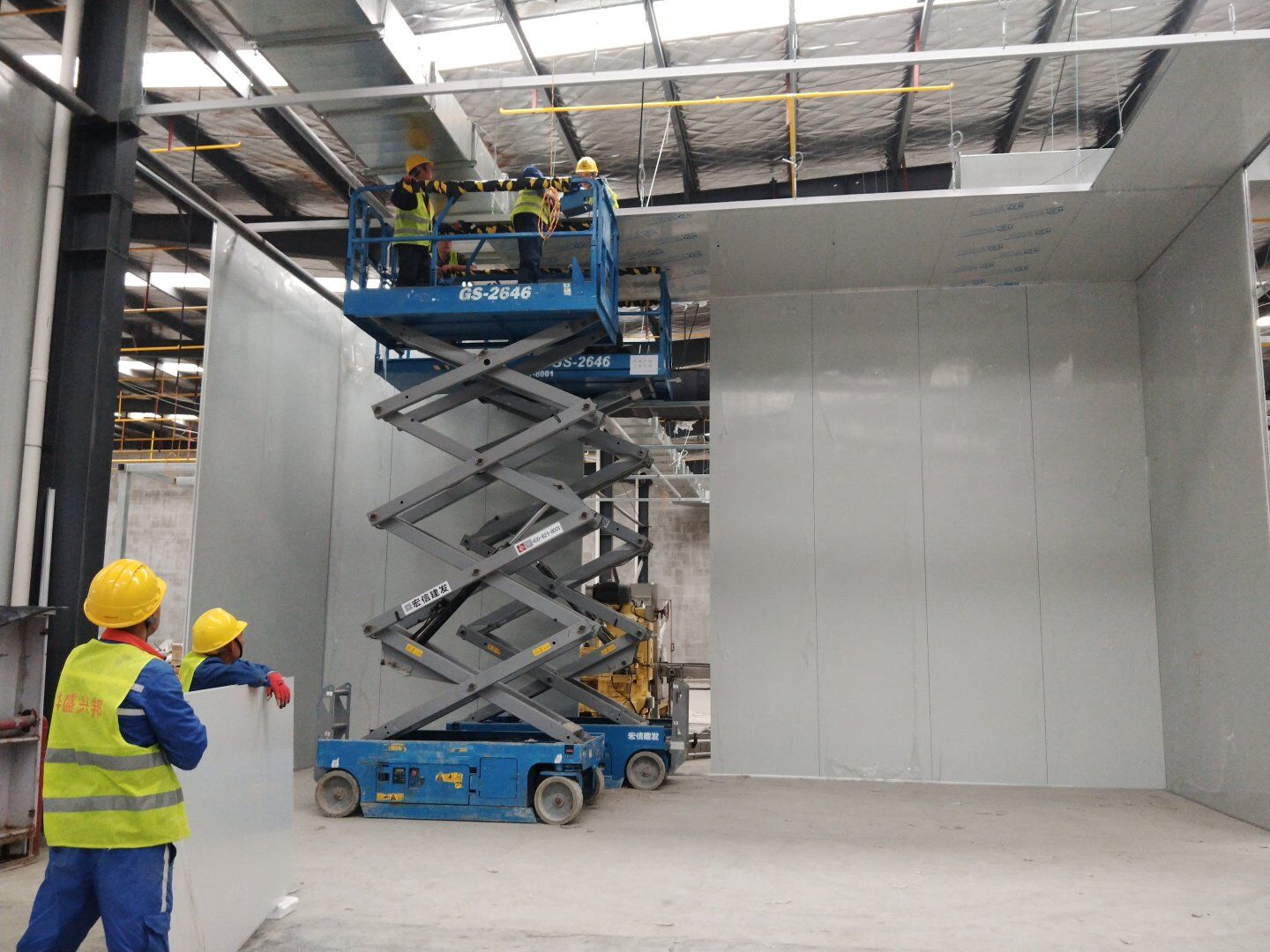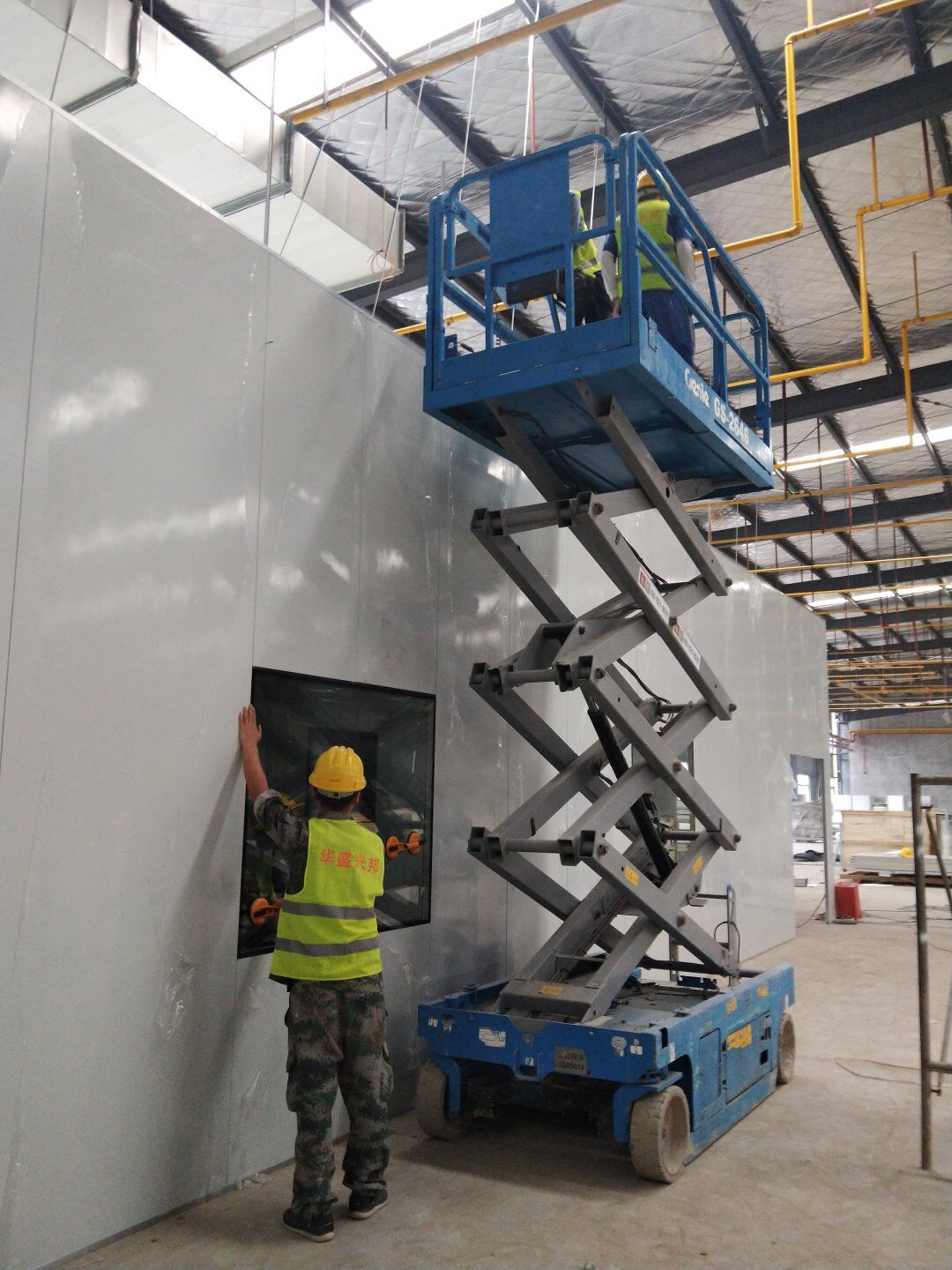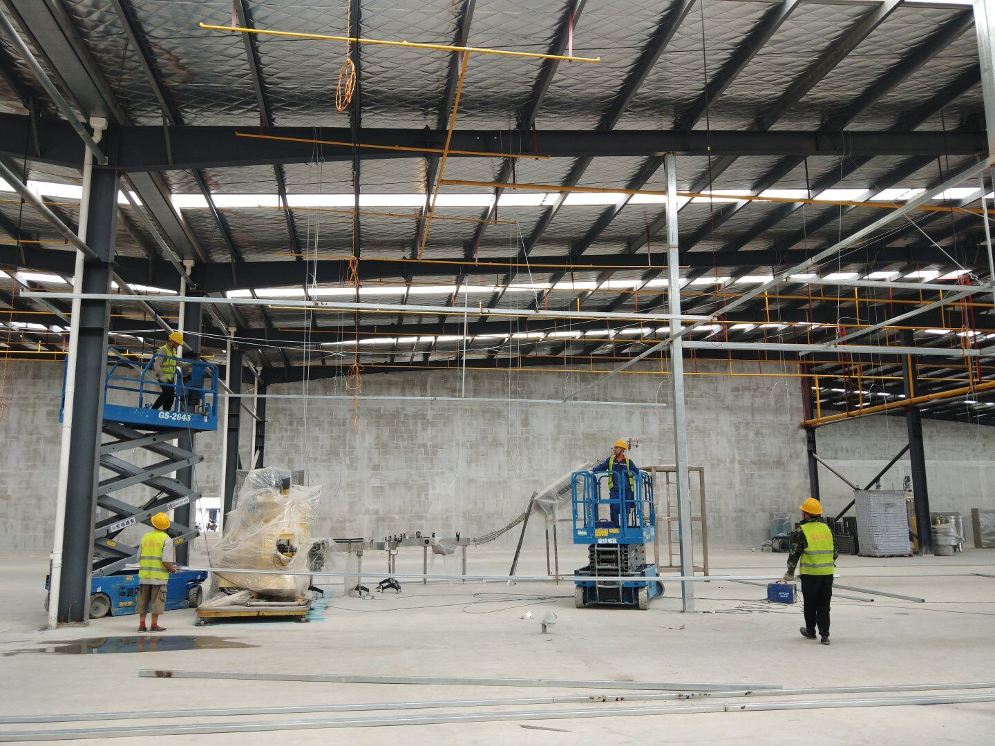 1,除預(yù)留設(shè)備通道外的彩鋼板墻板完成; 2,彩鋼板頂板完成80%。