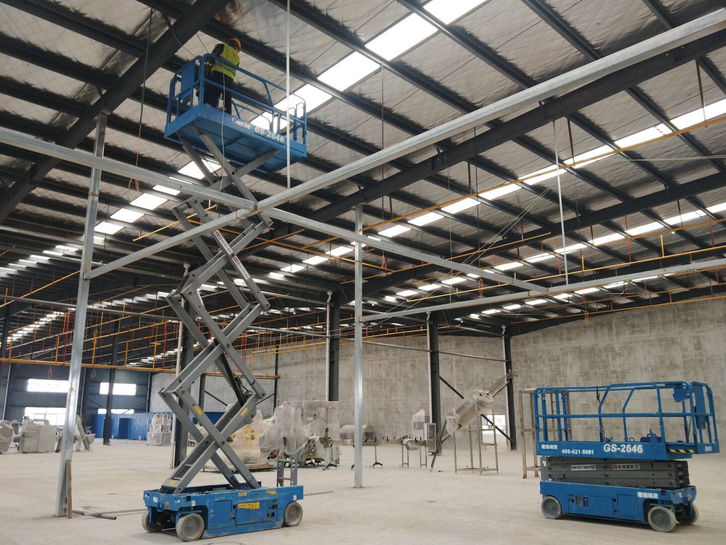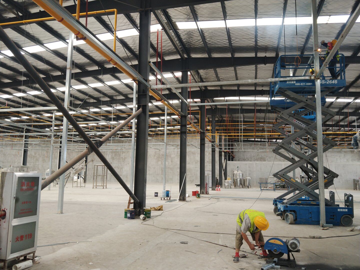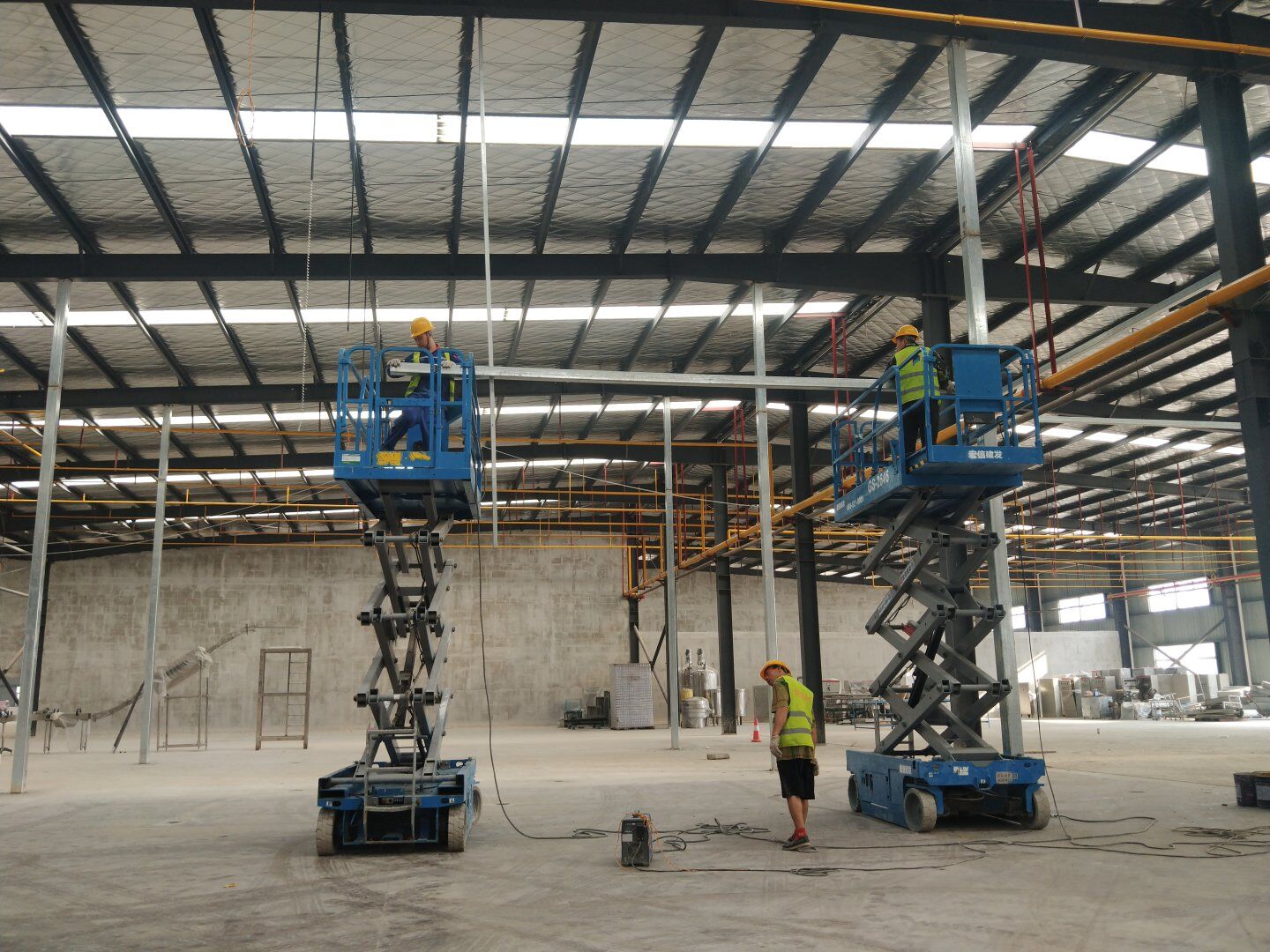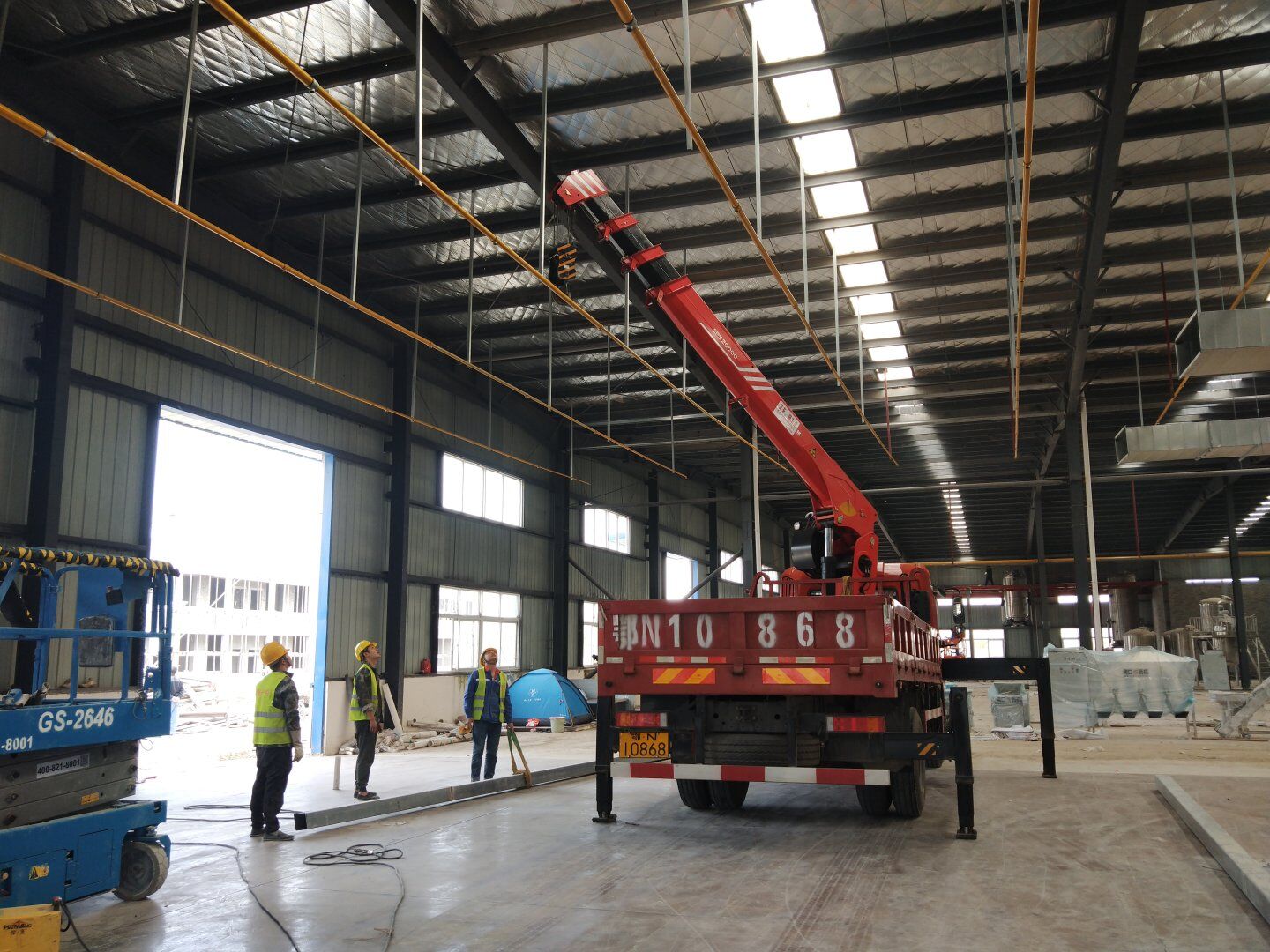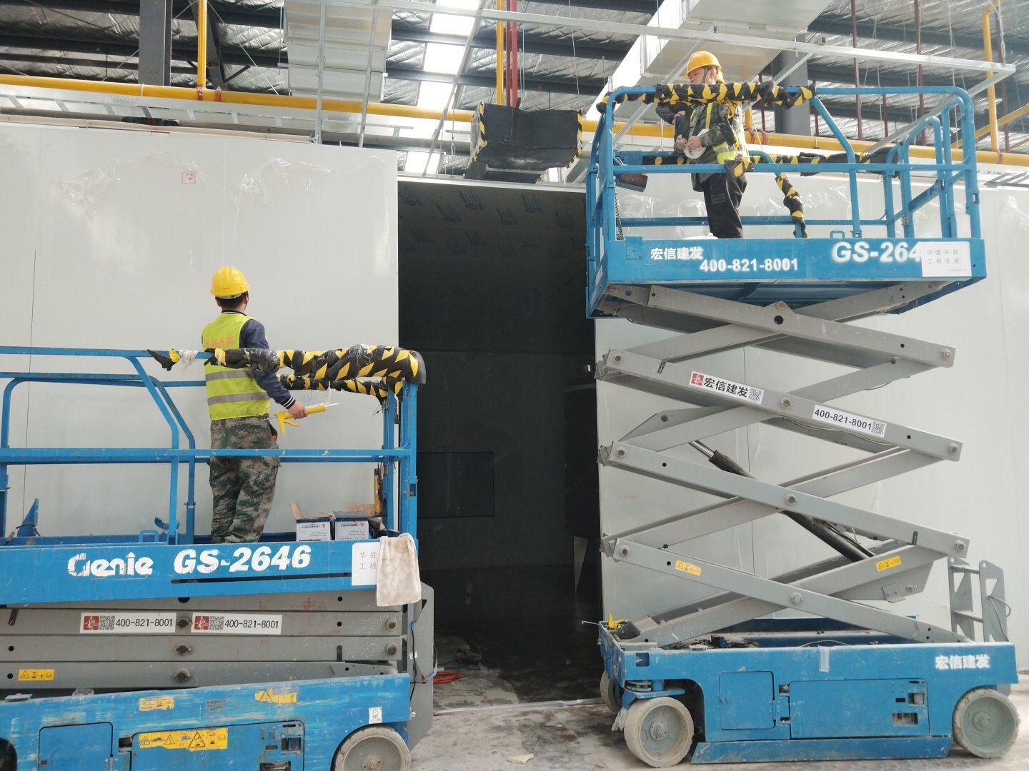 1,除預(yù)留設(shè)備通道外的彩鋼板墻板完成; 2,彩鋼板頂板完成80%。