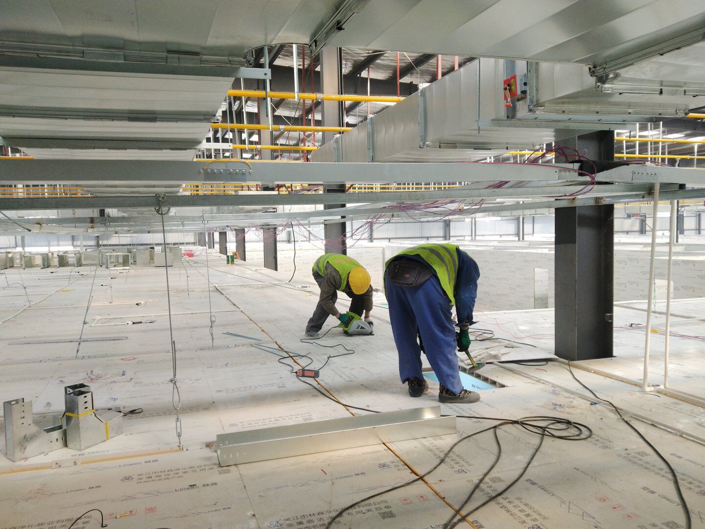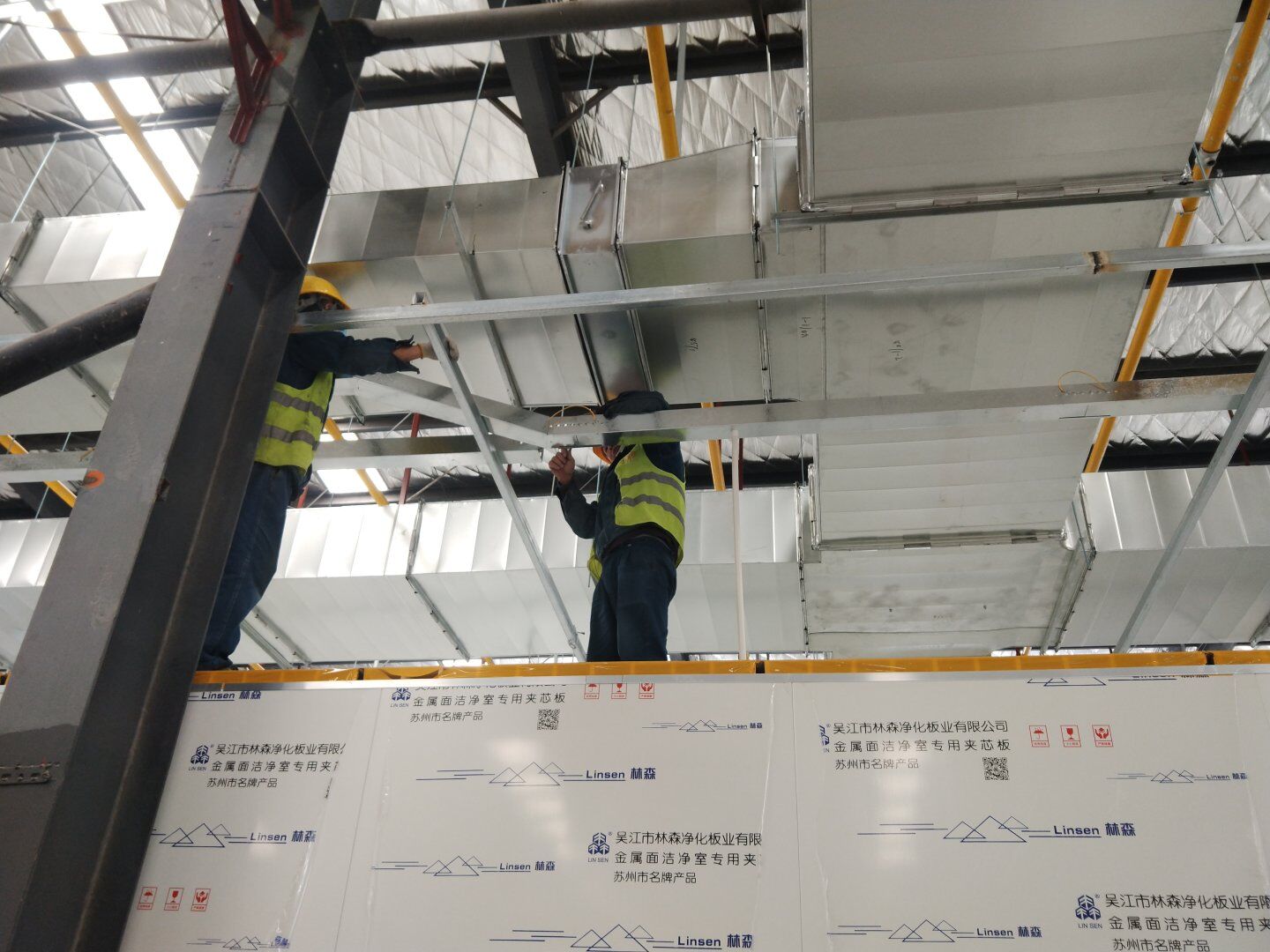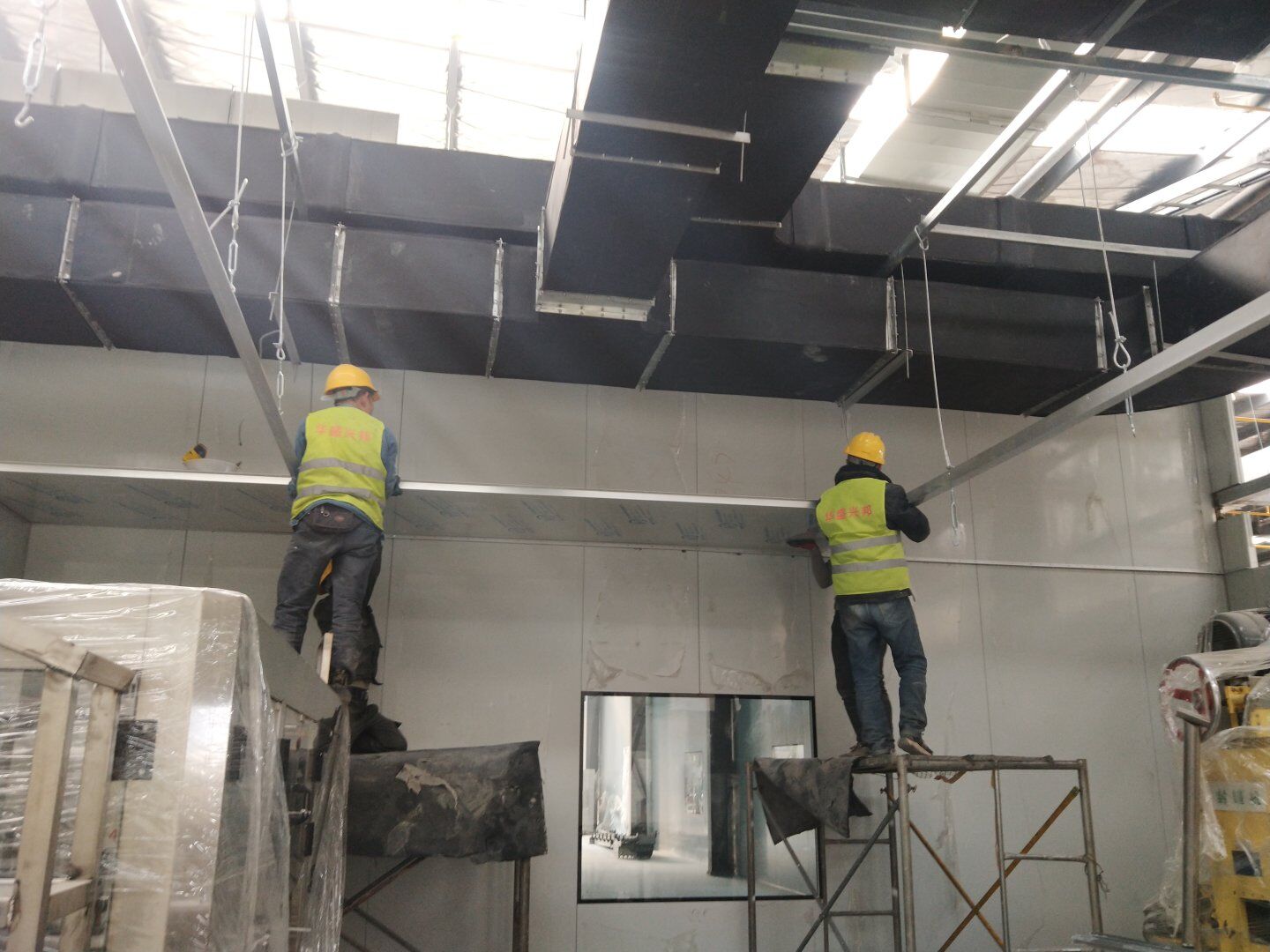 二次吊掛鋼構(gòu)網(wǎng)架施工;車間定基準線及彩鋼板隔墻放線;凈化風管施工