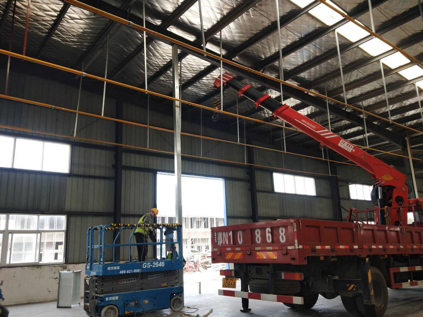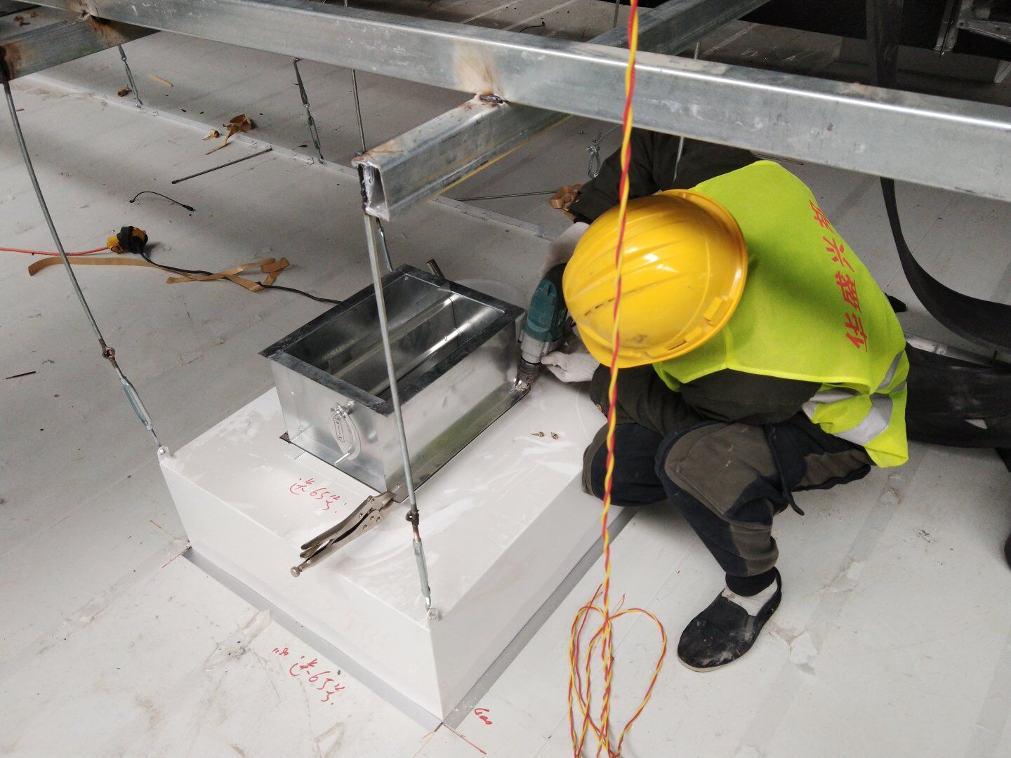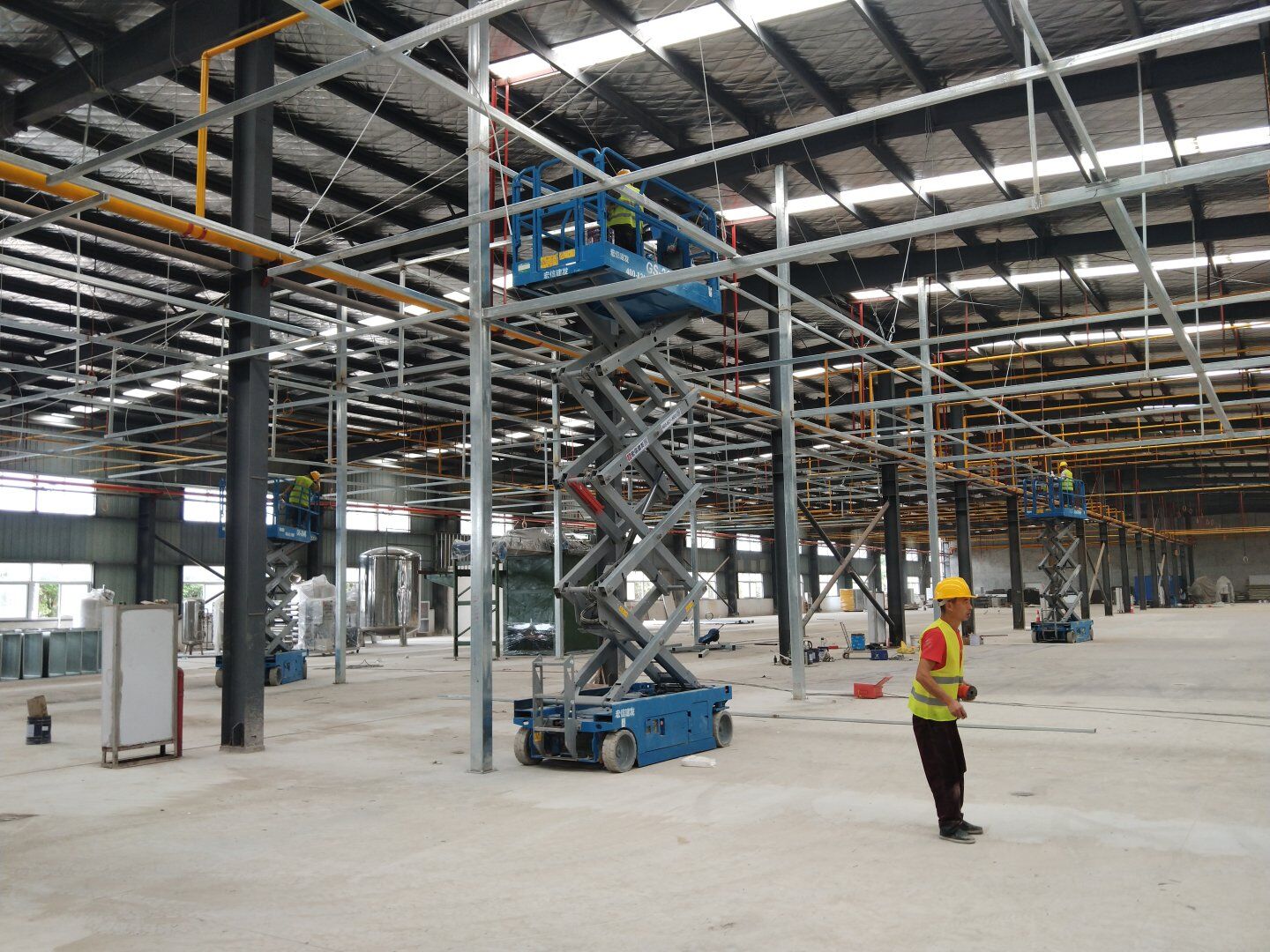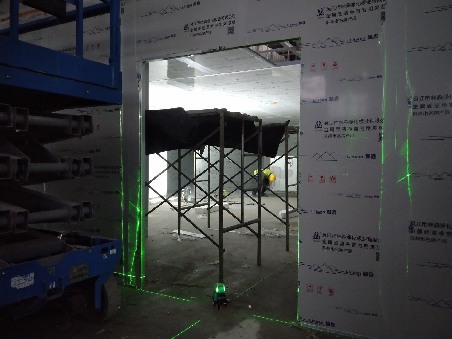 二次吊掛鋼構(gòu)網(wǎng)架施工;車間定基準線及彩鋼板隔墻放線;凈化風管施工