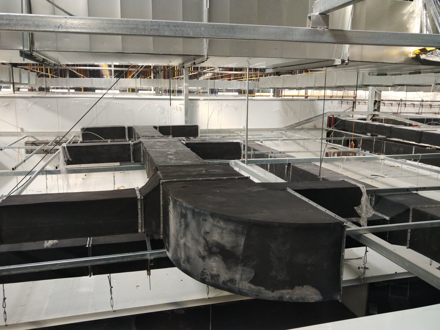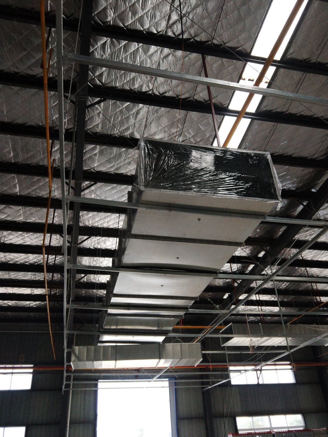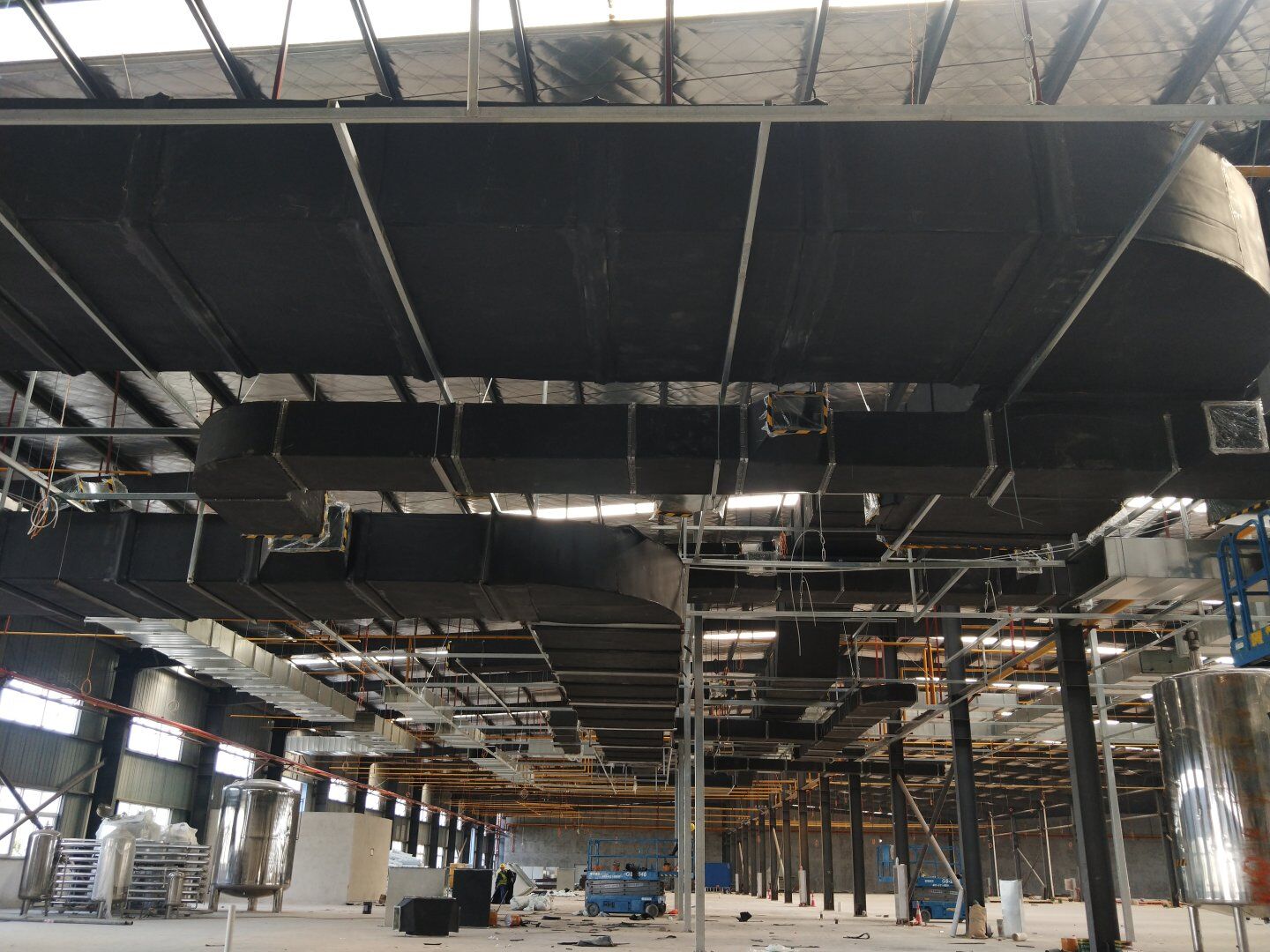 1,風管干管清洗,保溫及吊裝完成80%; 2,主風管保溫施工