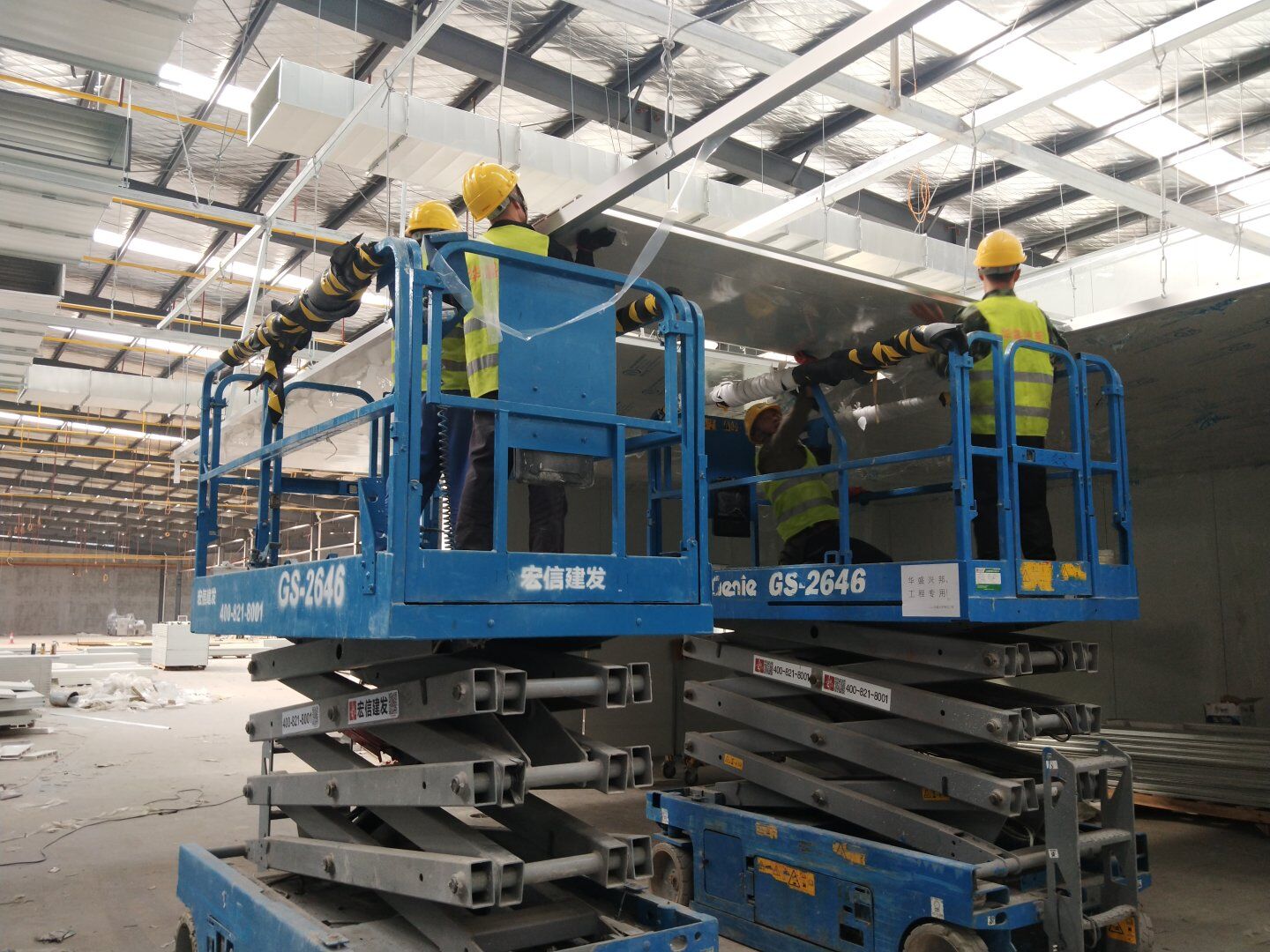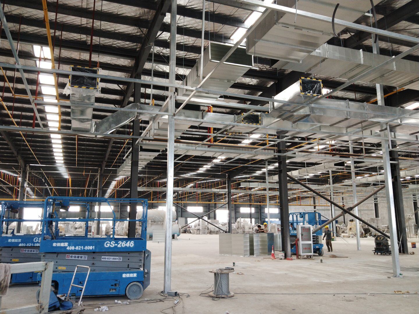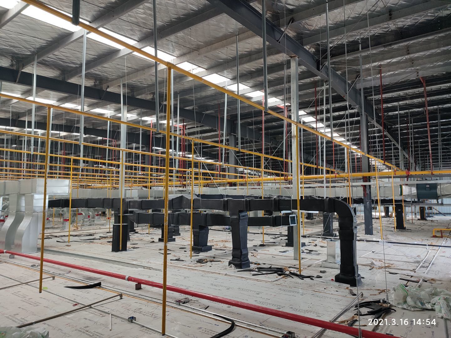 1,除設(shè)備預(yù)留通道外墻板完成, 2,頂板完成80%, 3,風管支管扣管完成30%
