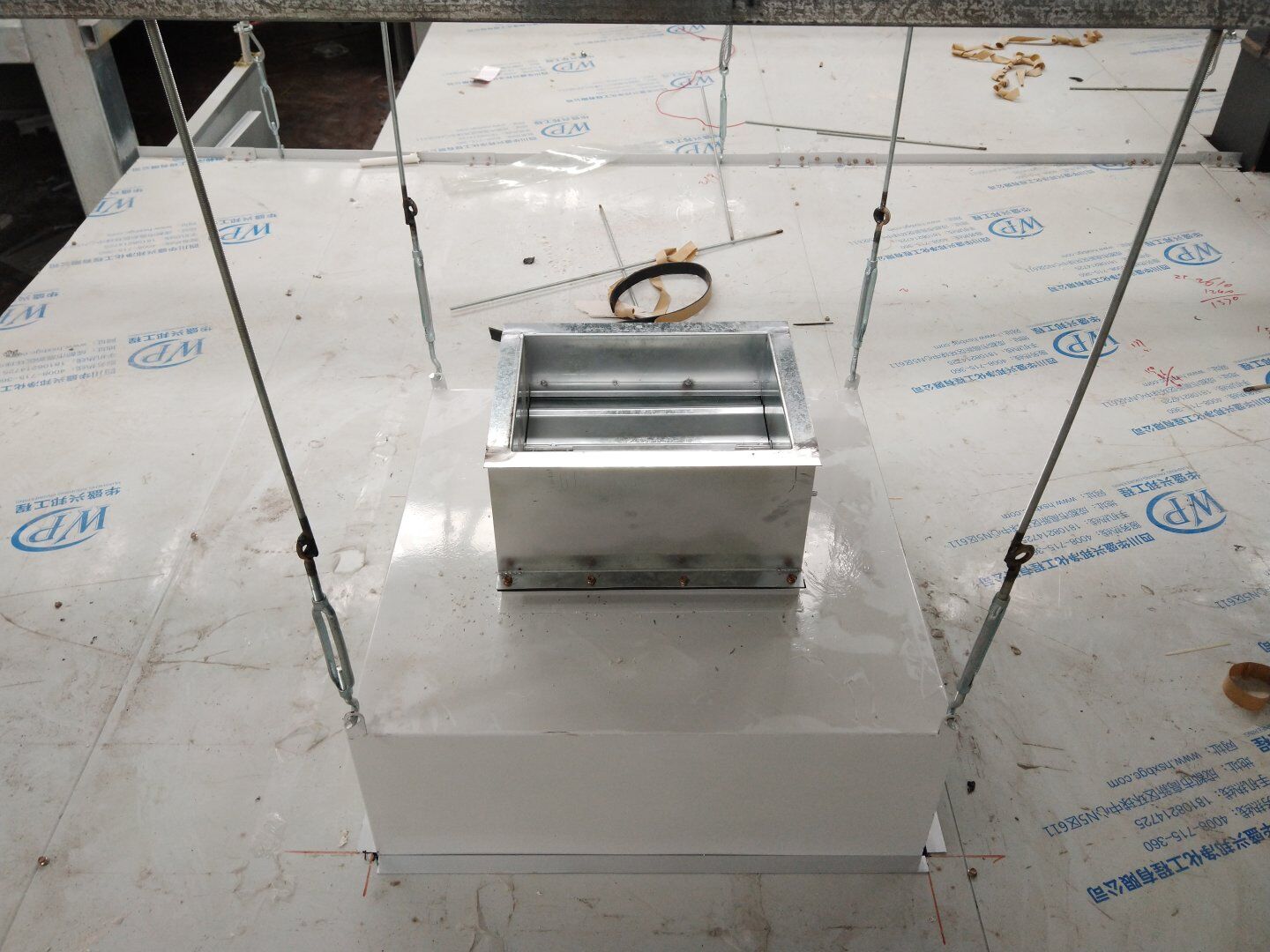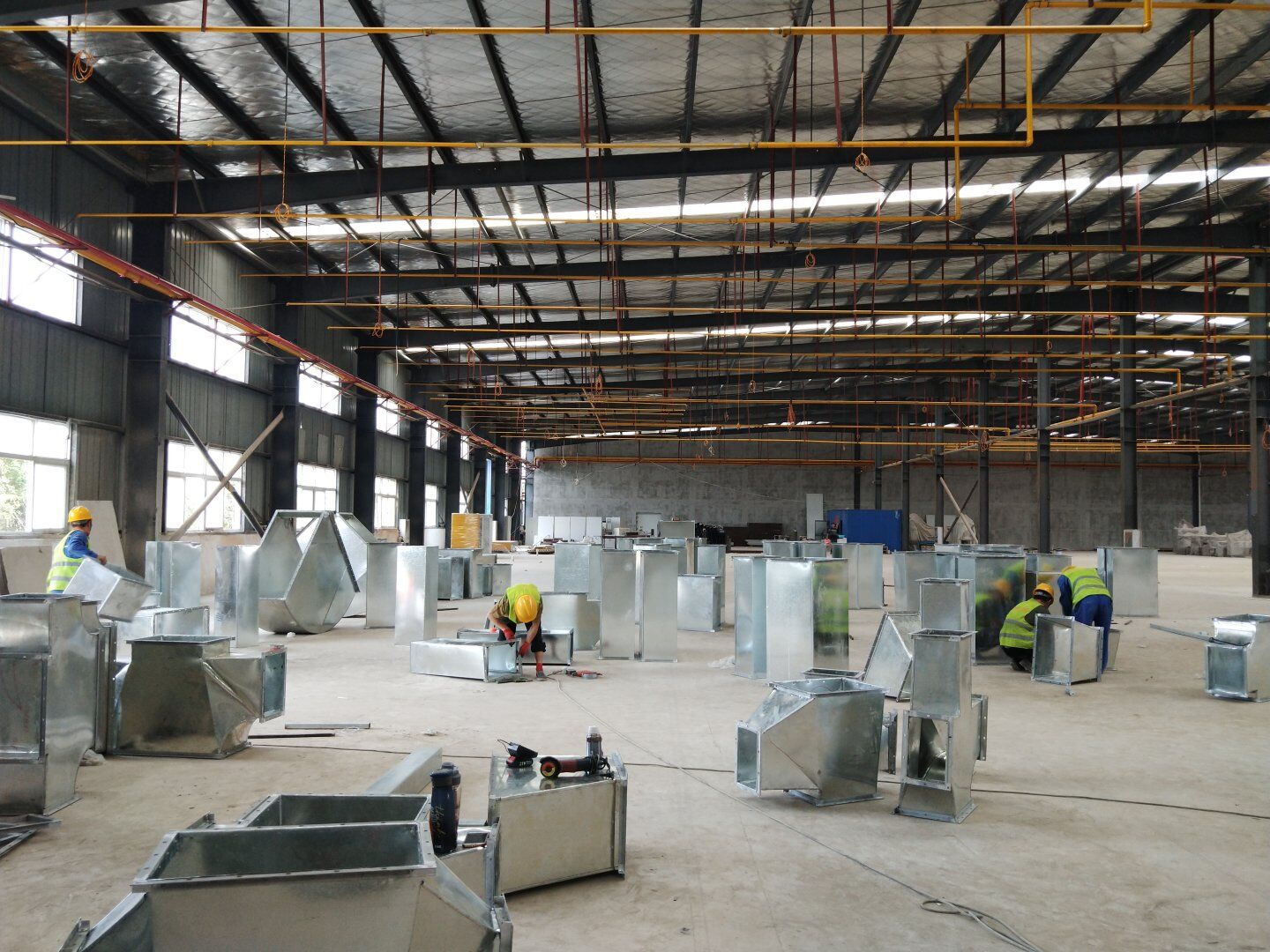 1、風管主管半成品組裝完成; 2、風管主管清洗,打膠密封,吊裝施工