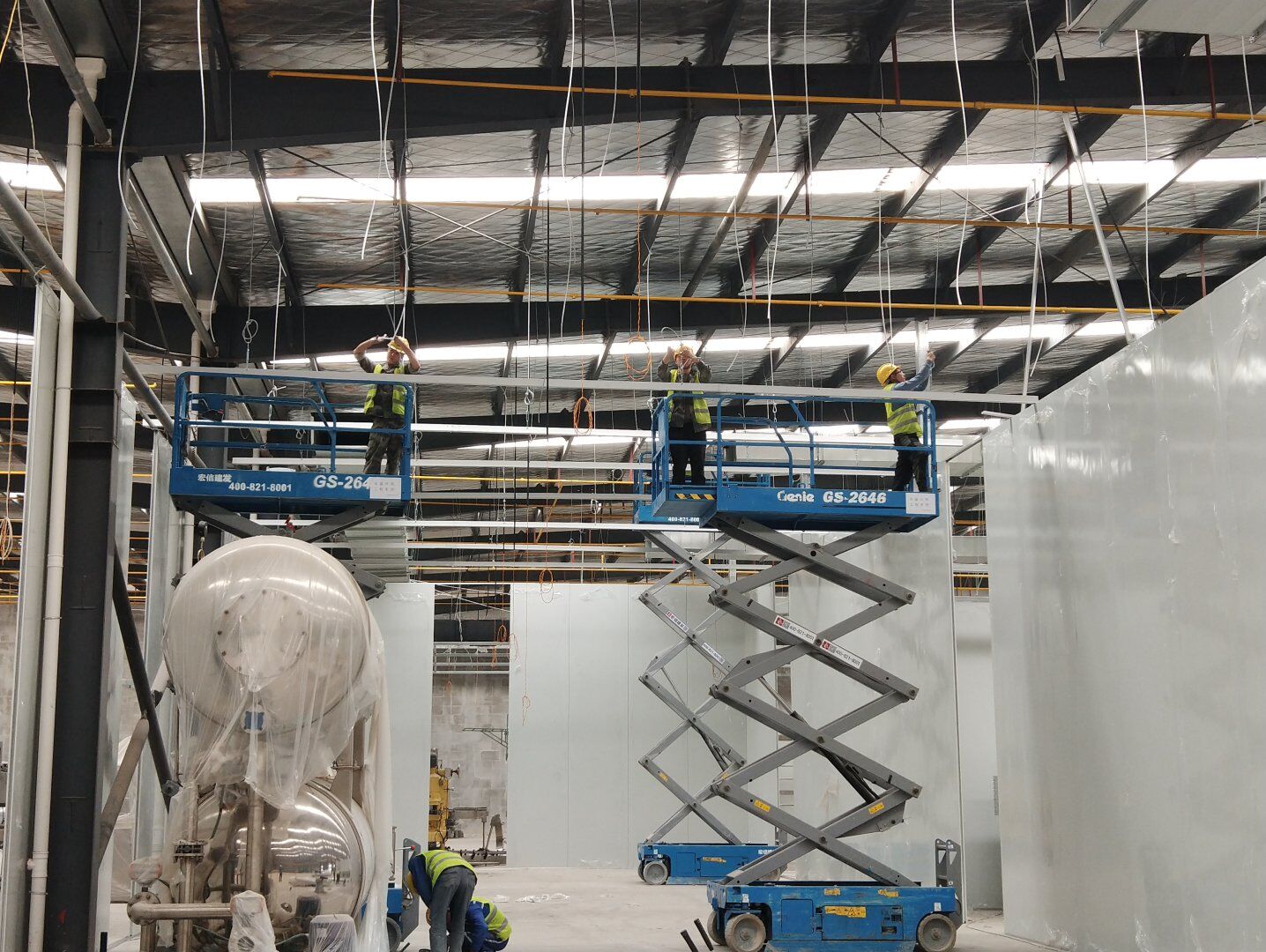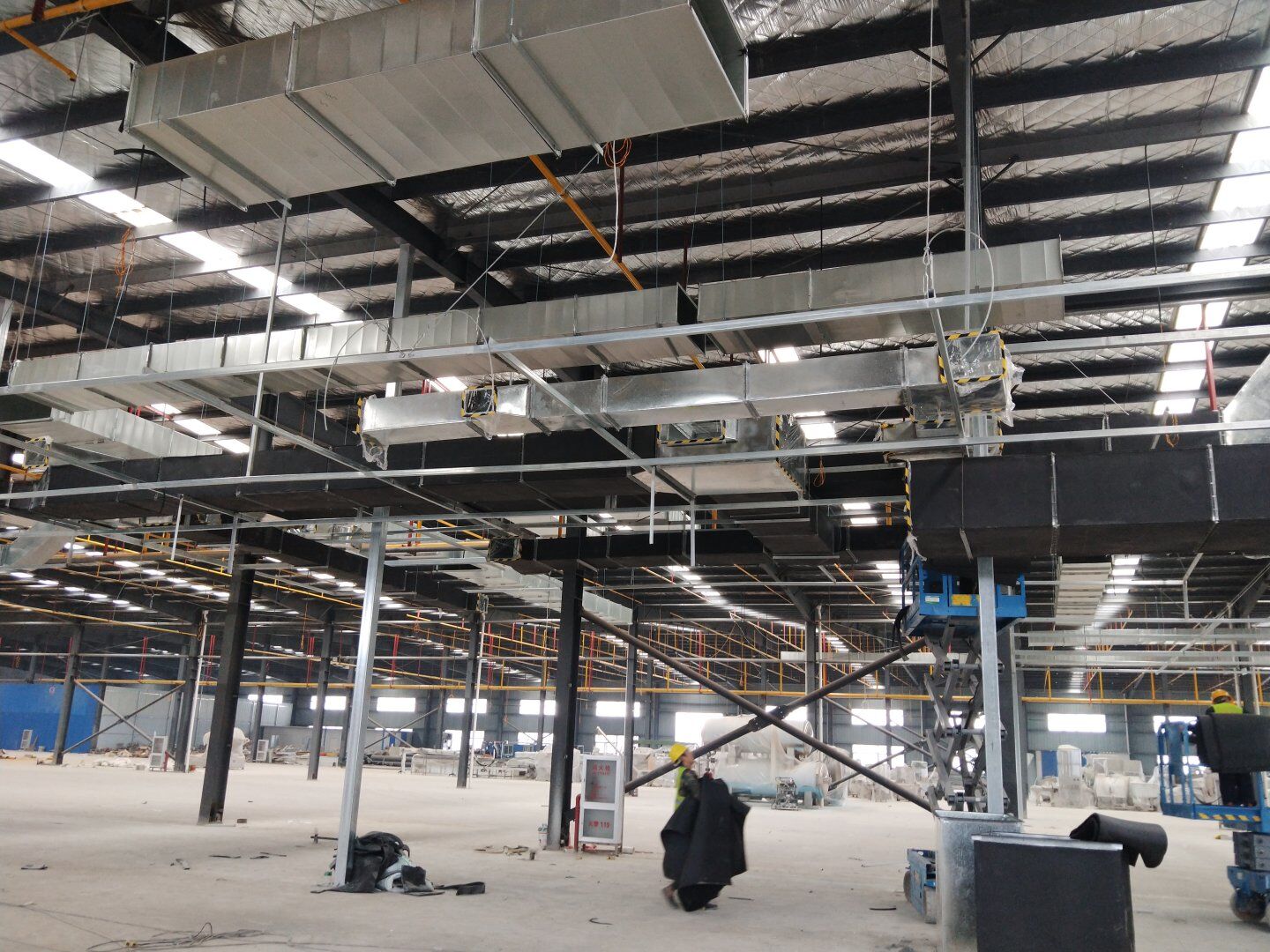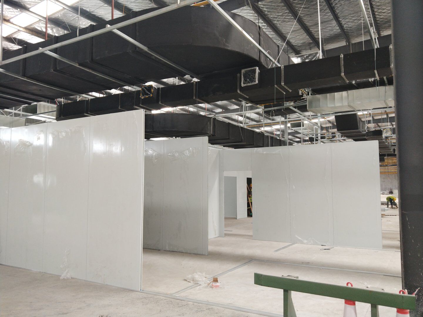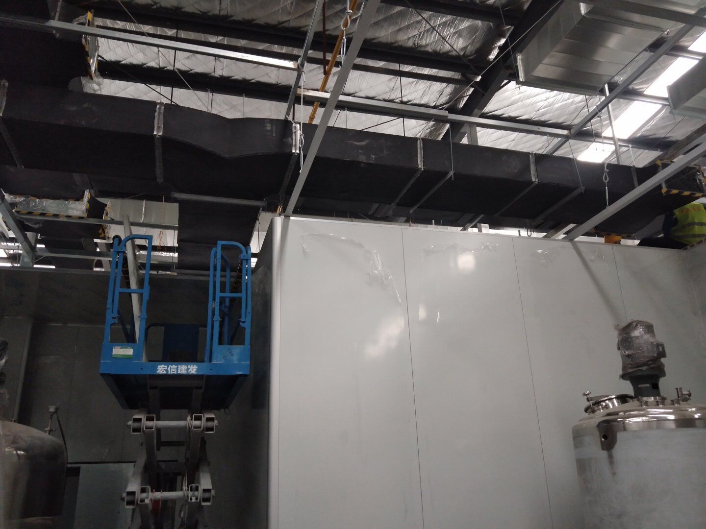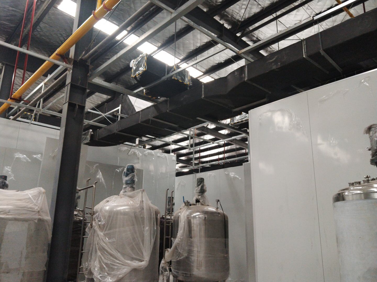 液體車間: 1、剩余風管拼裝完成80%;2、彩鋼板打膠完成95%;3、空調(diào)自控放線完成95%。