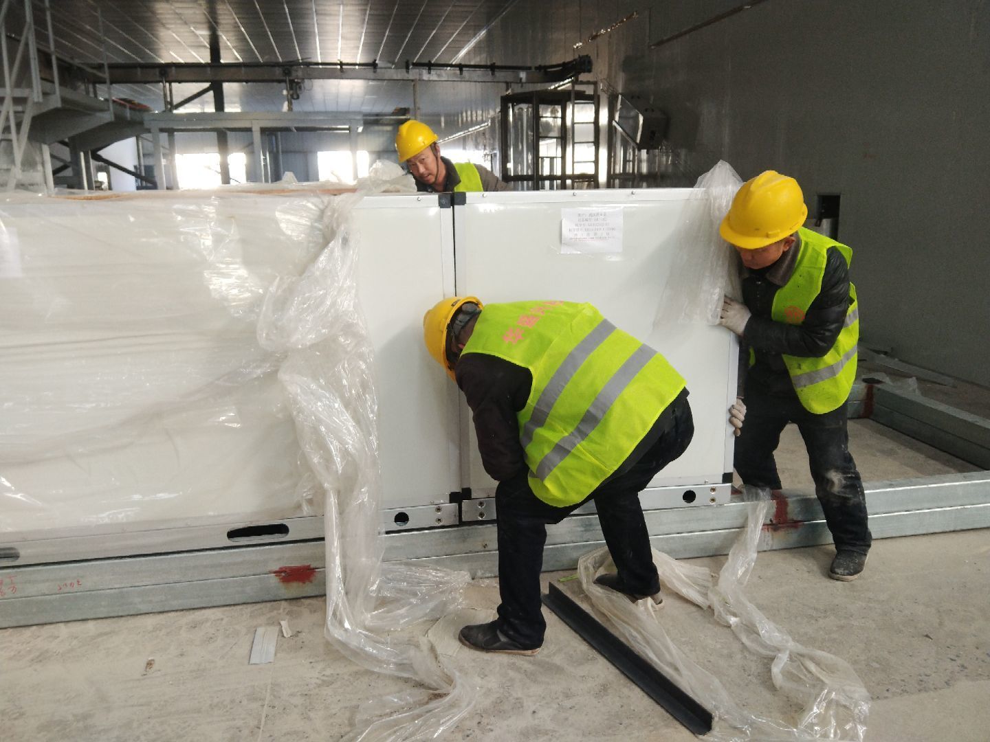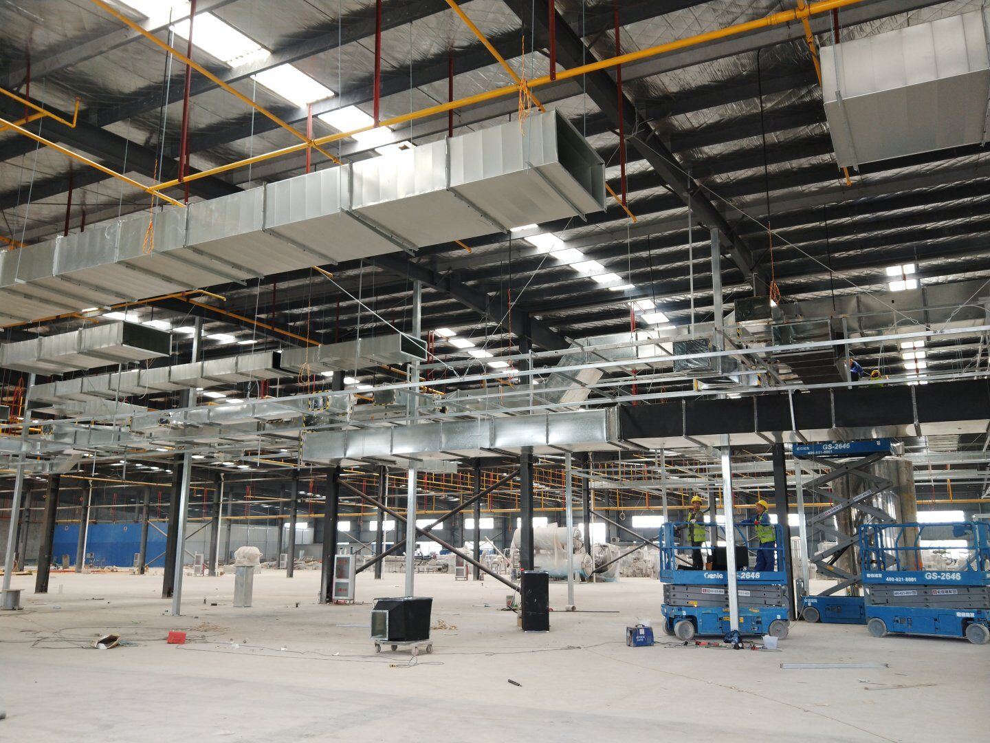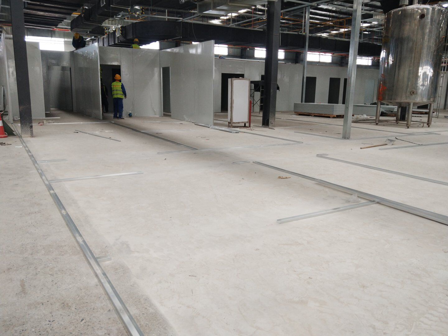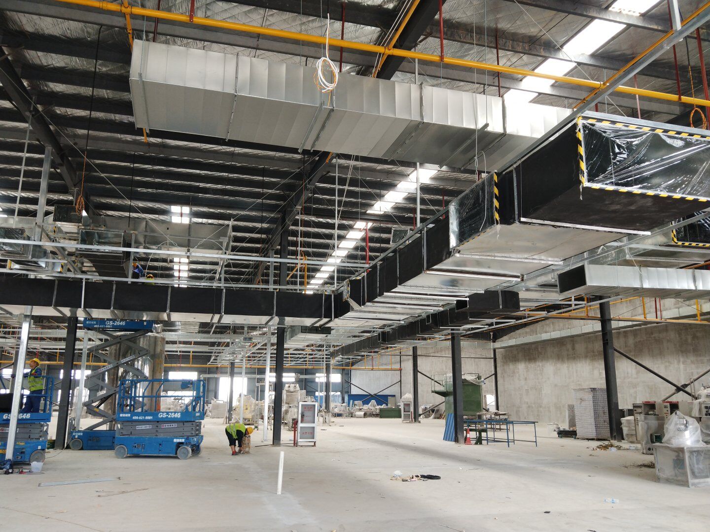 液體車間: 1、剩余風管拼裝完成80%;2、彩鋼板打膠完成95%;3、空調(diào)自控放線完成95%。