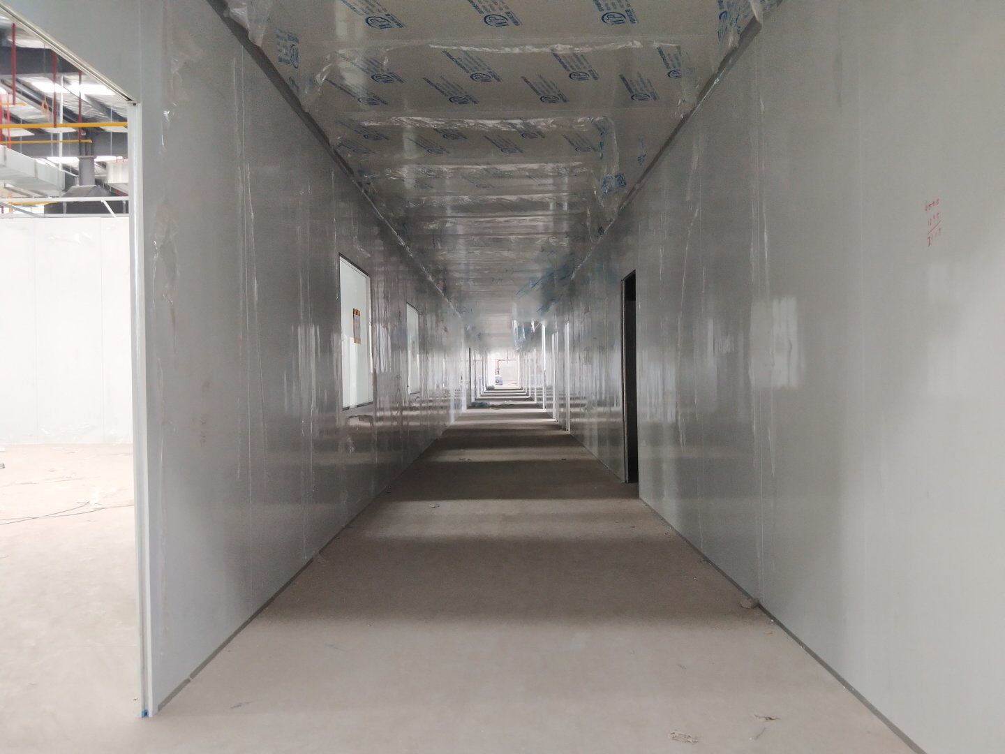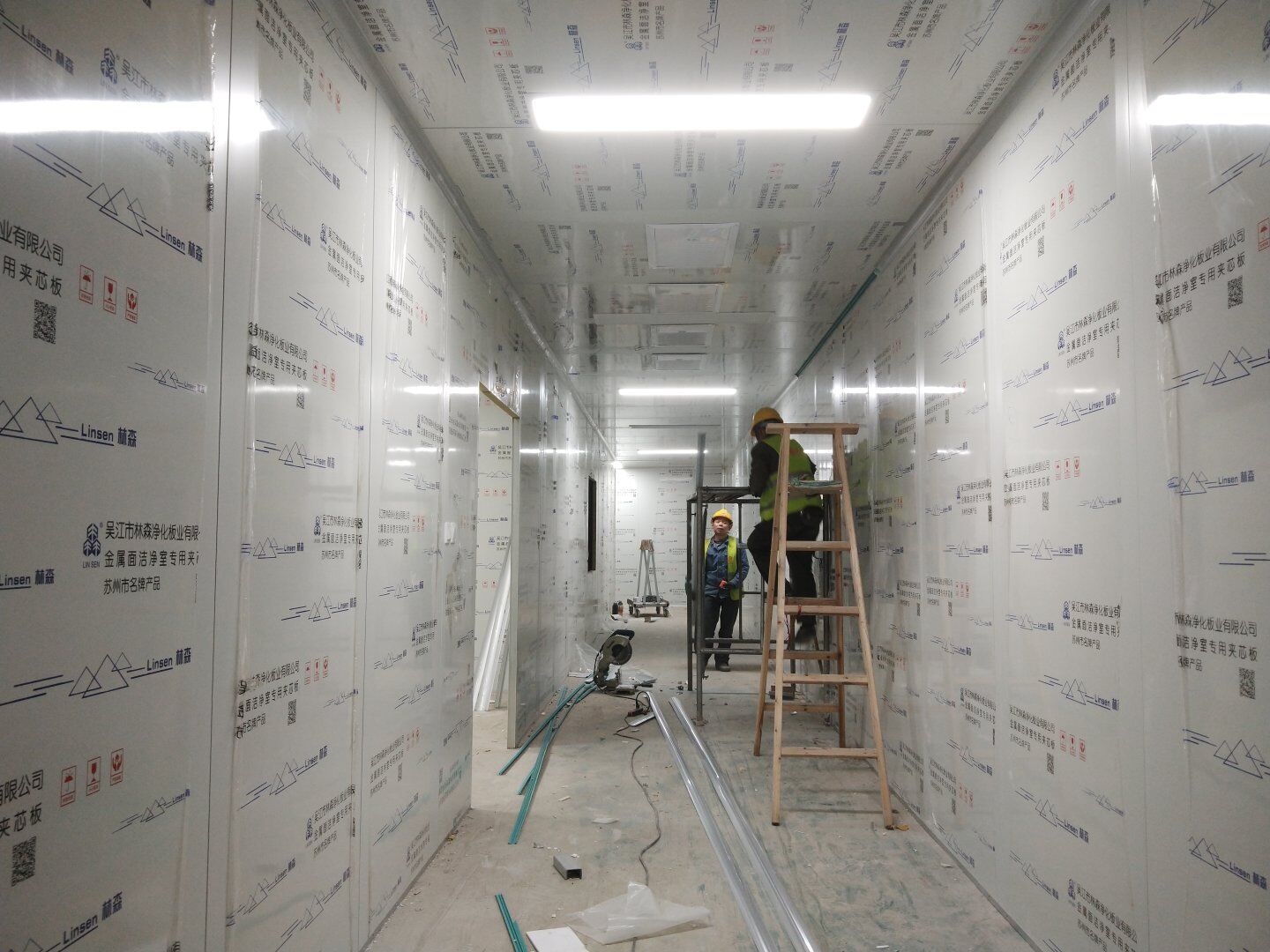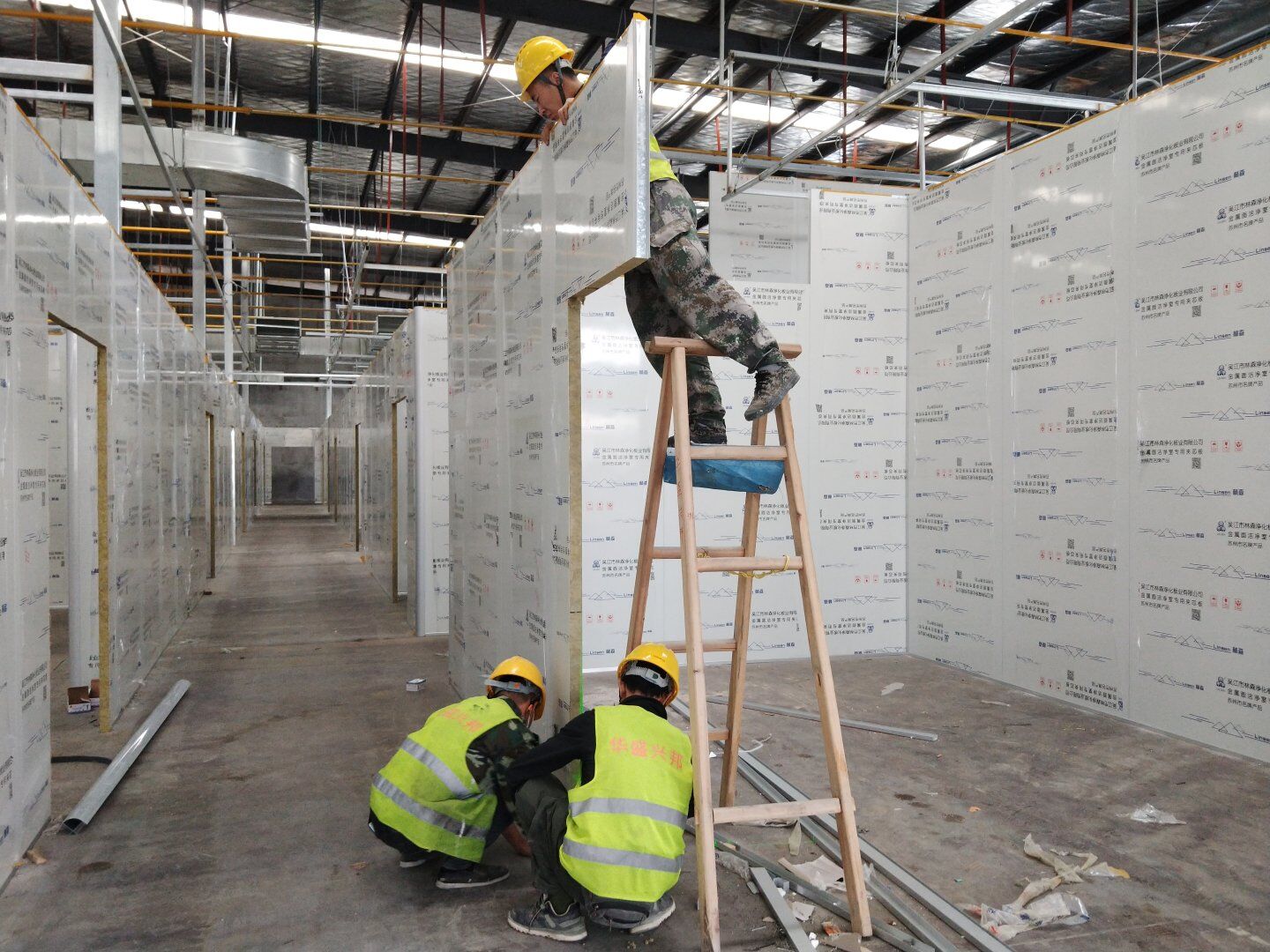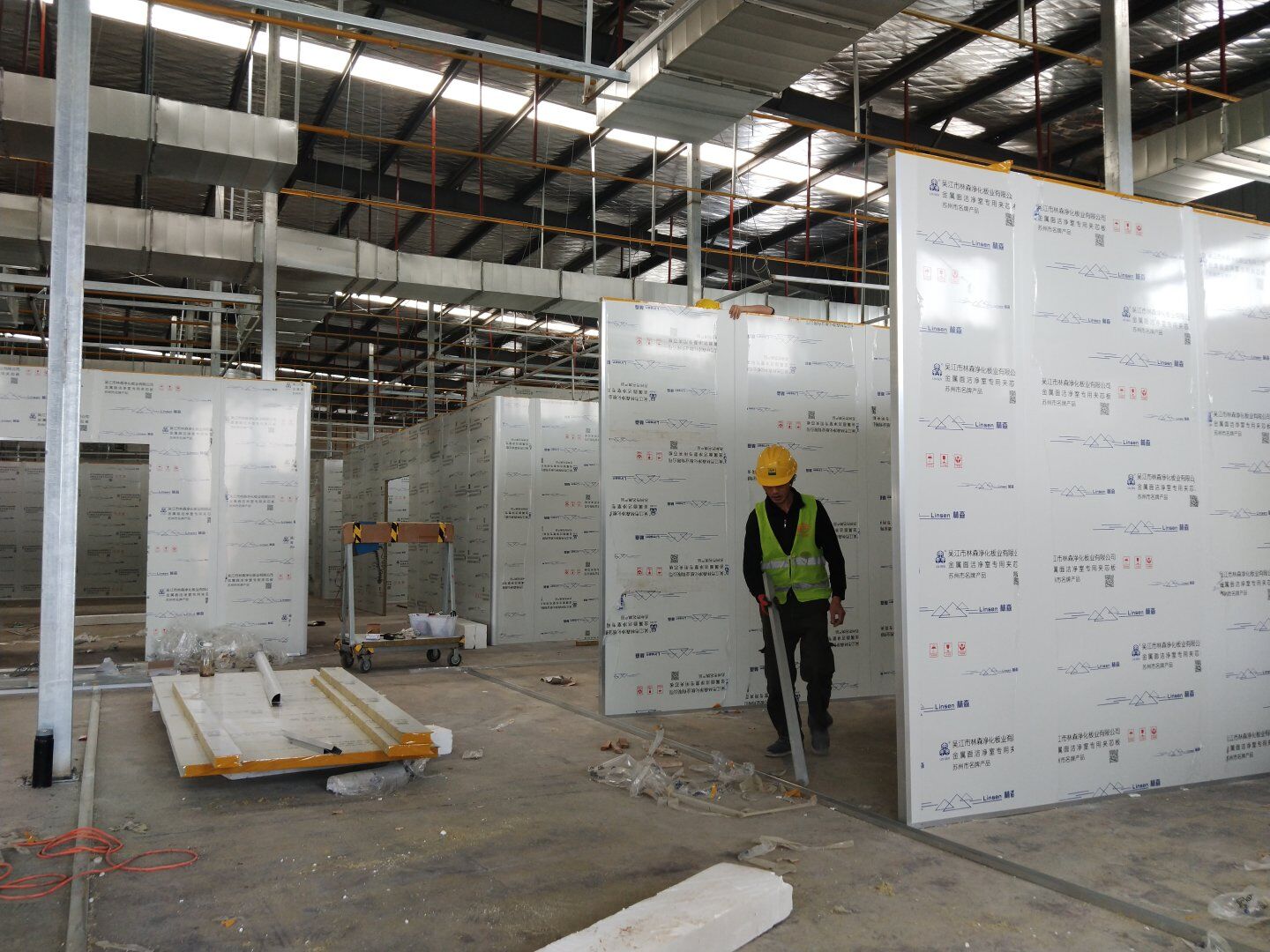 1,彩鋼板墻板完成75% 2,回風夾道安裝,撕膜,打膠完成15% 3,潔凈窗安裝完成60%。