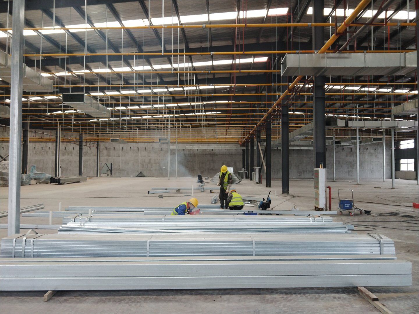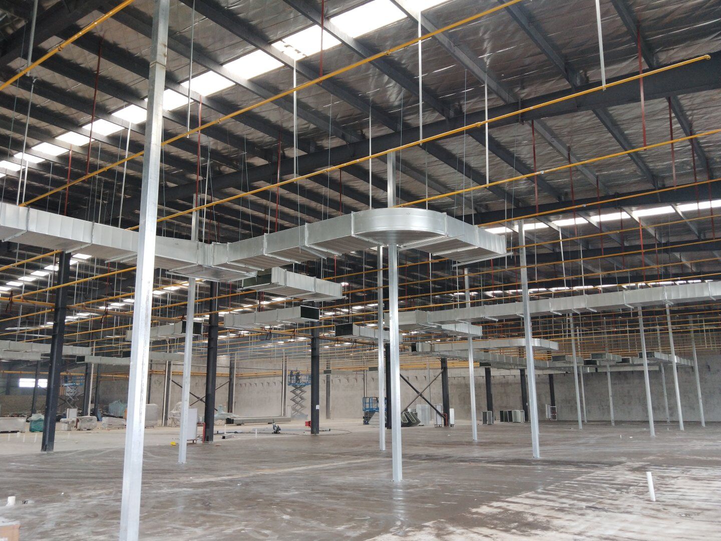 1、二次吊掛鋼結(jié)構(gòu)立柱及連接橫梁完成,鋼網(wǎng)架完成約70%; 2、凈化風管制作完成,主管半成品加工