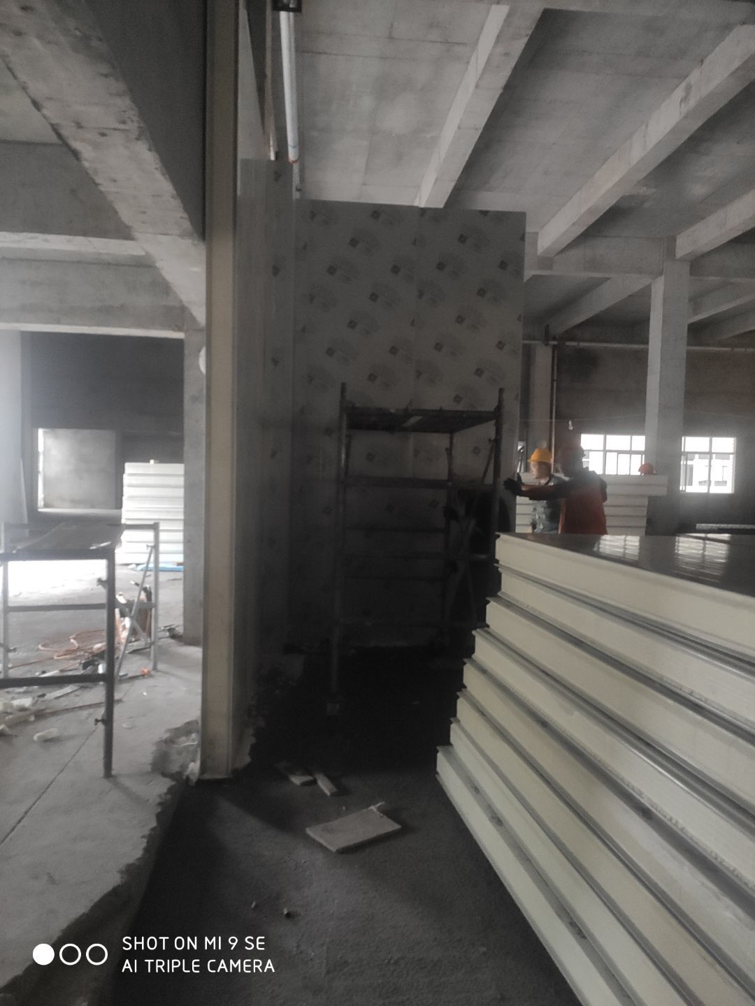彩鋼頂板除預(yù)留外完成100%;門、窗、各完成100%;地坪固化處理完成90%圓狐及底座同時(shí)完成75%。水,電、完成90%。