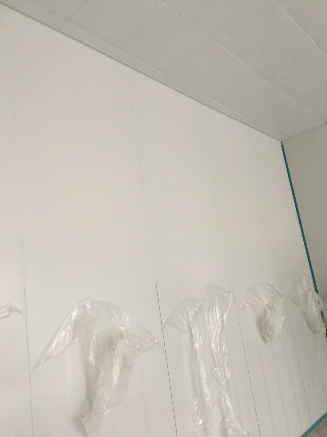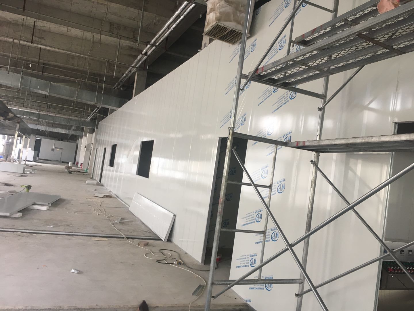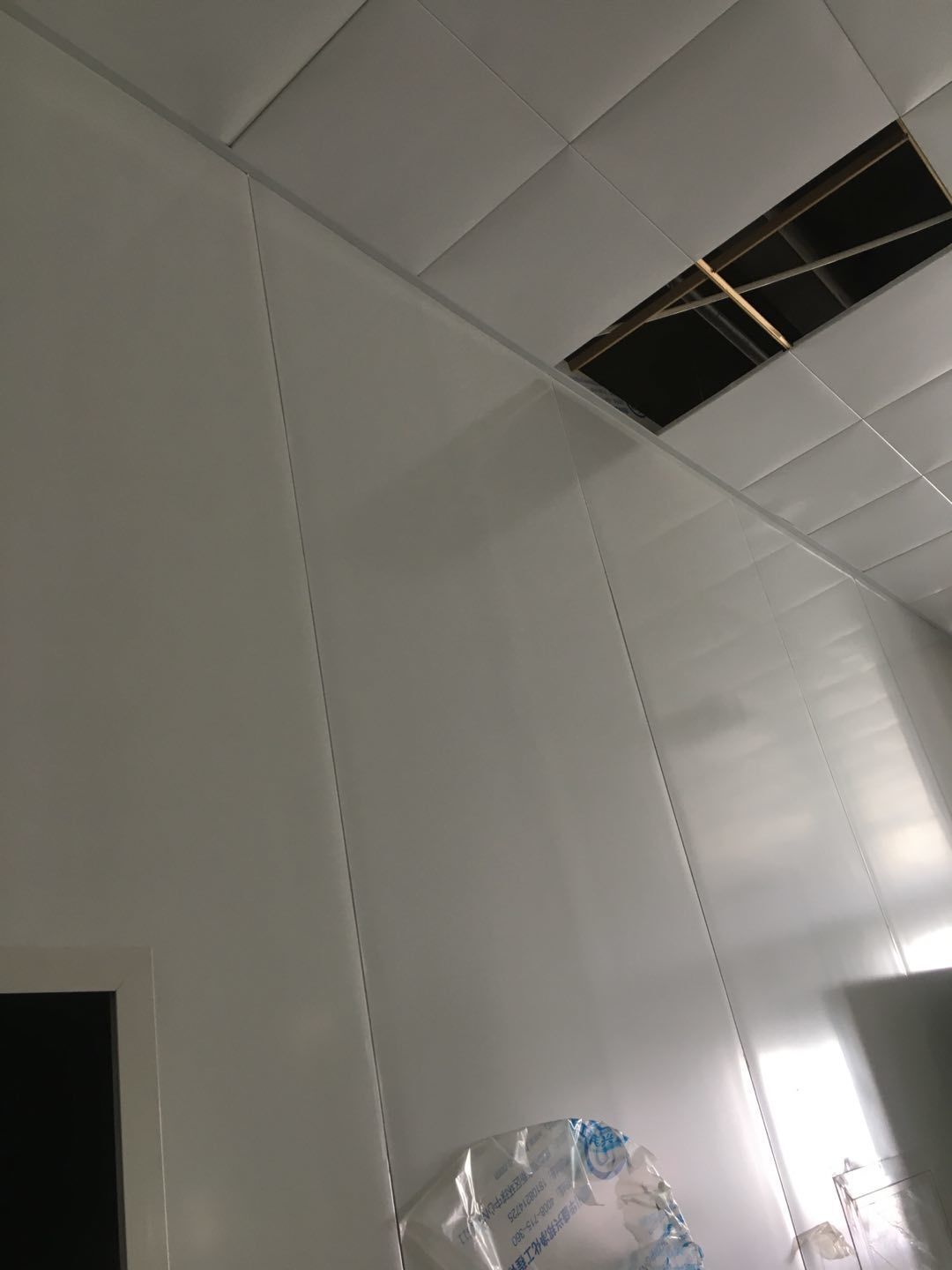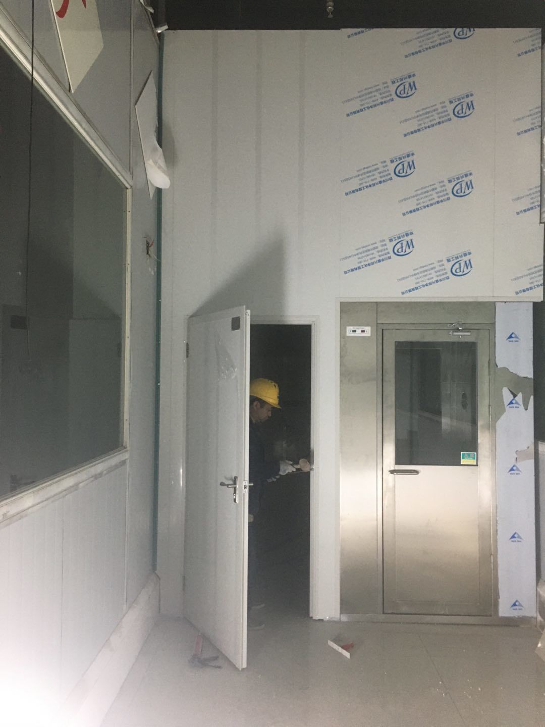 排水溝邊恢復(fù)完成100%;土建原有柱子瓷磚破碎恢復(fù)95%;彩鋼墻板完成100%;原有土建墻開門洞及恢復(fù)完成100%;門、窗完成100%;水、電完成40%;收尾完成量,撕膜、打密封膠、完成55%。