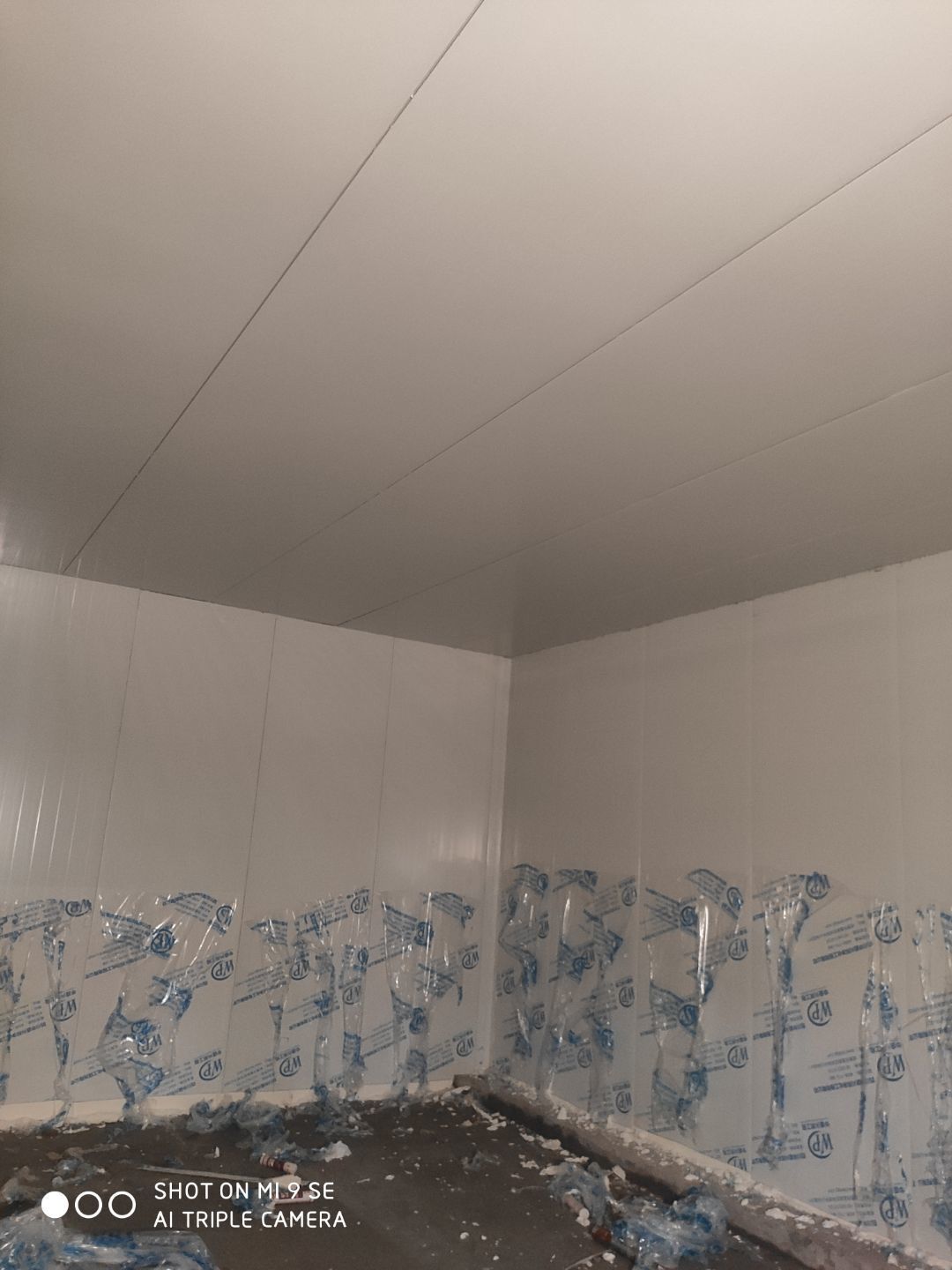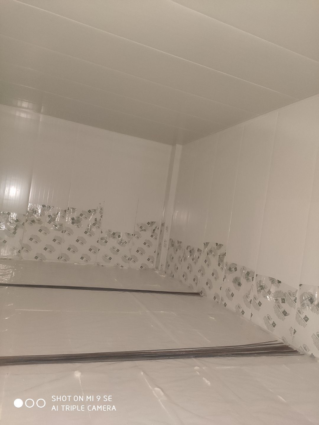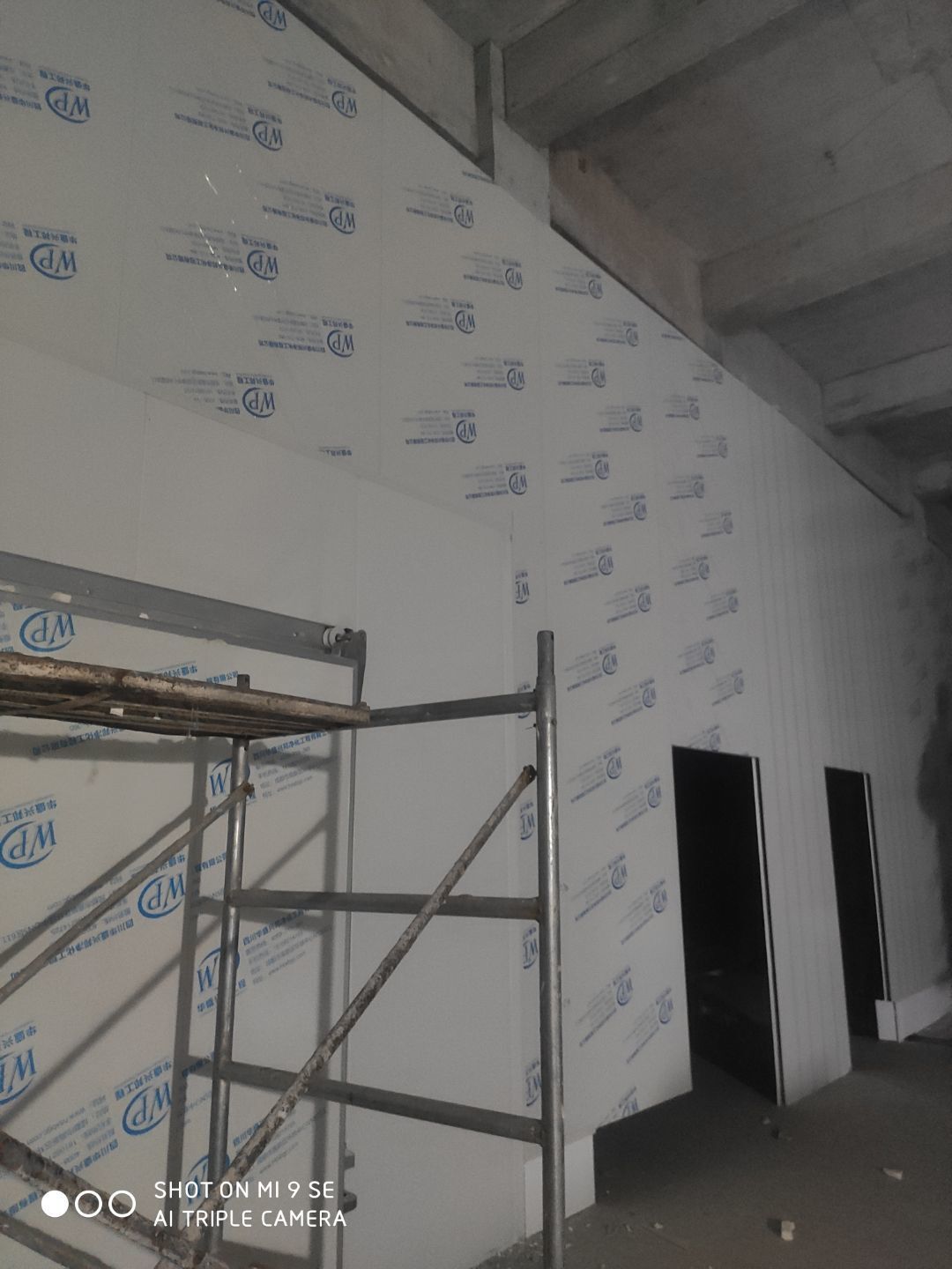 墻板頂板完成百分之九十 凍庫設(shè)備安裝完成 車間水電安裝已經(jīng)開始 乳膠漆進場