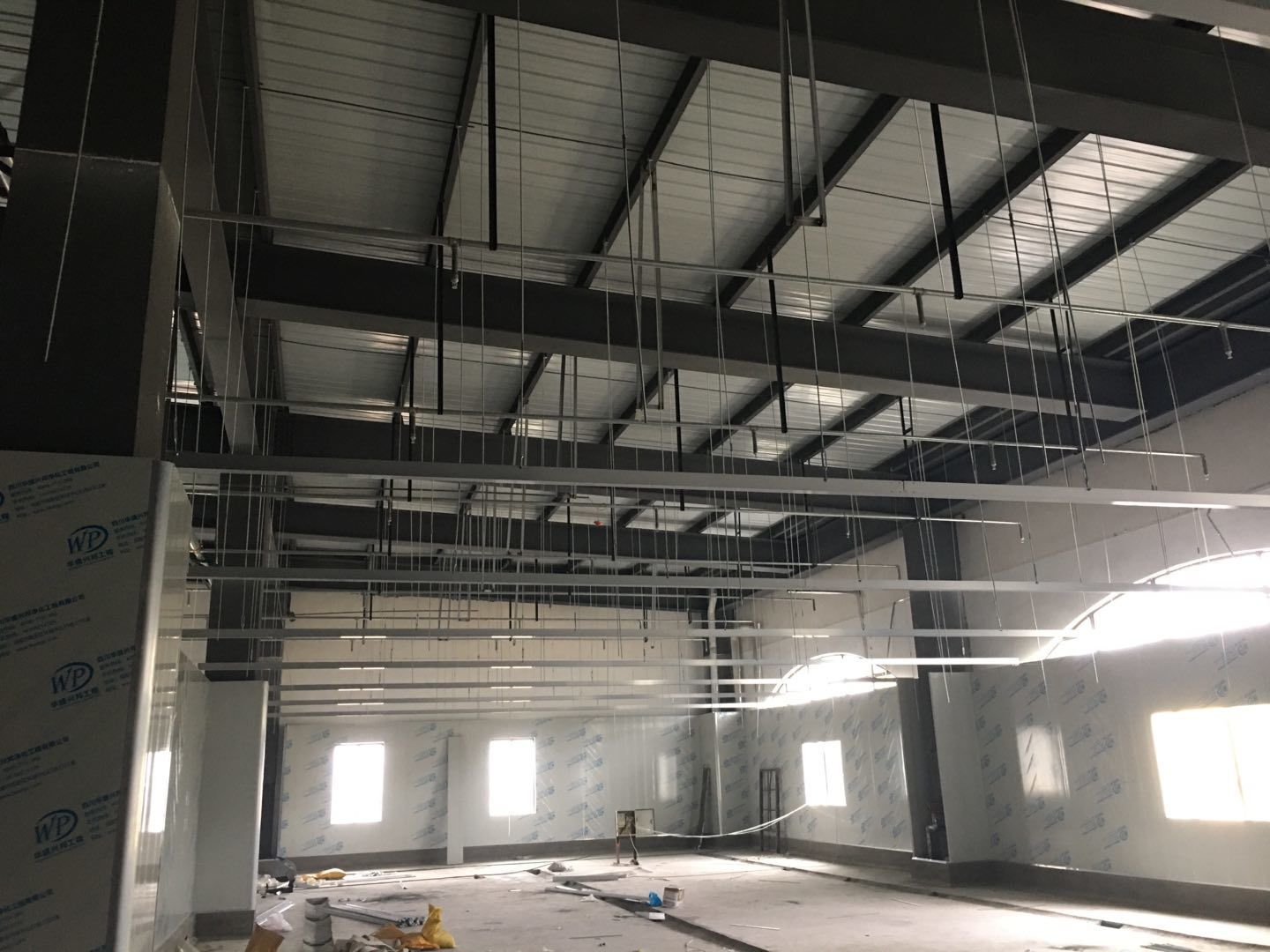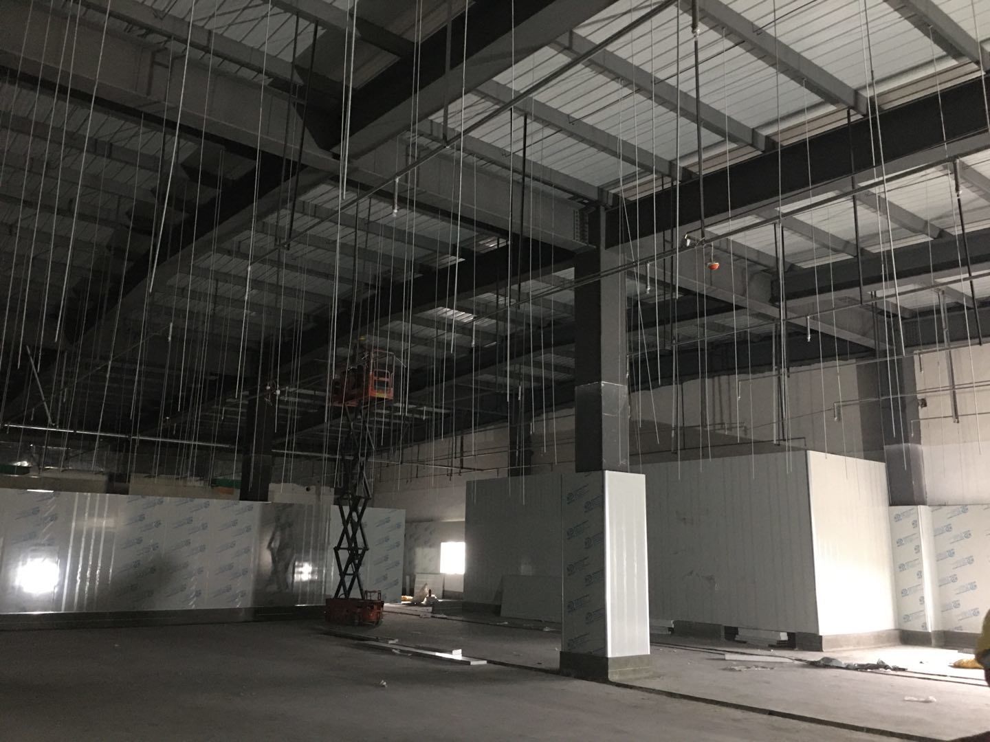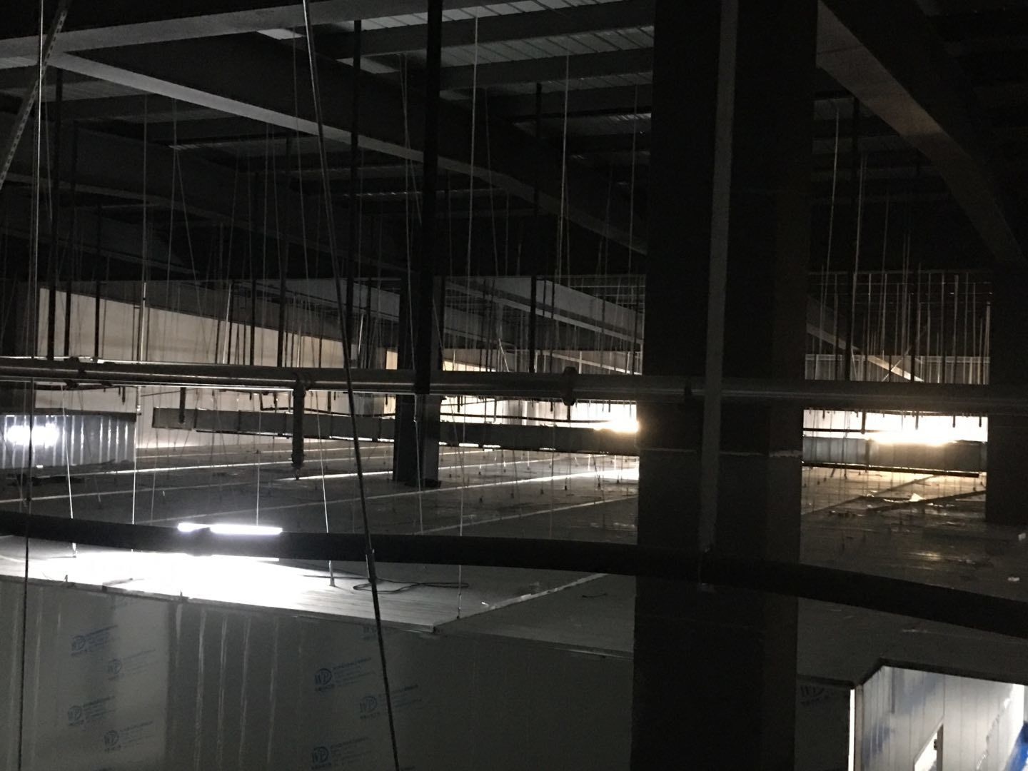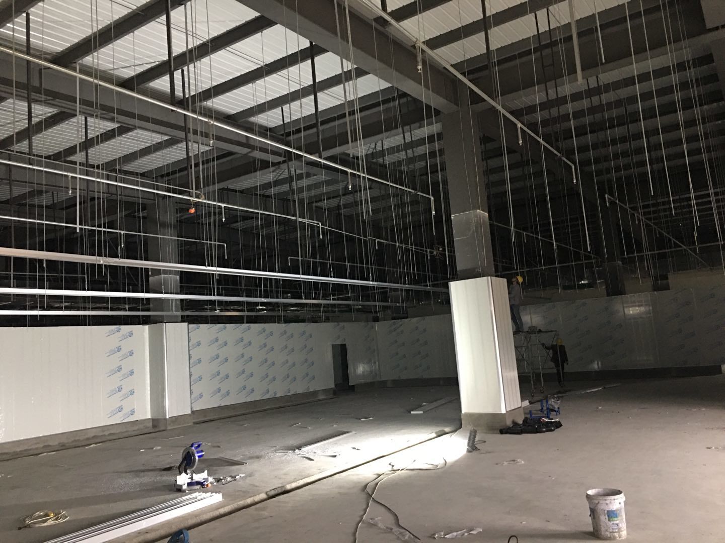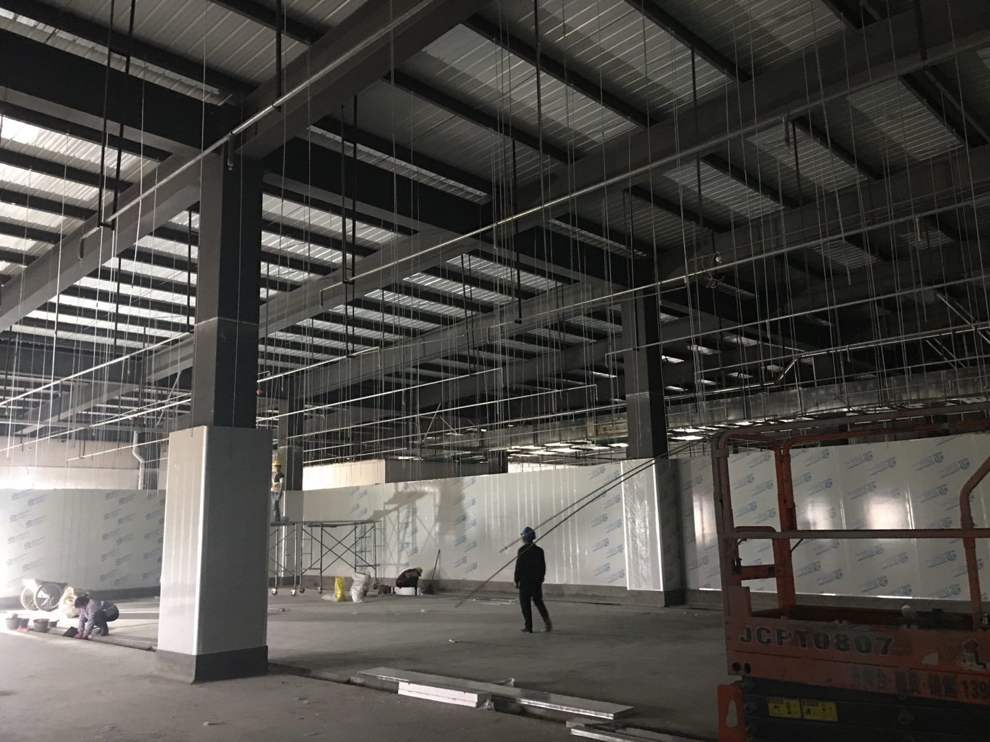 1.簽證彩板內(nèi)包材庫未封頂,門窗已投合,明日開始全面開預留孔2.空調(diào)班組、風盤絲桿支架固定,管道布置焊接。3.水電班組-燈具安裝,配線配管。全部燈具安裝完成。