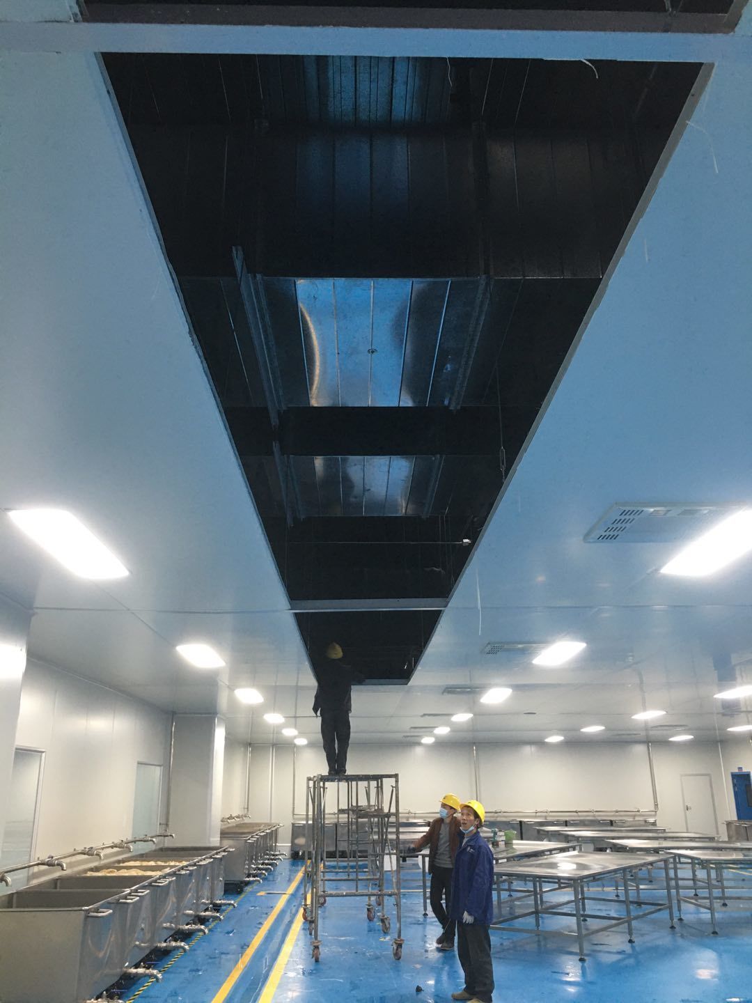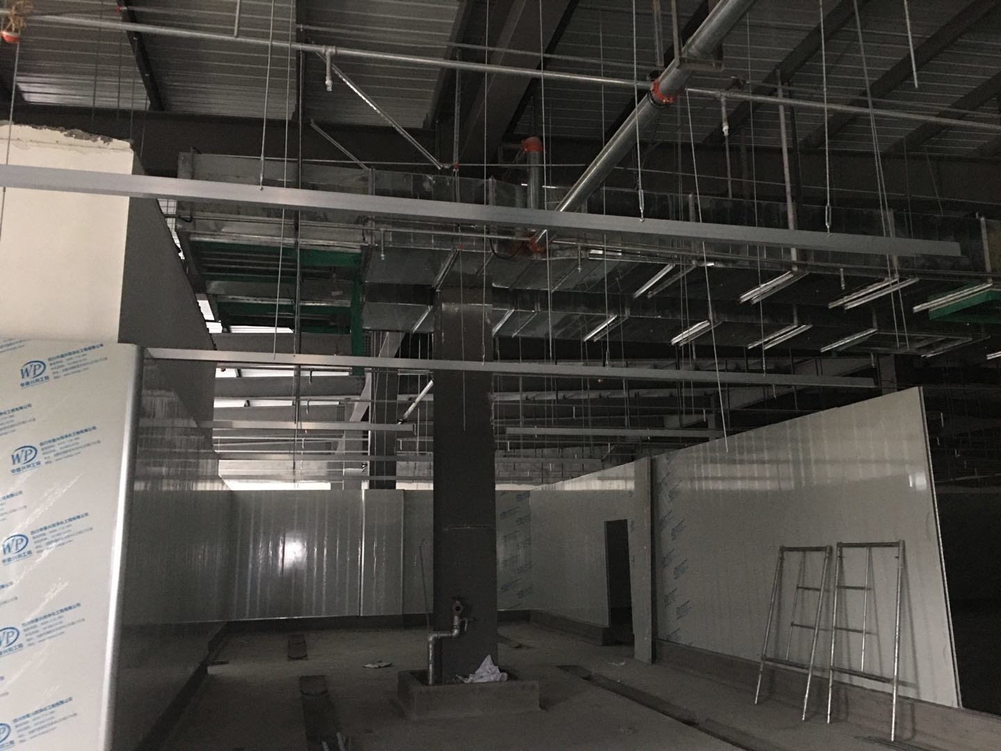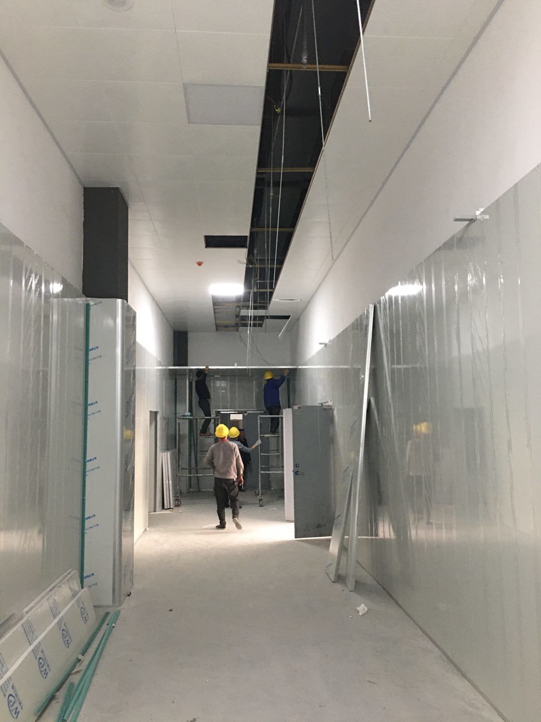 1:彩板班組~收尾工作進度50%左右。2:空調(diào)班組~主要設(shè)備及風道均已吊裝完成。剩余工作:主機配管,配線調(diào)試,安裝風口。3:水電班組-空調(diào)電源配線完成約35%,剩余工作:動力電施工,吊頂?shù)浇o水點位的不銹鋼管施工,配電箱安裝調(diào)試。