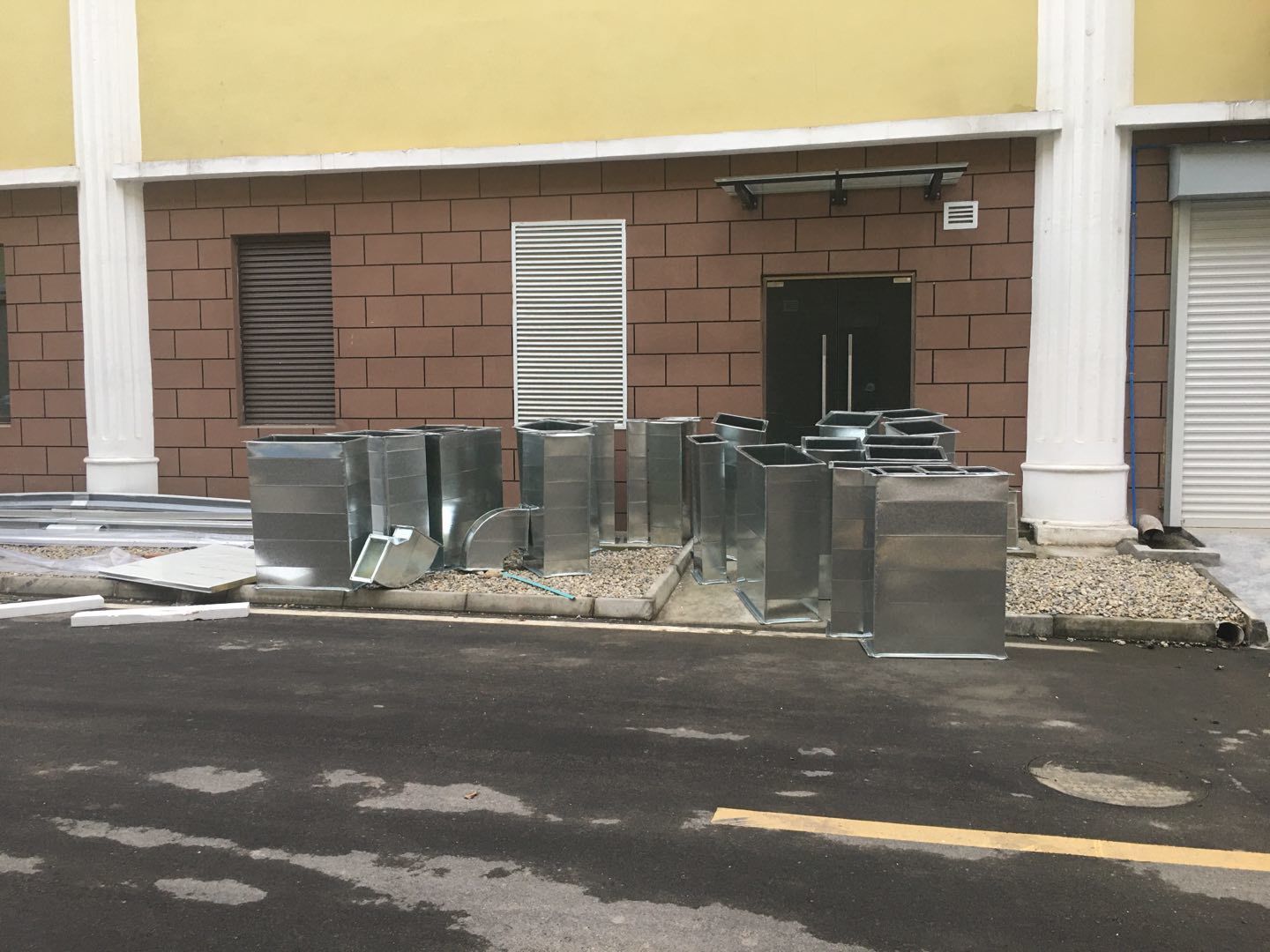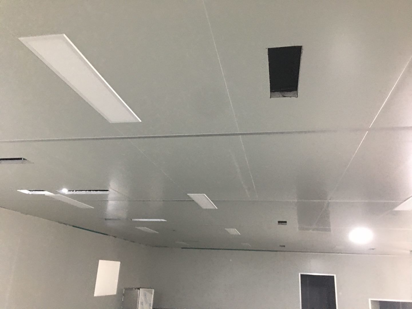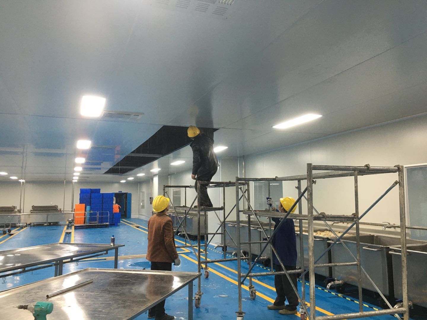 1:彩板班組~收尾工作進度50%左右。2:空調(diào)班組~主要設(shè)備及風道均已吊裝完成。剩余工作:主機配管,配線調(diào)試,安裝風口。3:水電班組-空調(diào)電源配線完成約35%,剩余工作:動力電施工,吊頂?shù)浇o水點位的不銹鋼管施工,配電箱安裝調(diào)試。