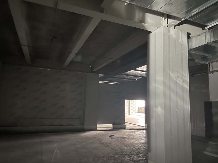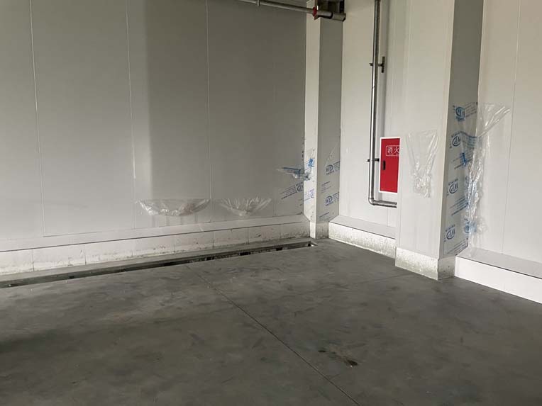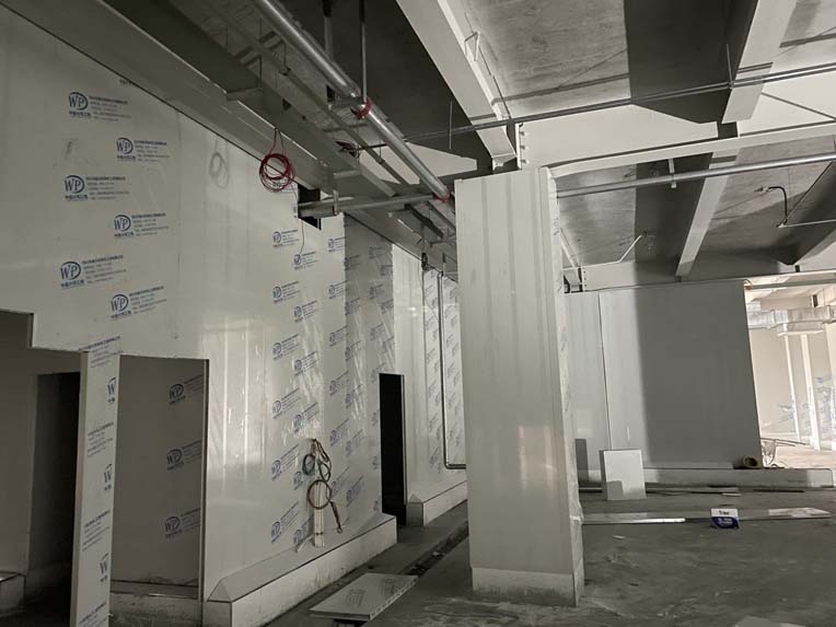 一層彩鋼隔斷完成100%,現(xiàn)貼圓弧、打膠、包柱子。 斜面瓷磚完成60%。