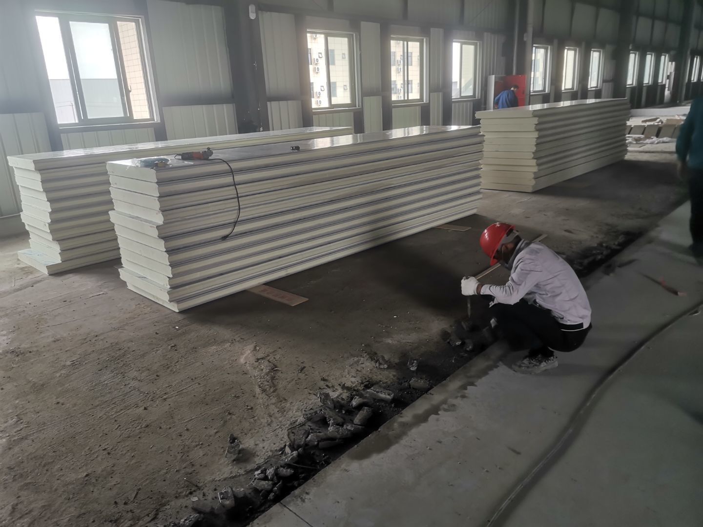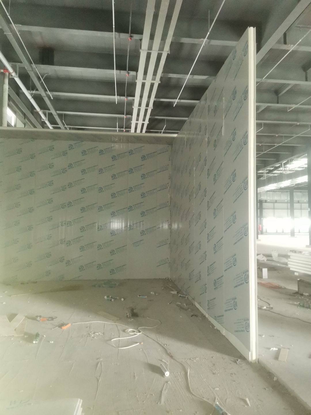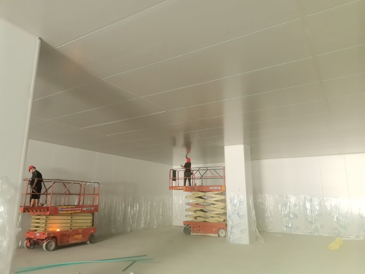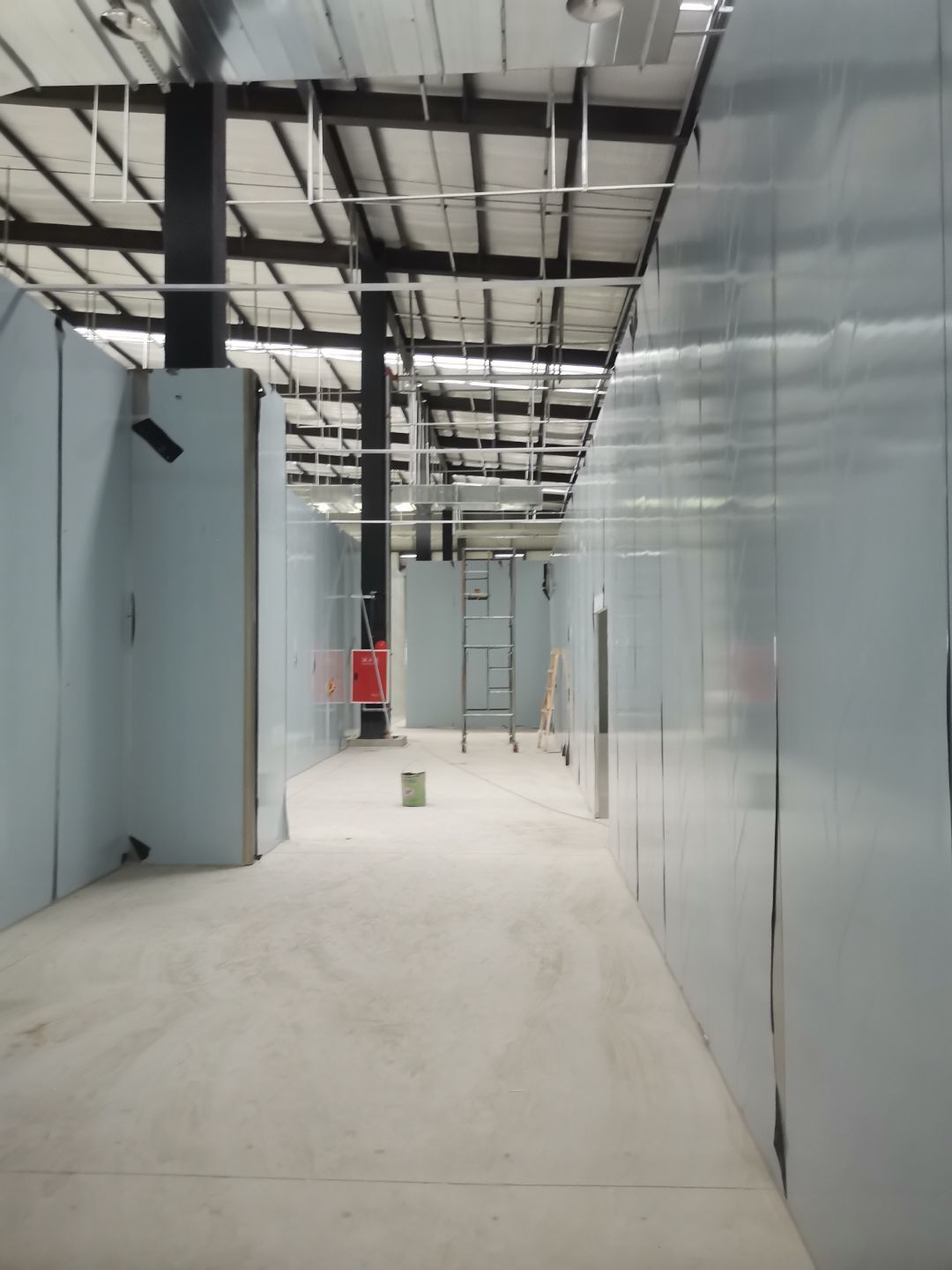 1、擋水墻貼磚完成95%(剩余吊裝口完成后實(shí)施); 2、凍庫(kù)庫(kù)板安裝完成100%,頂板完成100%; 3、低溫庫(kù)加熱絲安裝完成100%,保護(hù)層完成100%,擠塑板完成100%,凍庫(kù)地面混凝土澆筑完成100%,切縫完成,養(yǎng)護(hù); 3、彩鋼板安裝完成85%; 4、頂板安裝完成85%; 5、實(shí)驗(yàn)室墻板頂板完成100%; 6、化驗(yàn)室墻板頂板完成100%; 7、工具間墻板完成100%。