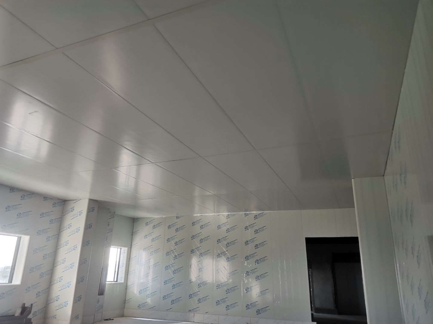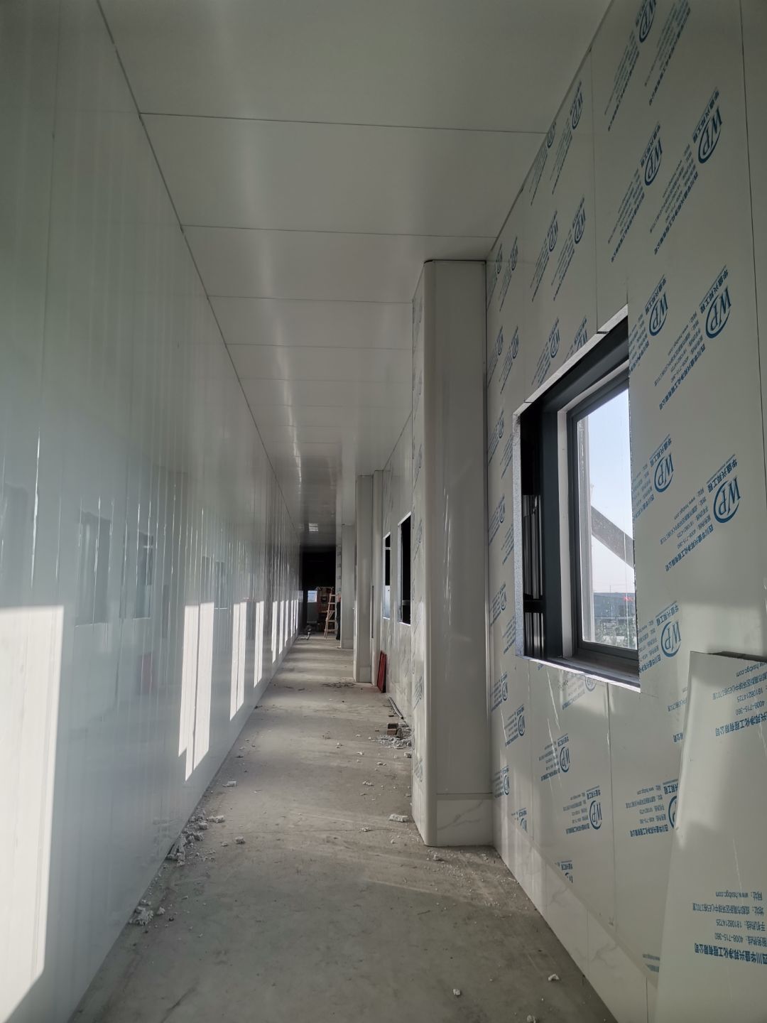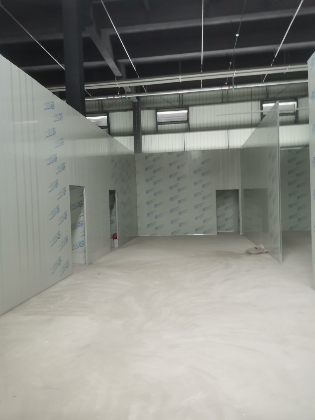 1、擋水墻貼磚完成95%(剩余吊裝口完成后實(shí)施); 2、凍庫(kù)庫(kù)板安裝完成100%,頂板完成100%; 3、低溫庫(kù)加熱絲安裝完成100%,保護(hù)層完成100%,擠塑板完成100%,凍庫(kù)地面混凝土澆筑完成100%,切縫完成,養(yǎng)護(hù); 3、彩鋼板安裝完成85%; 4、頂板安裝完成85%; 5、實(shí)驗(yàn)室墻板頂板完成100%; 6、化驗(yàn)室墻板頂板完成100%; 7、工具間墻板完成100%。