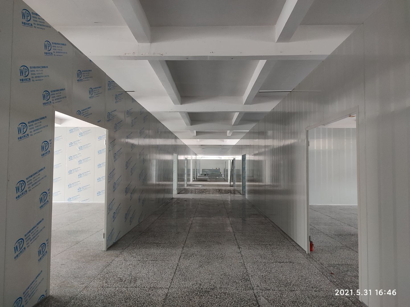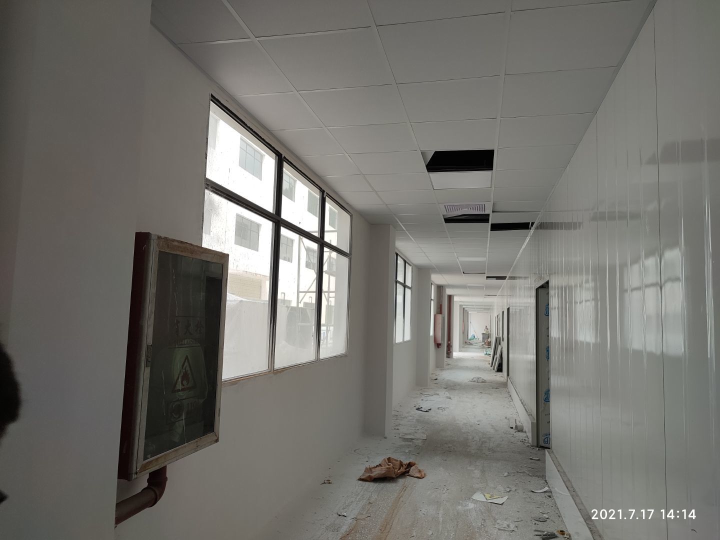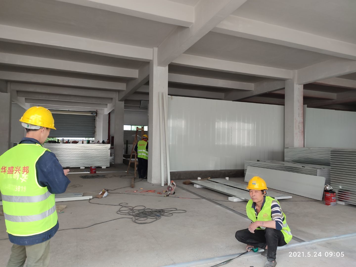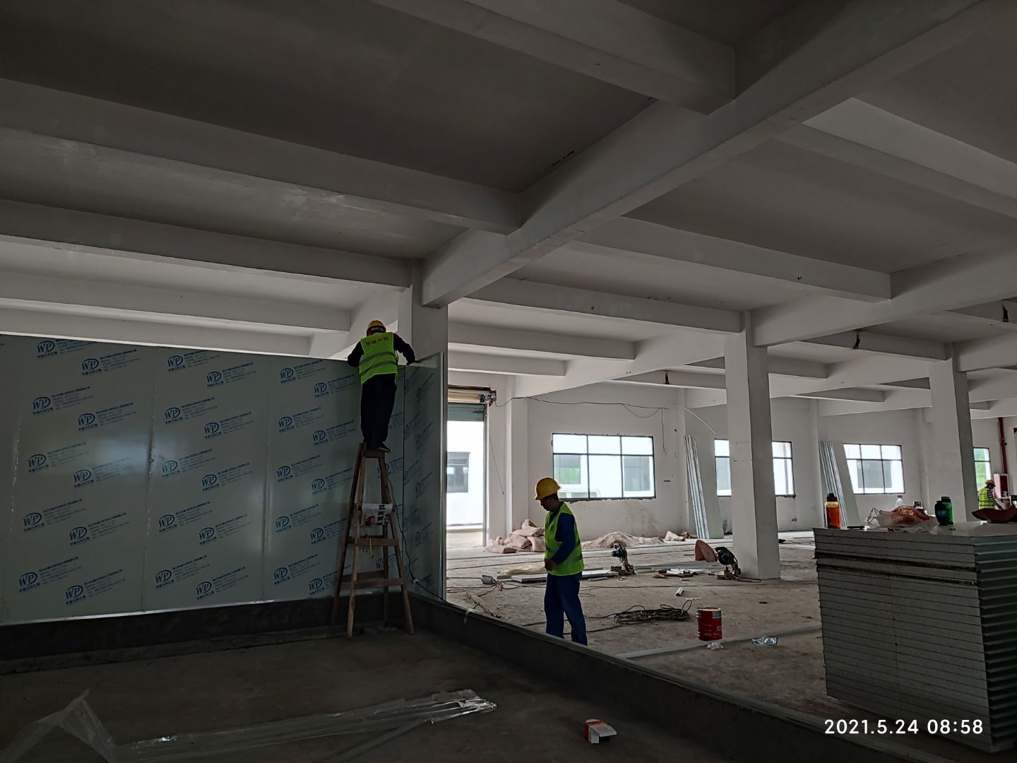 1.頂板撕膜打膠完成35% 2.彩鋼板區(qū)域換氣扇安裝完成70% 3.門鎖安裝完成70%