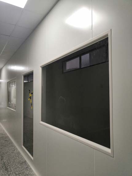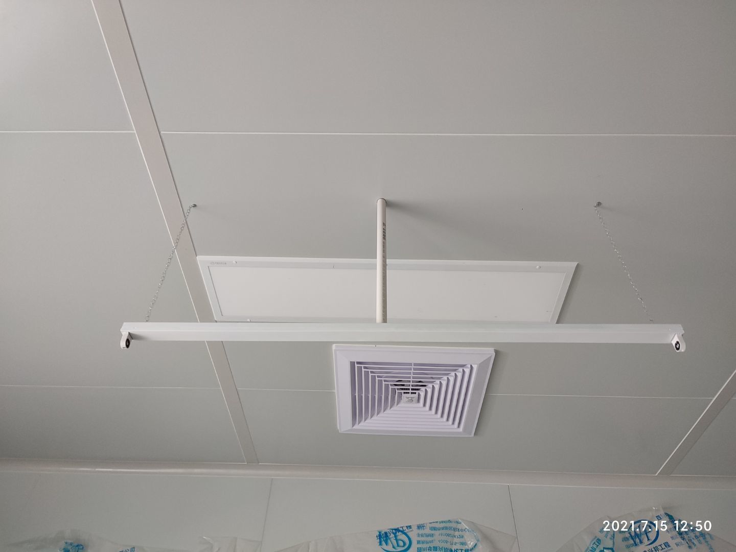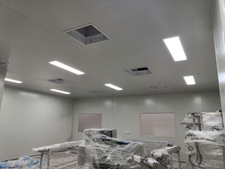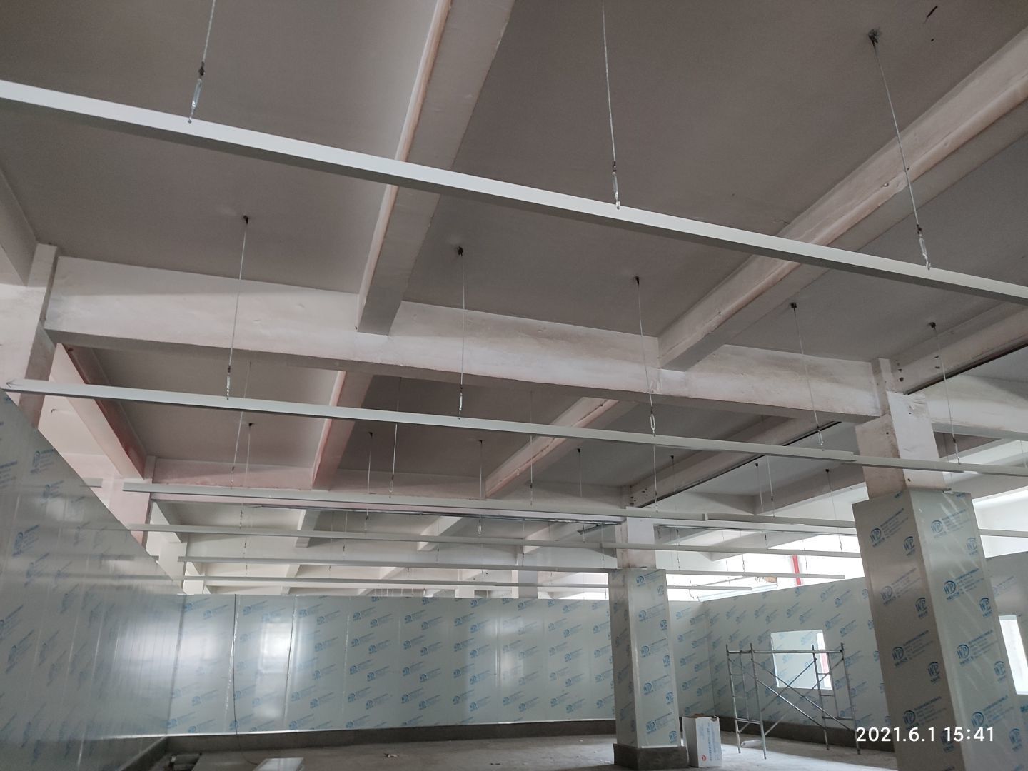 1.彩鋼板頂板完成65% 2.電氣穿管布線完成35%,燈具安裝完成30% 3.圓弧完成15% 4.高效送風(fēng)口開洞完成50%